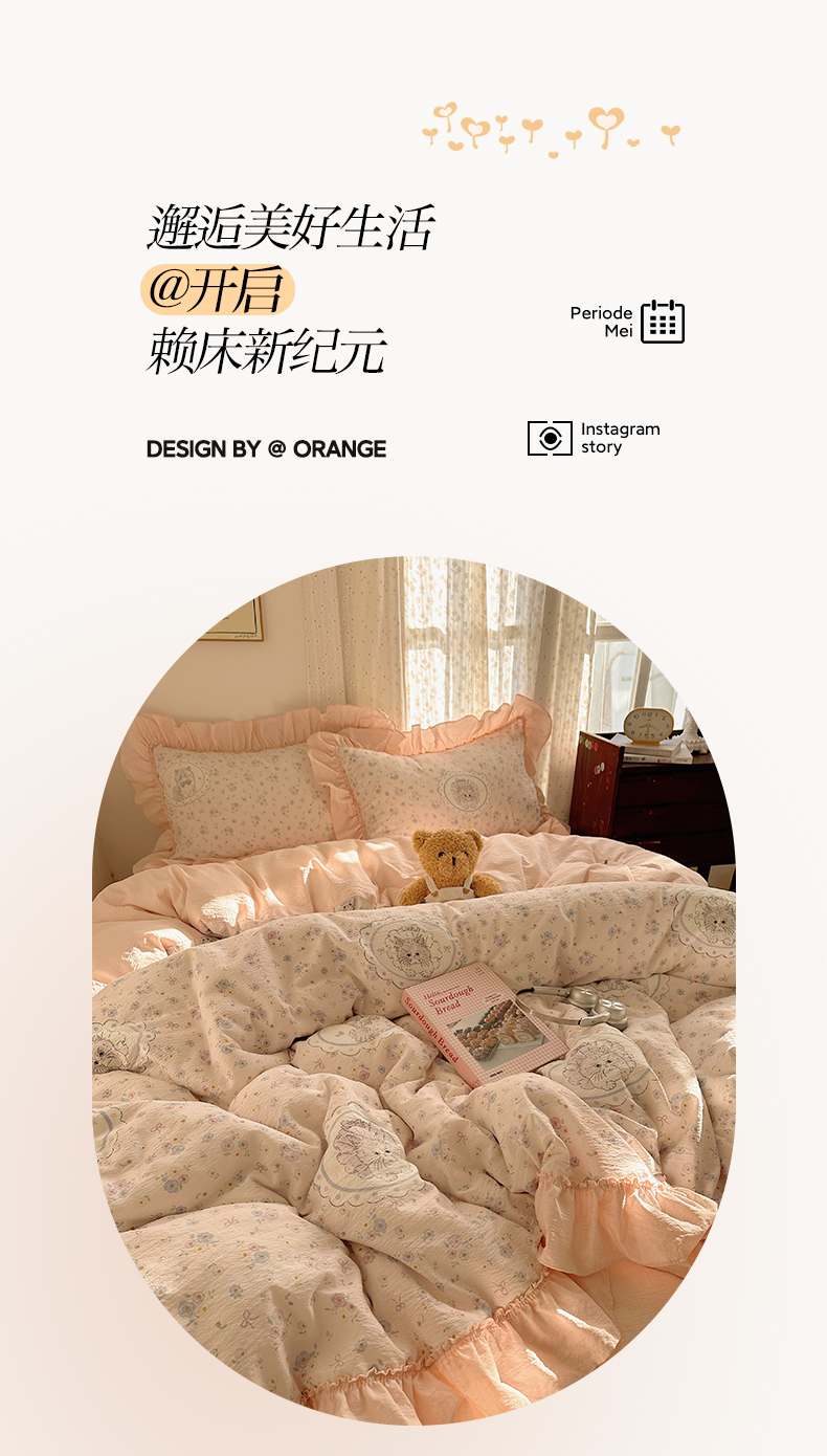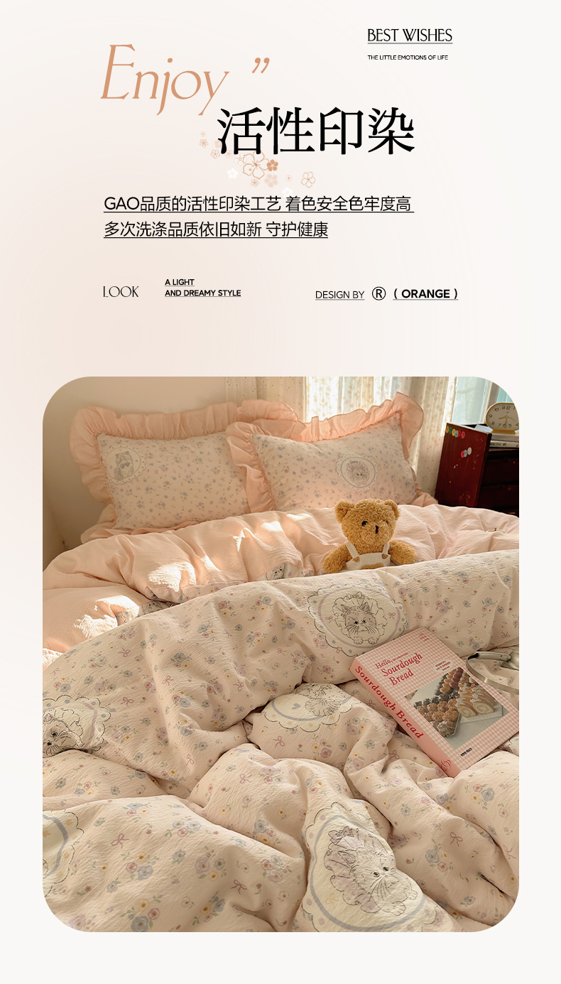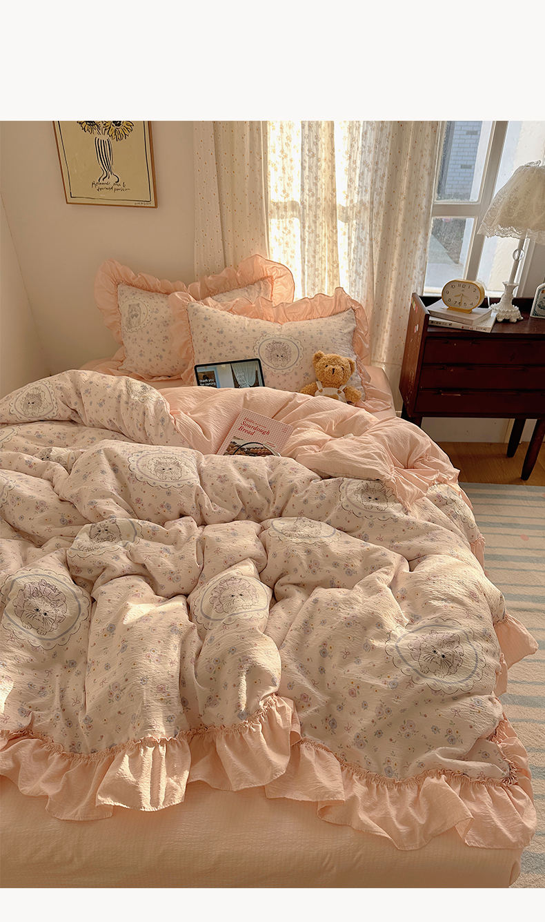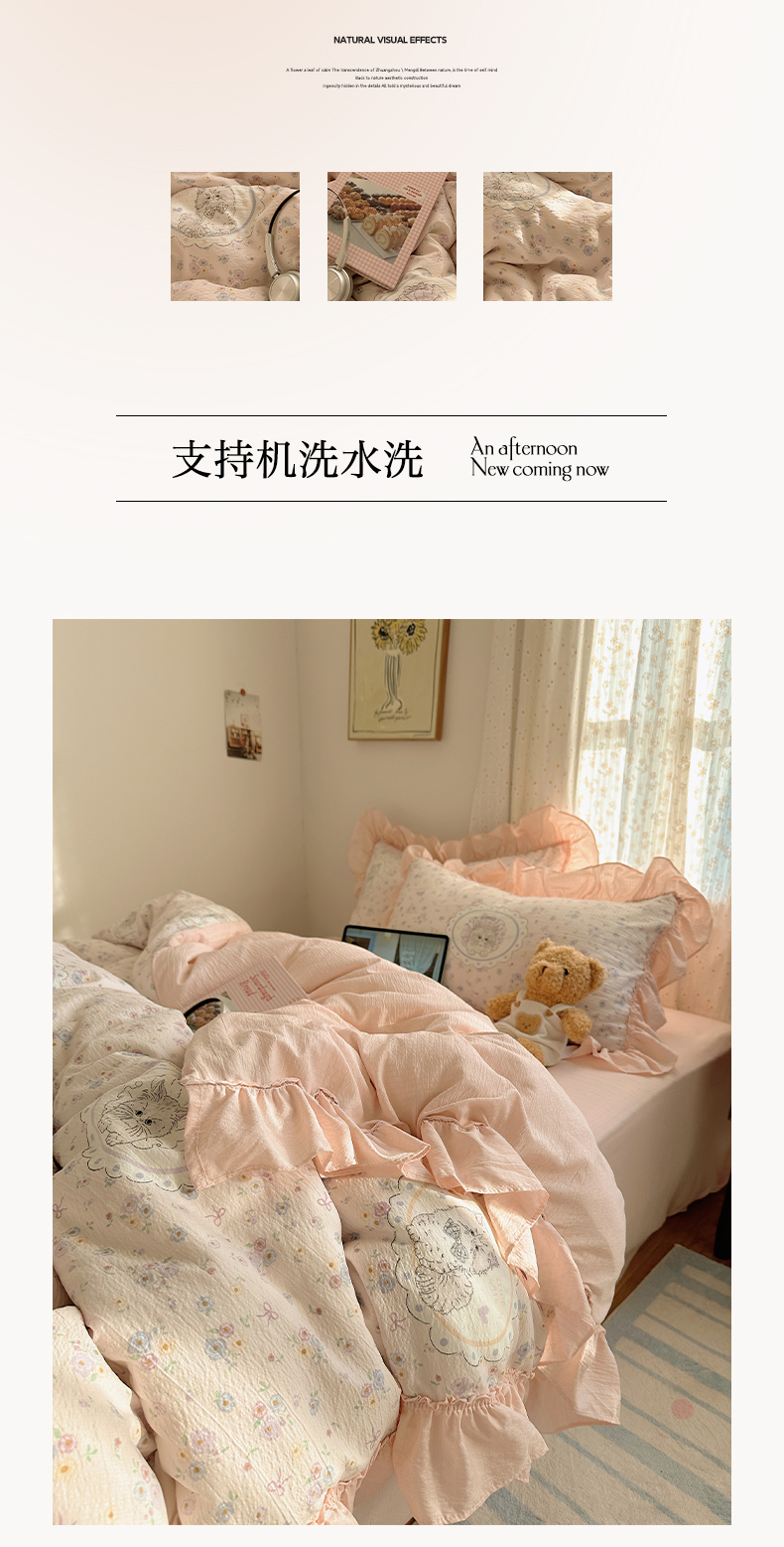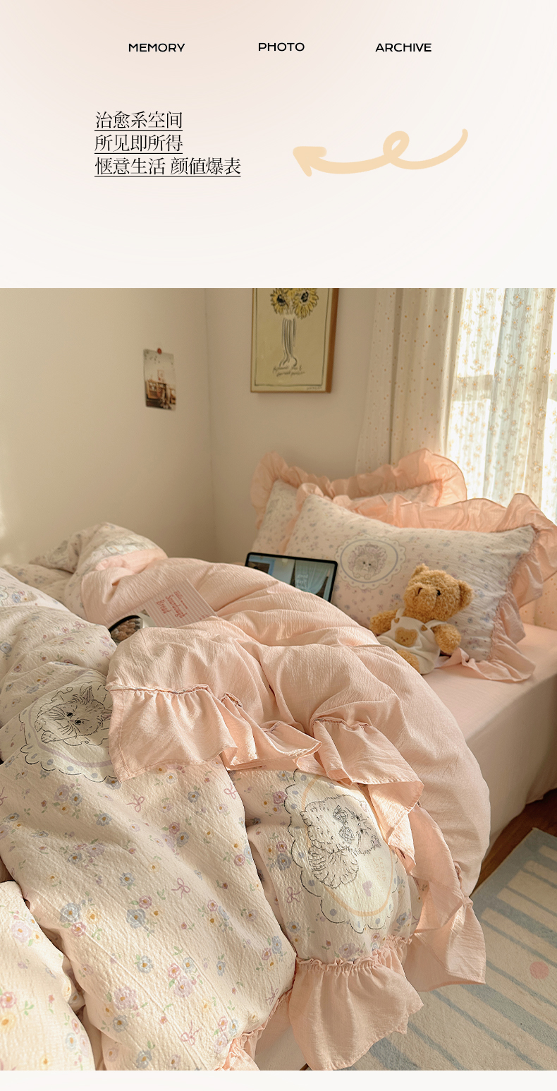 商品名称:美乐迪家纺 2026新款法式云感双层纱花边四件套 花园小猫