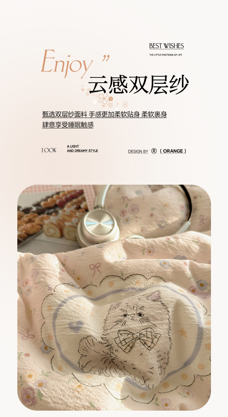 美乐迪家纺 2026新款法式云感双层纱花边四件套 花园小猫