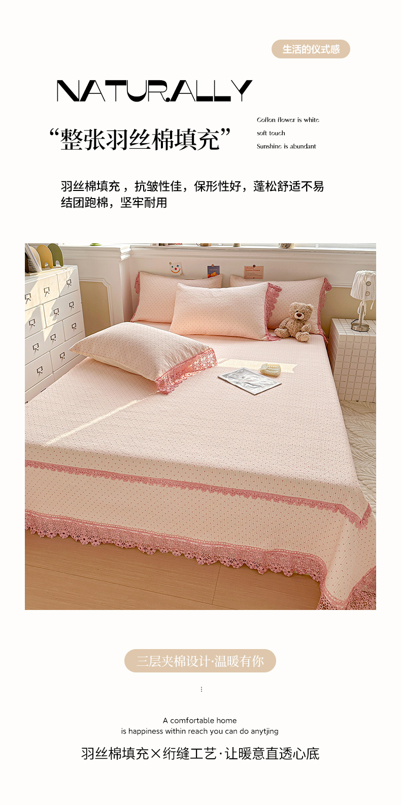 栩裕纺织 2026新款全棉双层纱梅花边床盖 波点-粉色