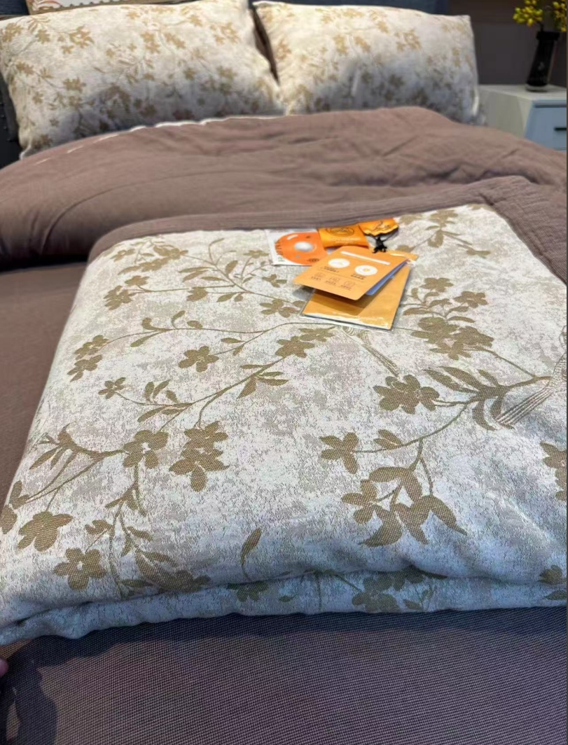 商品名称:双层纱家居 2025新款AB版A版棉麻B版全棉纯棉色织提花双层纱四件套20%麻-花季 花季-彩纱金