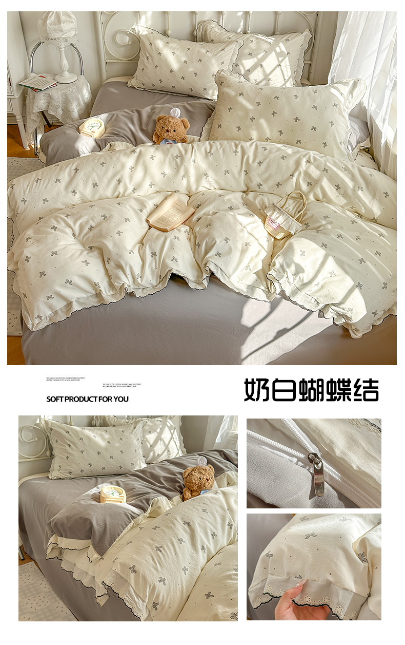 当前位置: 91家纺网 > 商品网购 > 床品套件 > 四件套 > 水洗棉四件套 > 晚爱家纺(原晚安家居) 2026春夏新款古法水洗棉复古法式花边四件套少女公主风 奶白蝴蝶结
