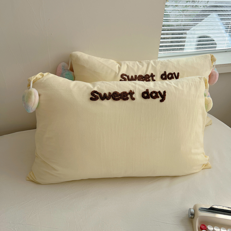 丽涵家纺 2026新款全棉纯棉色织水洗棉单品枕套--爱心兔毛球 甜蜜一天-粉