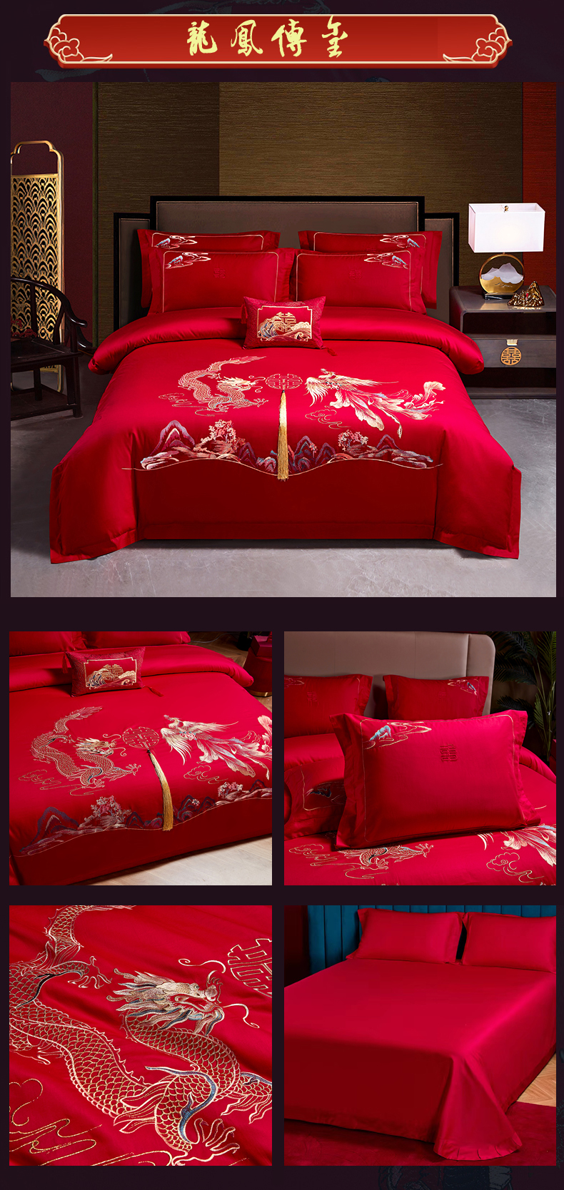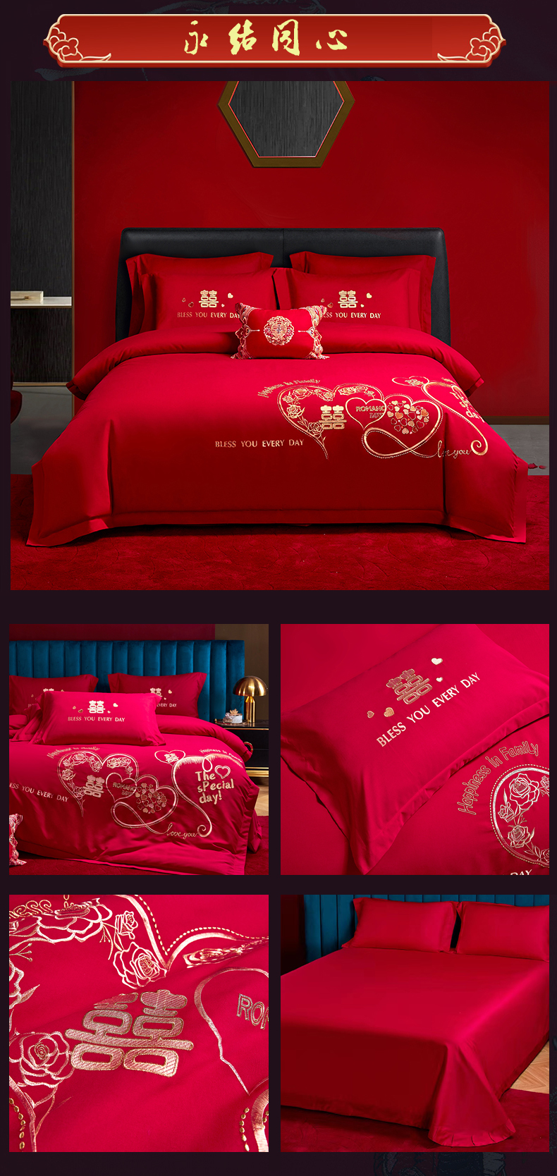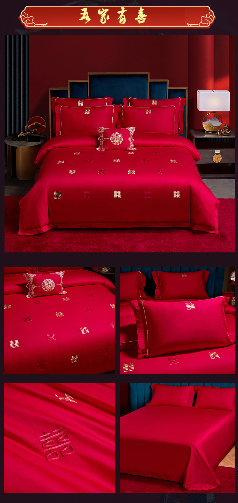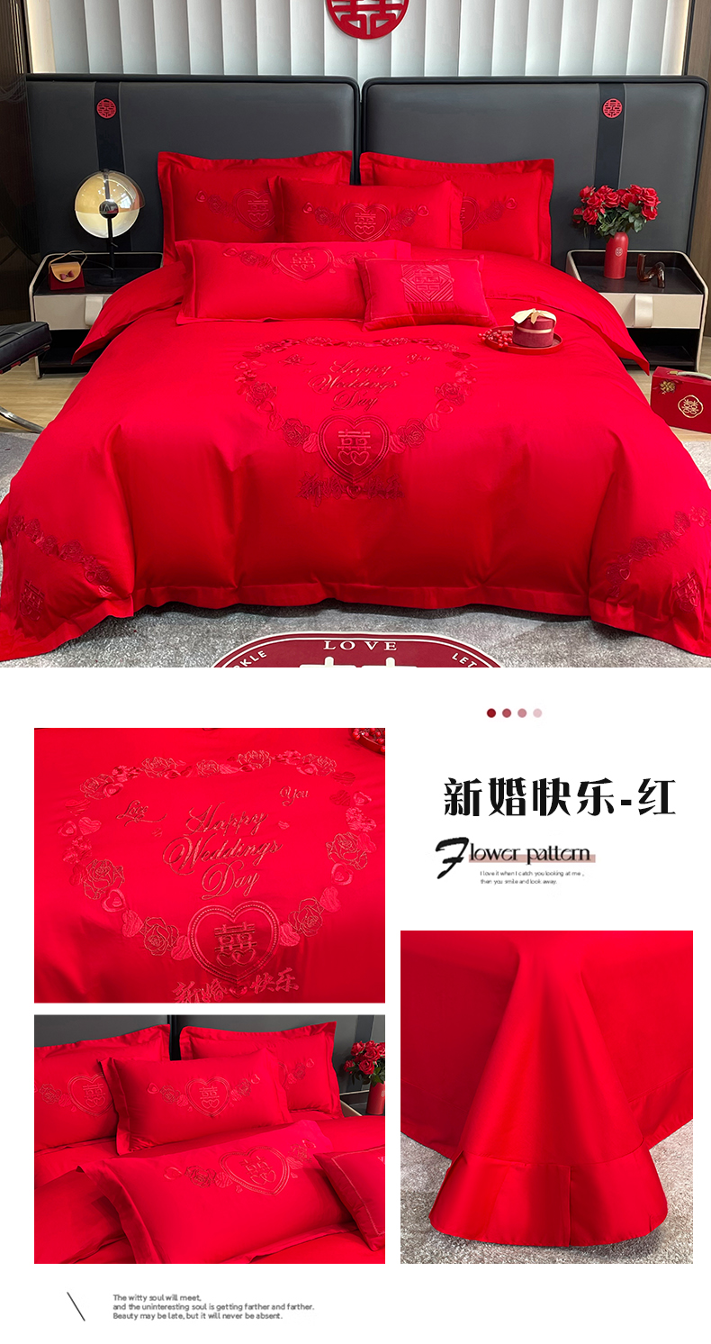 晶缦家纺 2026新款喷气全棉13376纯棉刺绣花婚庆四件套 百年好合