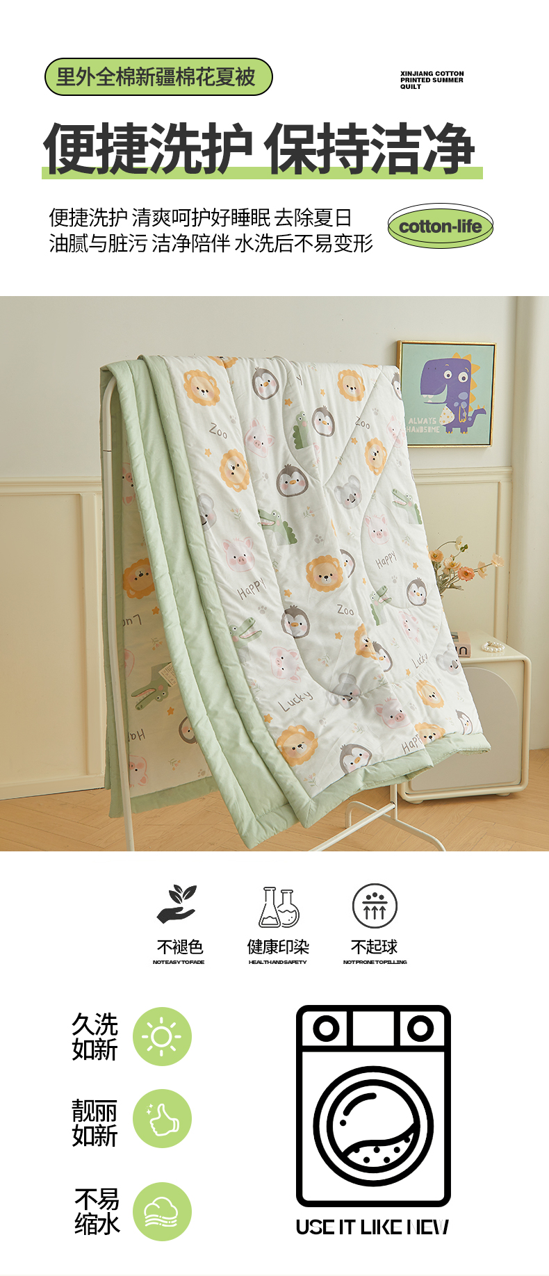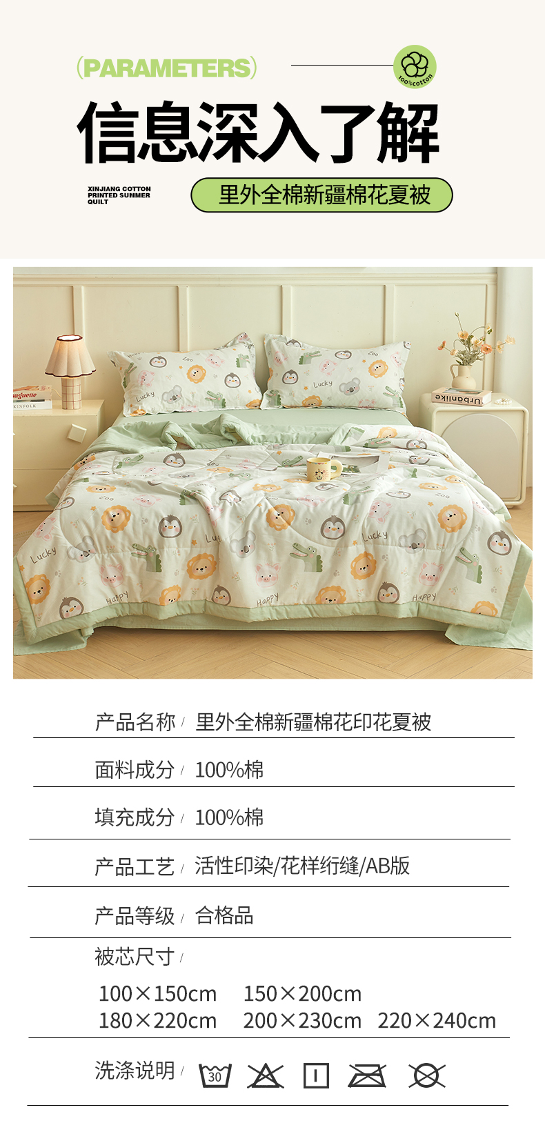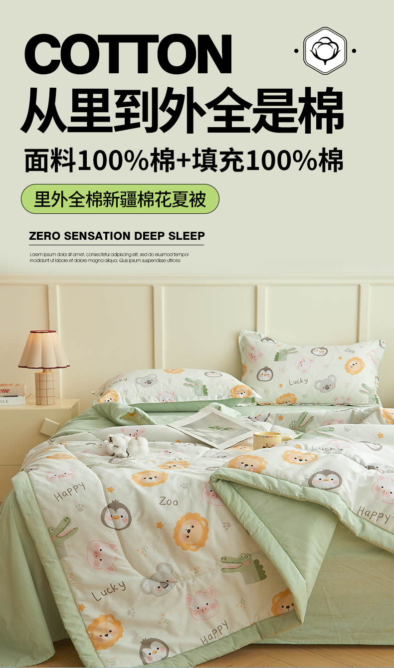 商品名称:西域种棉人·千百笠 2026新款A类里外全棉12868夏凉被100%新疆棉纯棉全棉填充印花款空调被夏被 全棉印花 幸运乐园