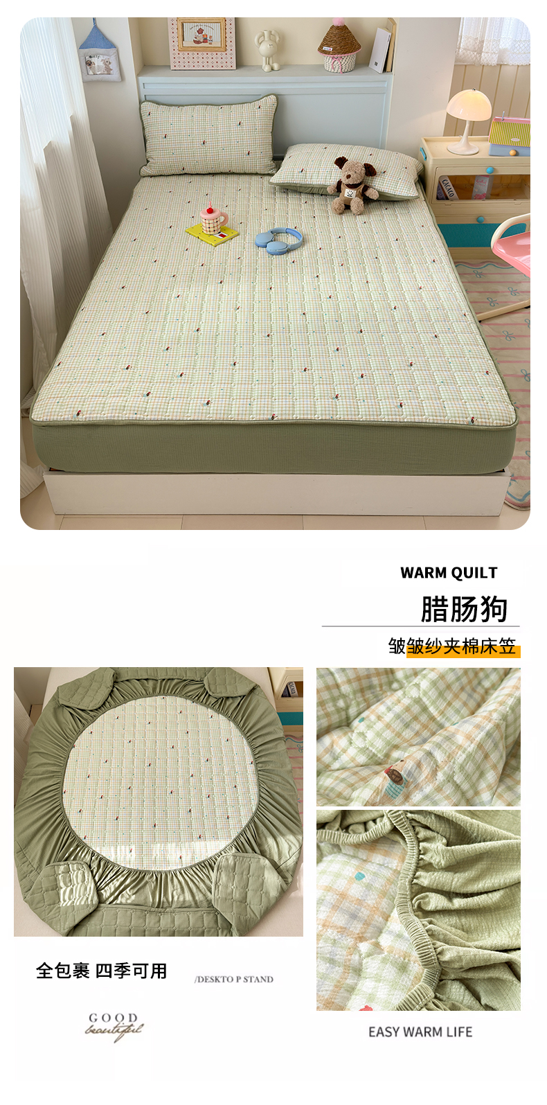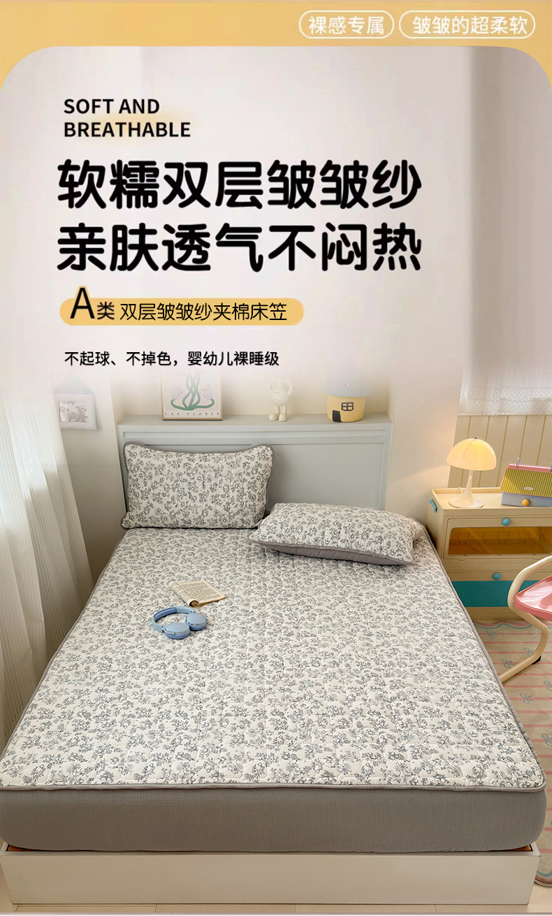 • 91家纺网 家纺一手货源 找家纺 丽美人家纺 2026新款双层皱皱纱大豆夹棉床笠单床笠床笠单件 JM格仔萌宠