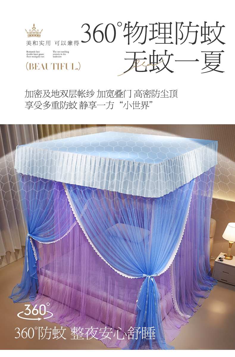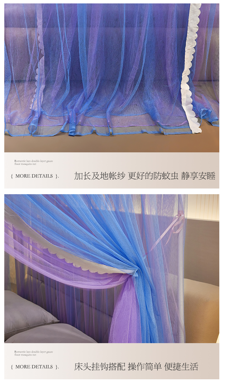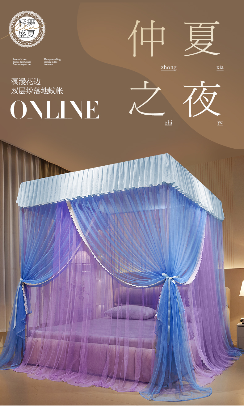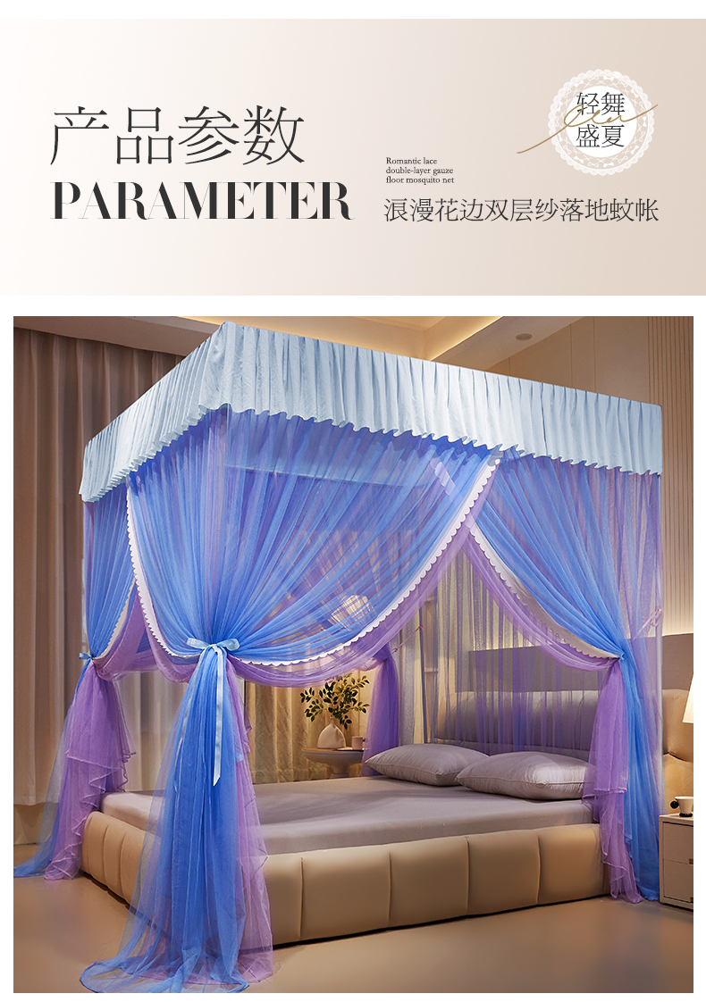 当前位置: 91家纺网 > 商品网购 > 床上用品 > 蚊帐 > 宫廷蚊帐 > 优雅星家纺 2026新款浪漫花边双层纱落地蚊帐-轻舞盛夏 轻舞盛夏 蓝紫
