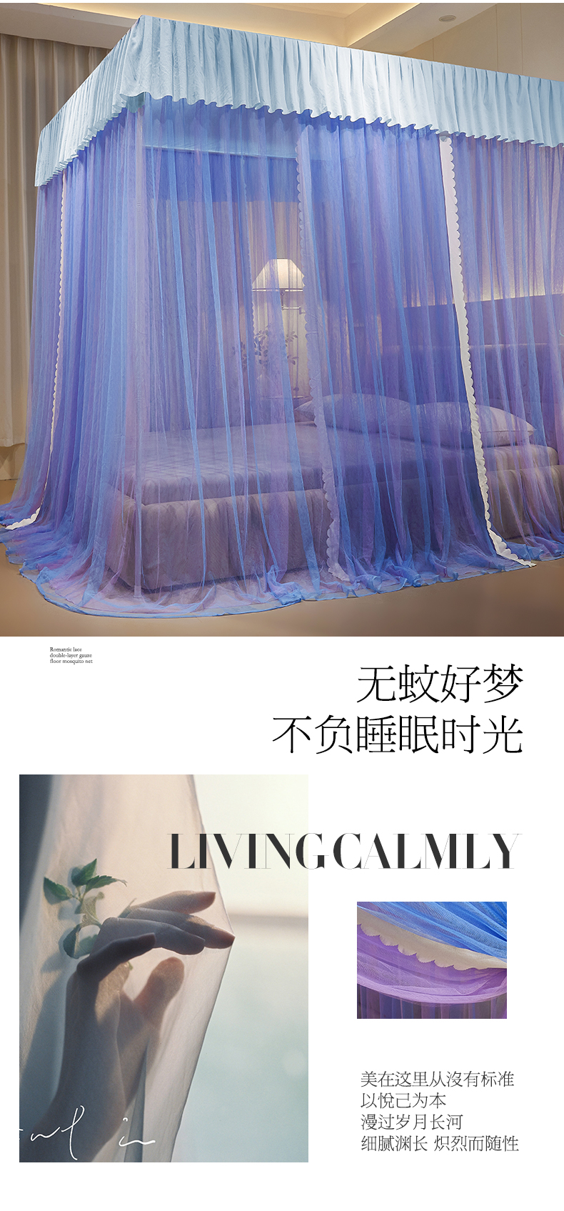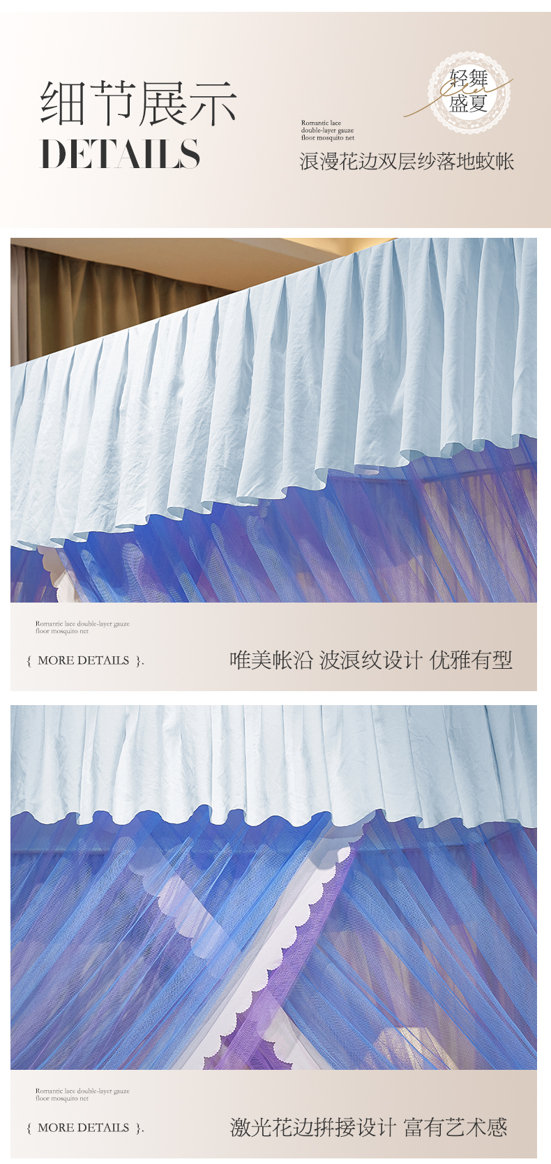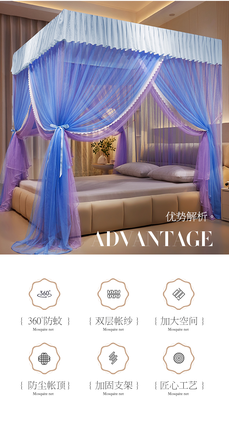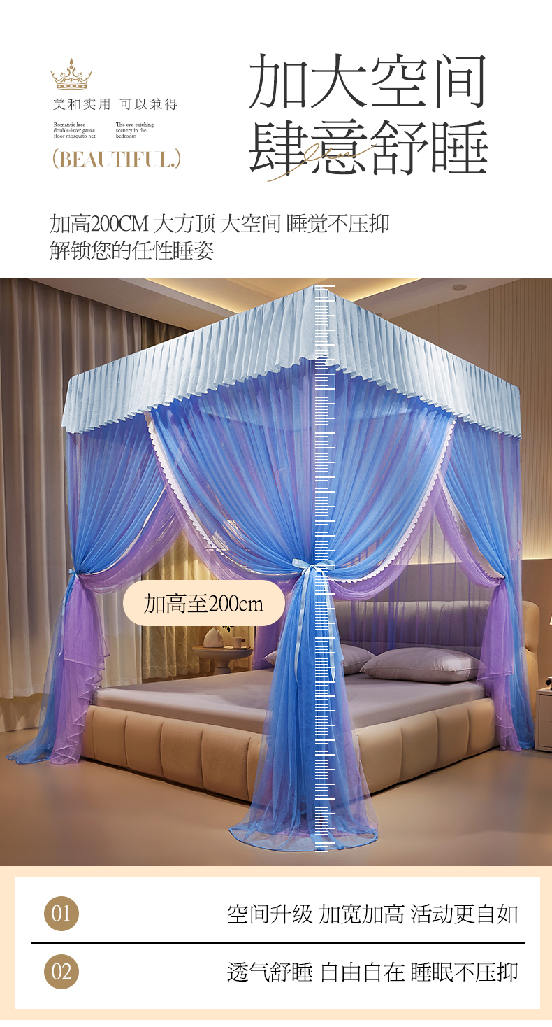 当前位置: 91家纺网 > 商品网购 > 床上用品 > 蚊帐 > 宫廷蚊帐 > 优雅星家纺 2026新款浪漫花边双层纱落地蚊帐-轻舞盛夏 轻舞盛夏 蓝紫