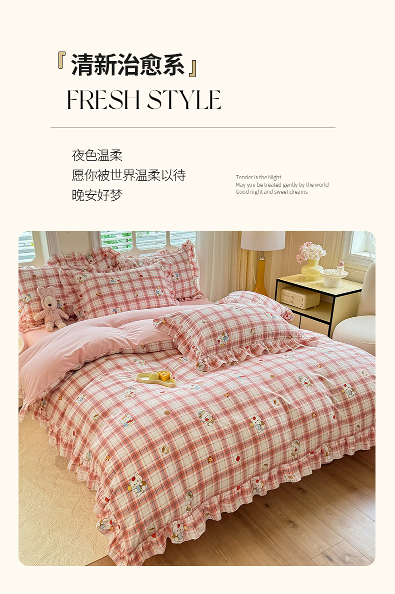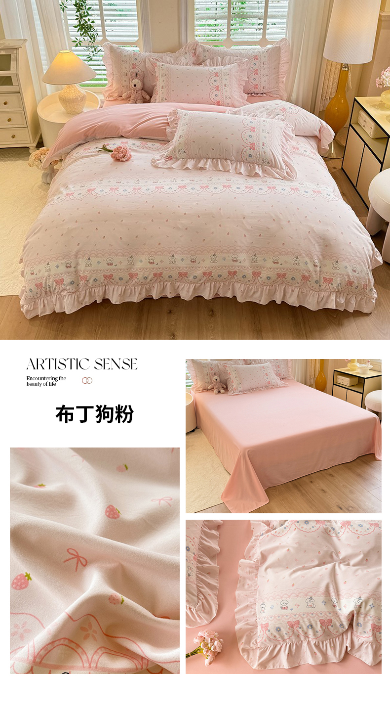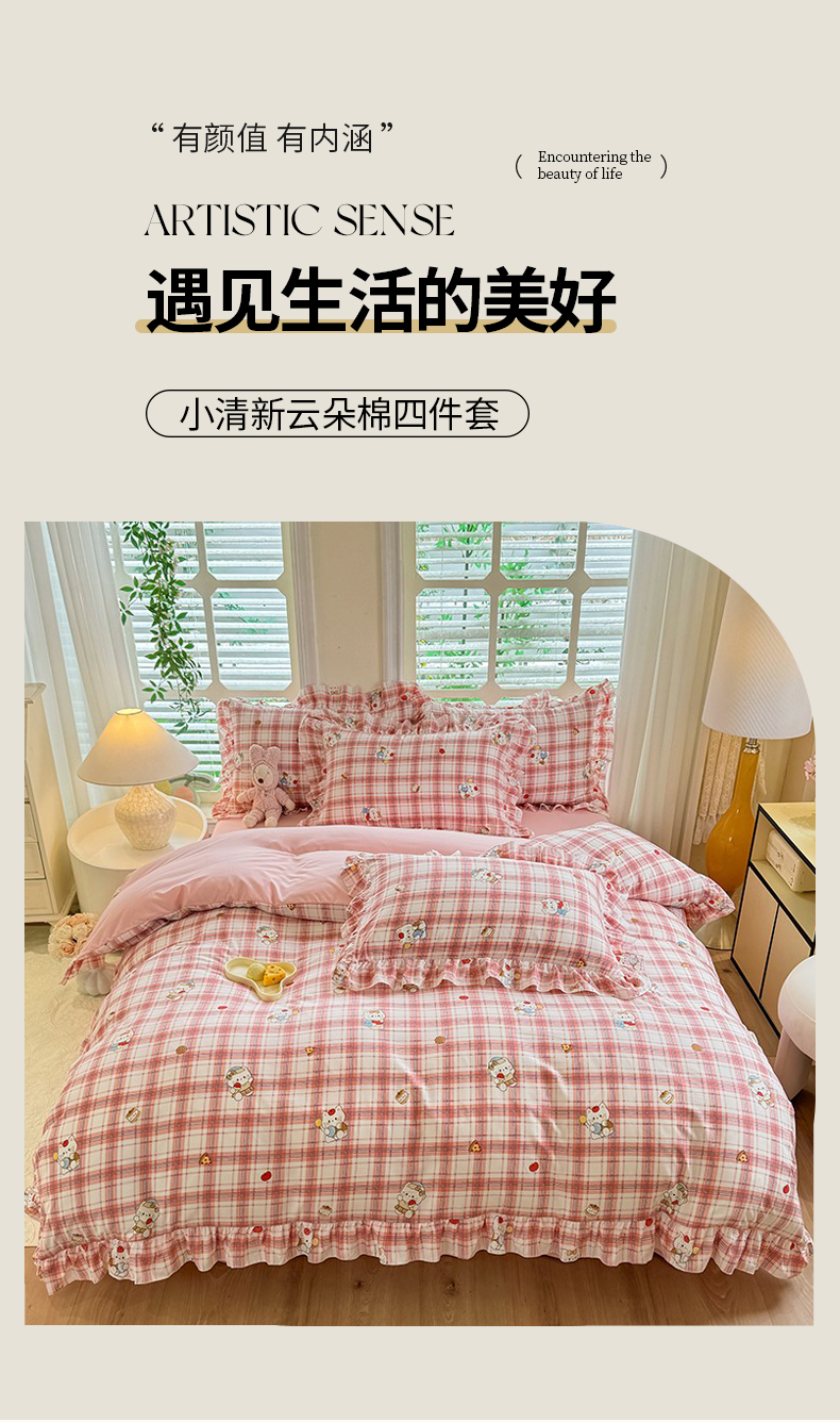 当前位置: 91家纺网 > 商品网购 > 床品套件 > 四件套 > 水洗棉四件套 > 经年 2026新款韩版花边水洗云朵棉四件套 复古K猫粉
