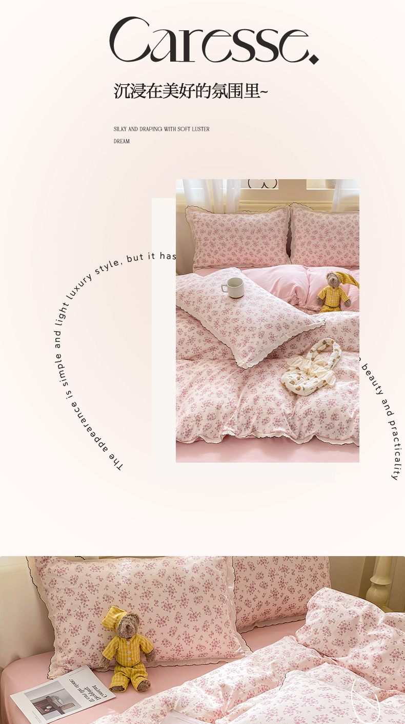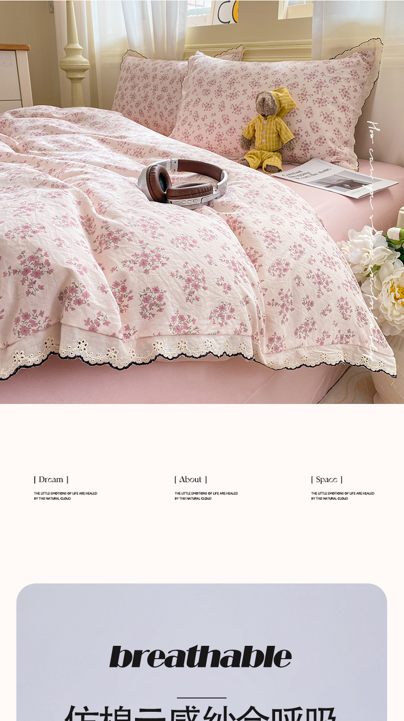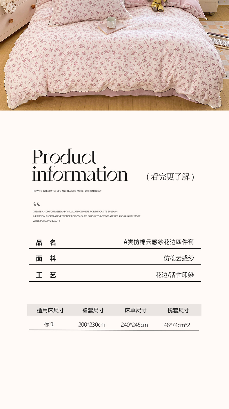 (总)豫见家纺 2026新款A类仿棉云感纱花边四件套,浪漫花叙,梦境之间,芊芊花海,碎花眠语,暗香,草莓多多,春风里,梵高印象,粉豹纹,狗狗家族,蝴蝶梦,琥珀流光,花漫漫,花影如梦,浪漫蔷薇,栗色木马纹,木马乐园,年华,日光漫游,赛琳娜,山茶左岸,线条表情狗,小鱼心事,雨沫蝴蝶结,紫色花野,紫藤花开