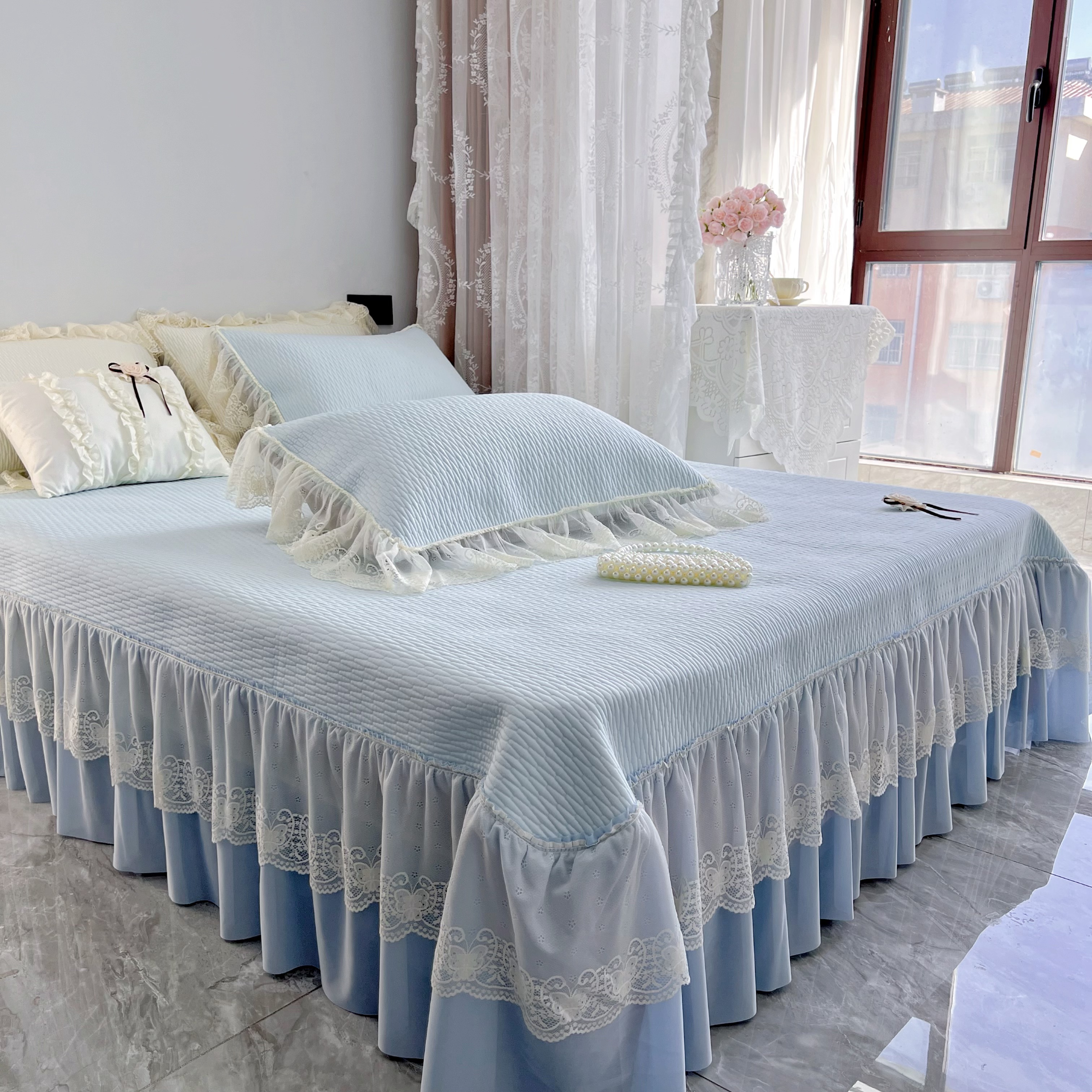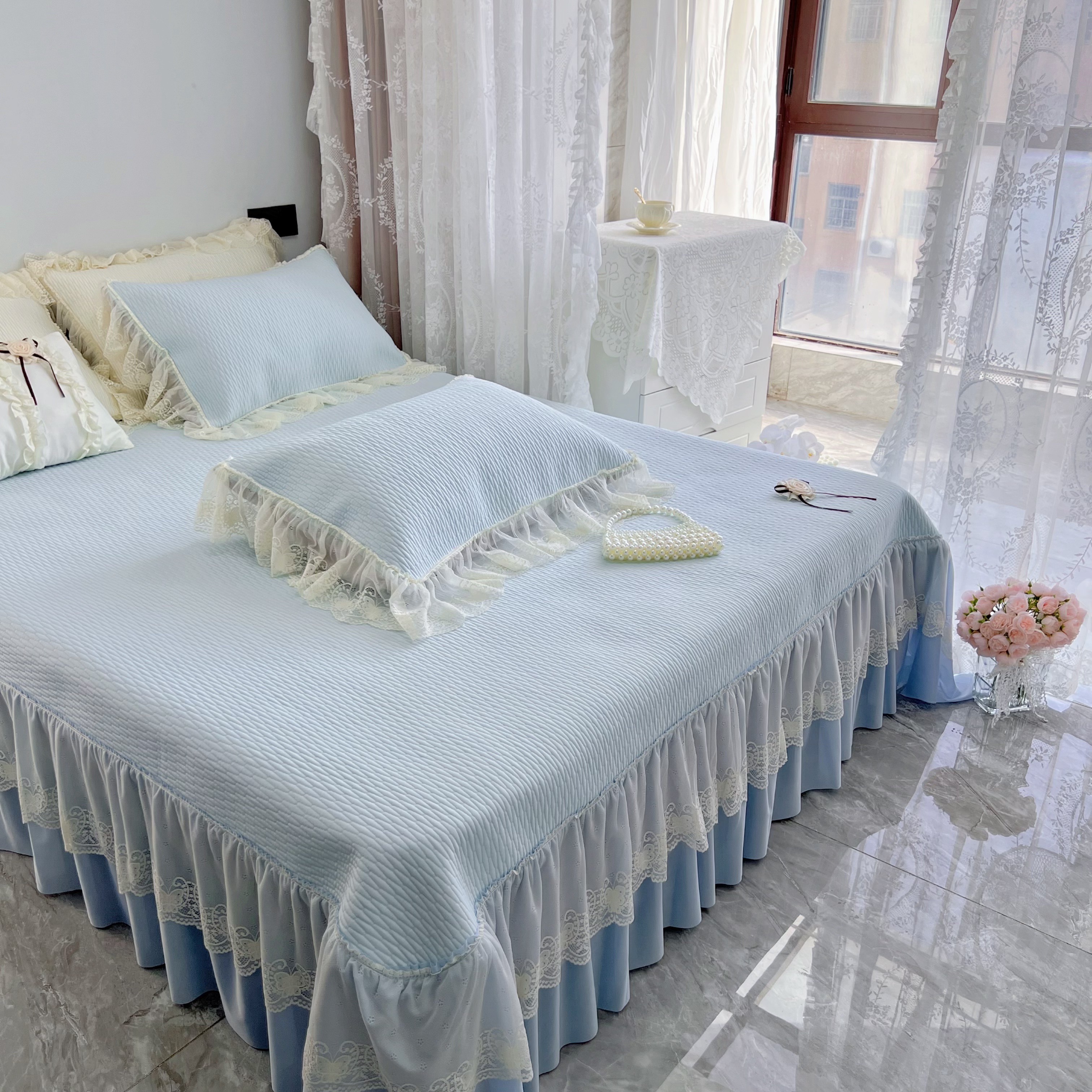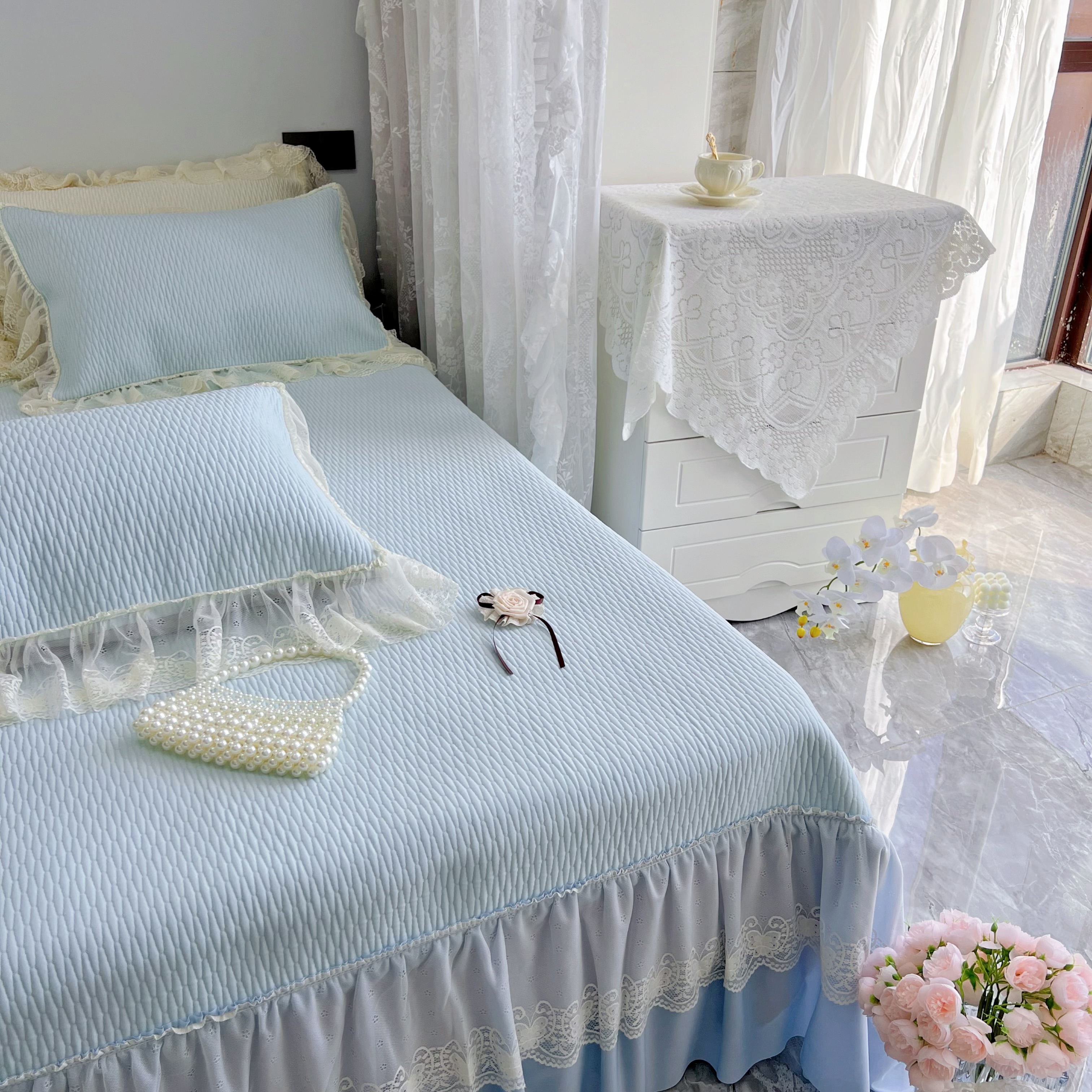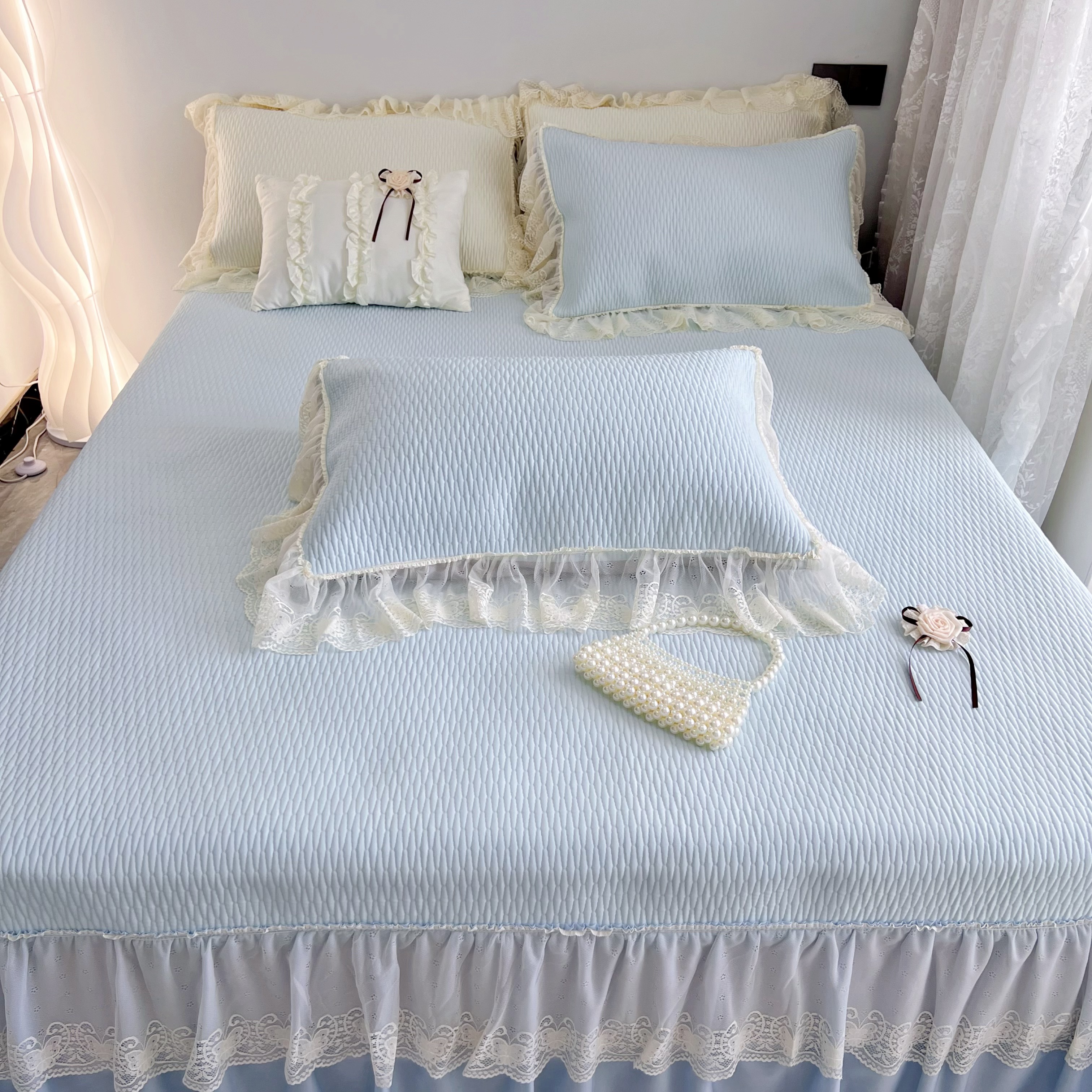 商品名称:恋尚羽 2026新款高分子PE凉泡泡大床裙凉感席波浪冰豆豆凉席席子三件套-系列 山茶可可 蓝色