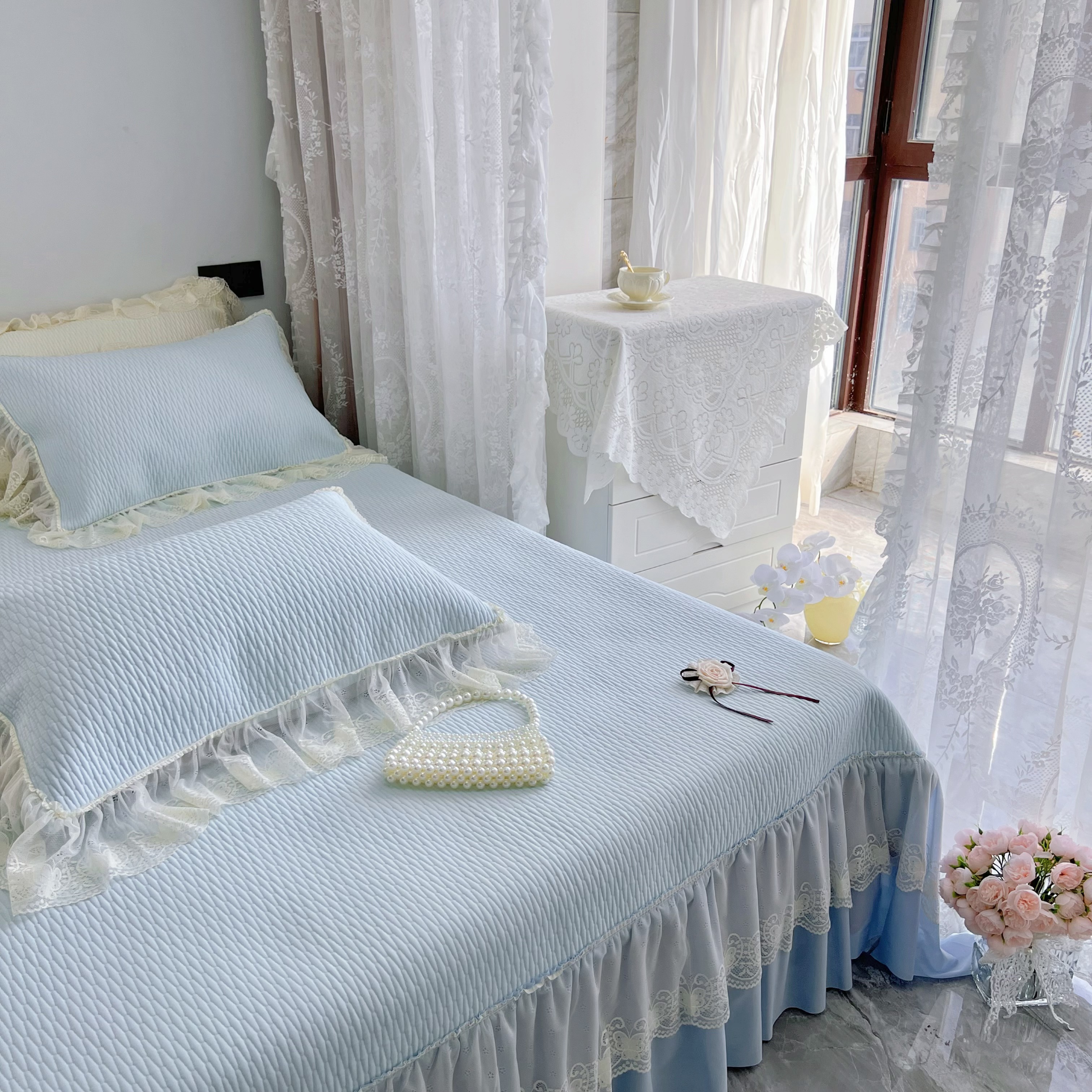 (总)恋尚羽 2026新款高分子PE凉泡泡大床裙凉感席波浪冰豆豆凉席席子三件套-蝴蝶结系列手捧花,粉色,灰色,咖色,兰色,绿色,紫色