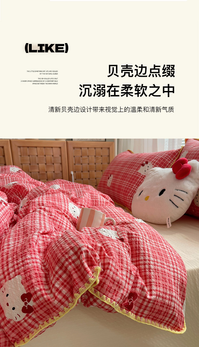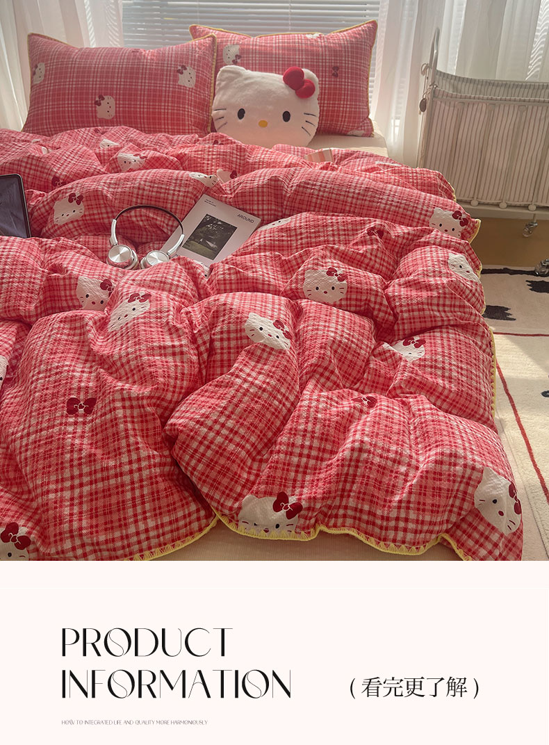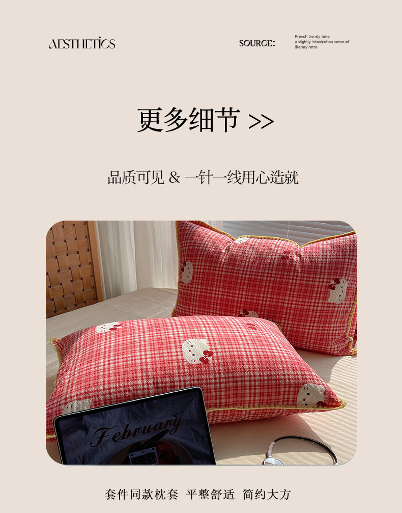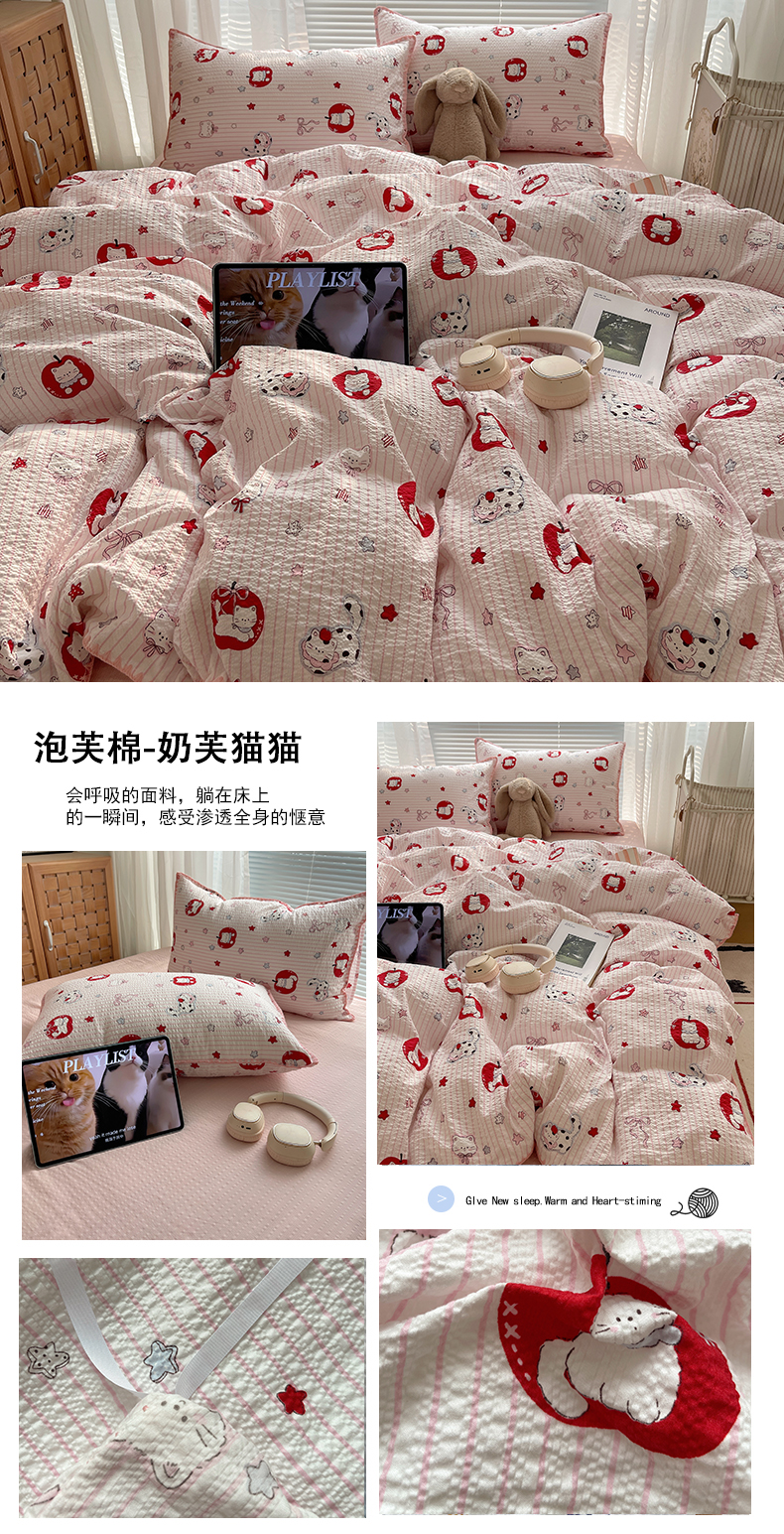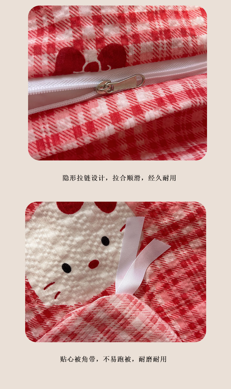 当前位置: 91家纺网 > 商品网购 > 床品套件 > 四件套 > 其它四件套 > 桃心家居 2026新款A类费尔岛可爱卡通贝壳边三角针工艺双层纱泡芙棉泡芙纱系列四件套 泡芙棉-红格布丁猫