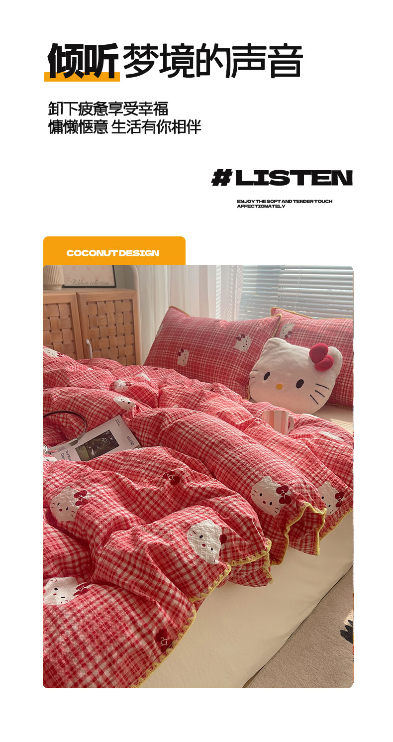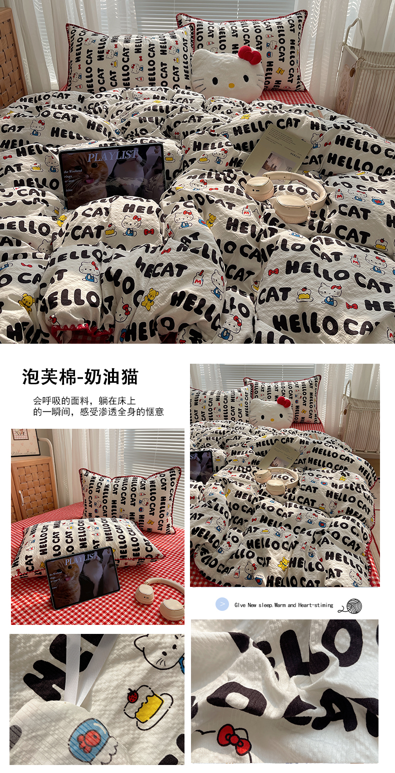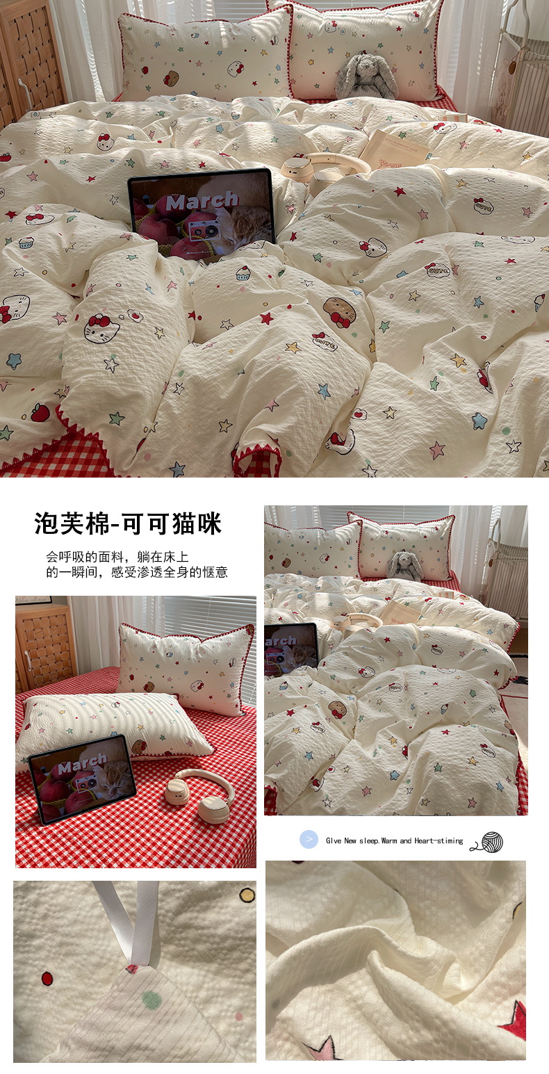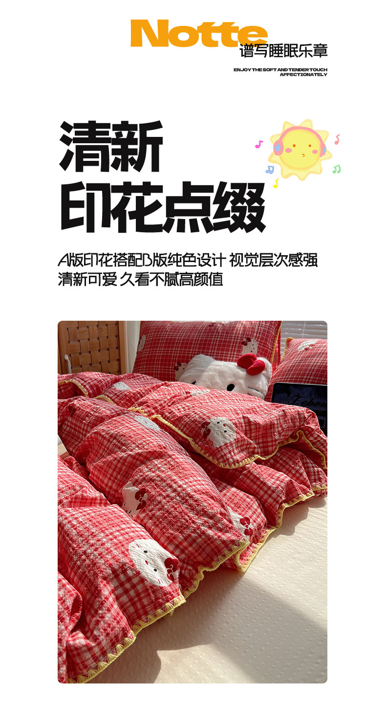 当前位置: 91家纺网 > 商品网购 > 床品套件 > 四件套 > 其它四件套 > 桃心家居 2026新款A类费尔岛可爱卡通贝壳边三角针工艺双层纱泡芙棉泡芙纱系列四件套 泡芙棉-红格布丁猫