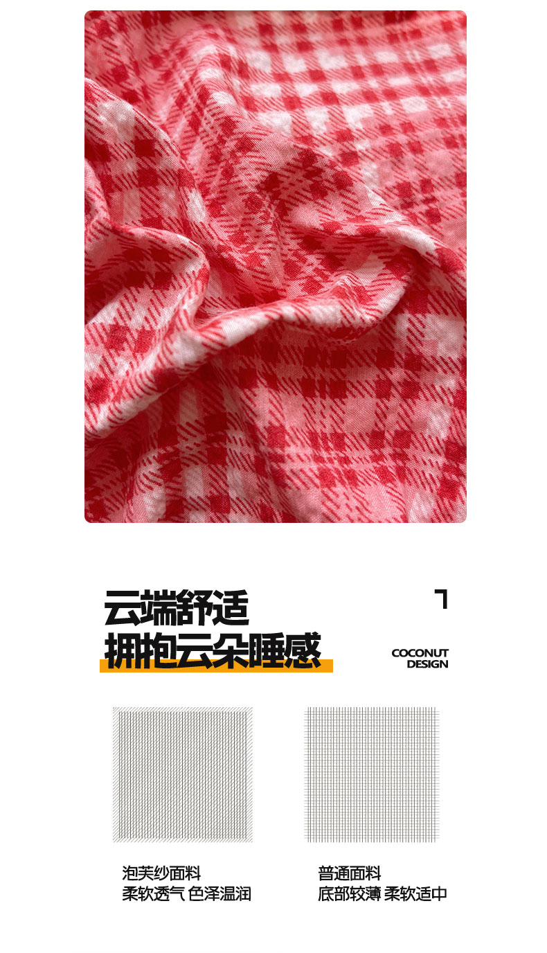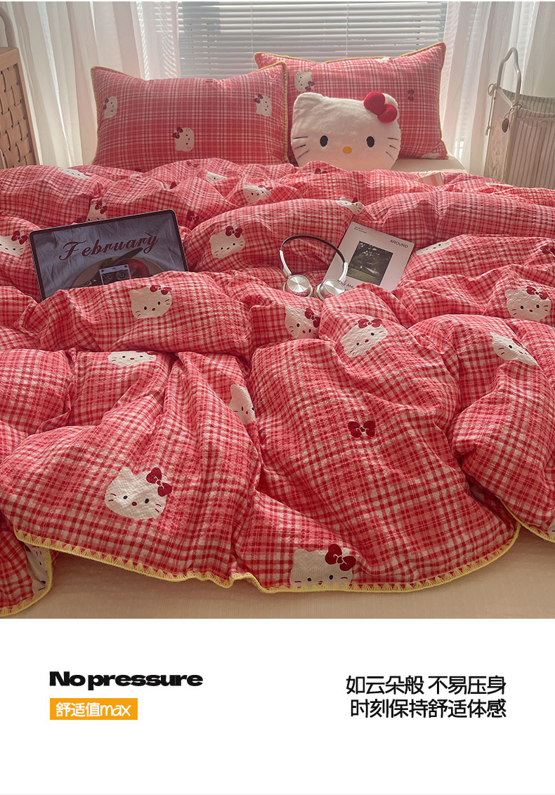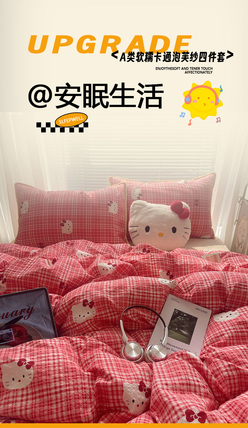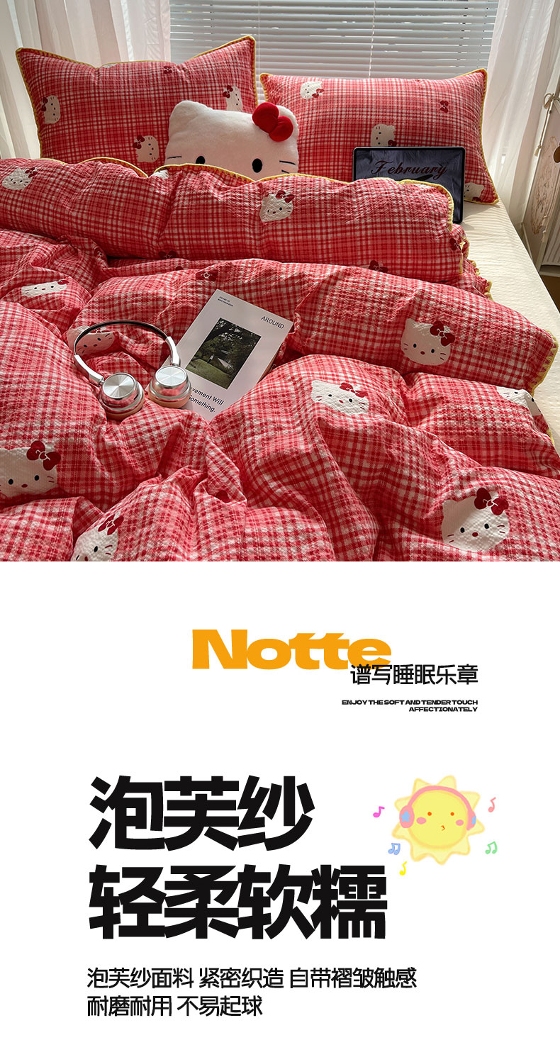 当前位置: 91家纺网 > 商品网购 > 床品套件 > 四件套 > 其它四件套 > 桃心家居 2026新款A类费尔岛可爱卡通贝壳边三角针工艺双层纱泡芙棉泡芙纱系列四件套 泡芙棉-红格布丁猫