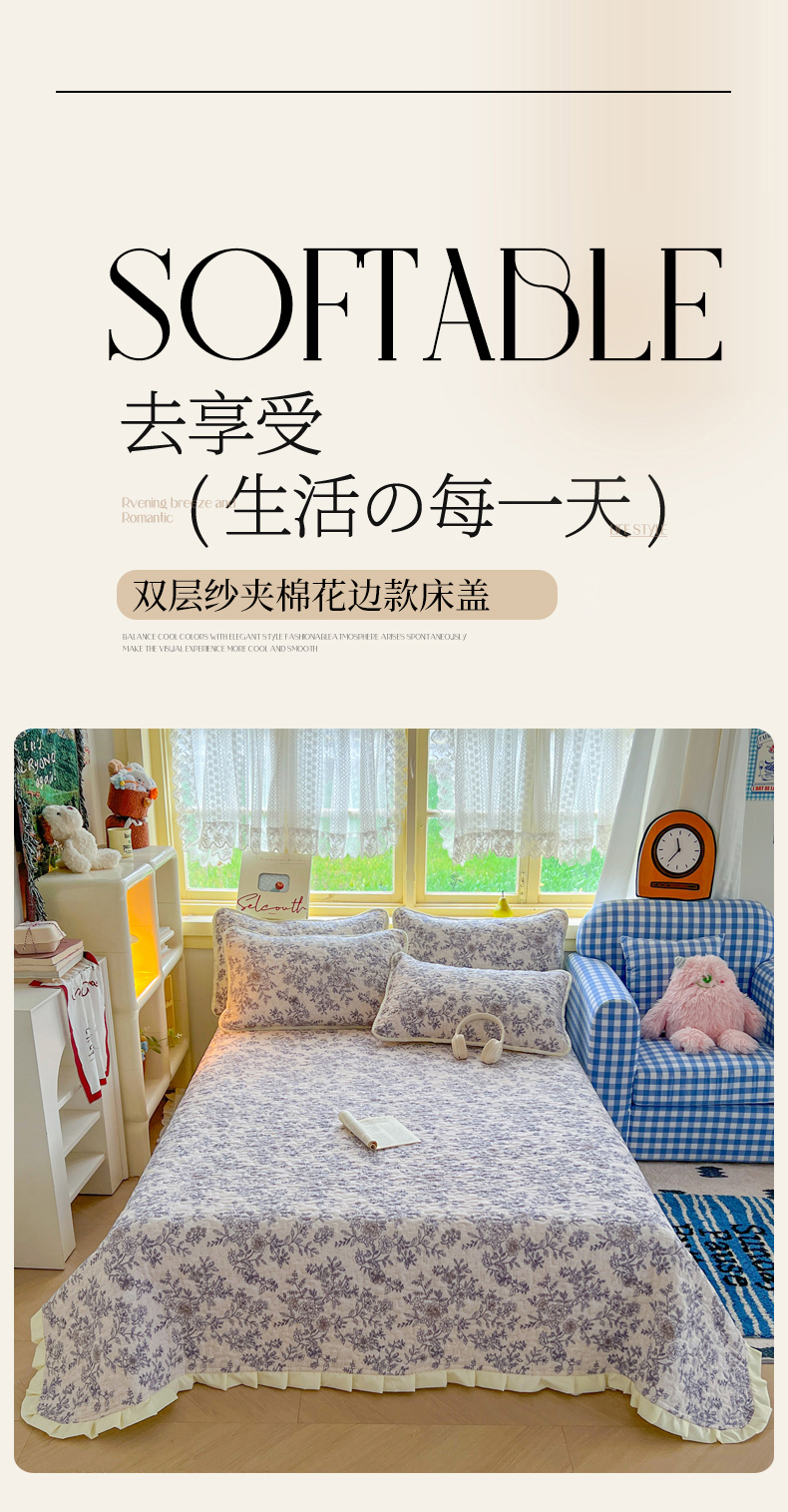 (总)默忆 2026新款亲肤舒适双层纱花边宽床盖,粉色兔语,繁花似锦,花草兔,灰格爱心,锦上添花,蓝格小熊,马到成功,圣诞小鹿,樱桃曼舞