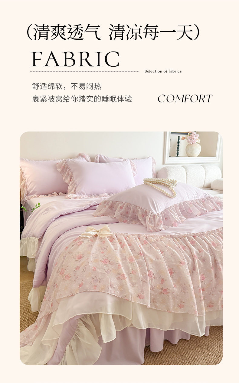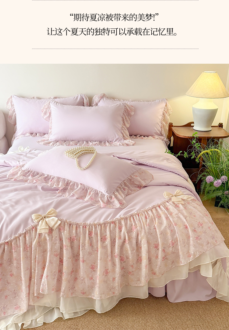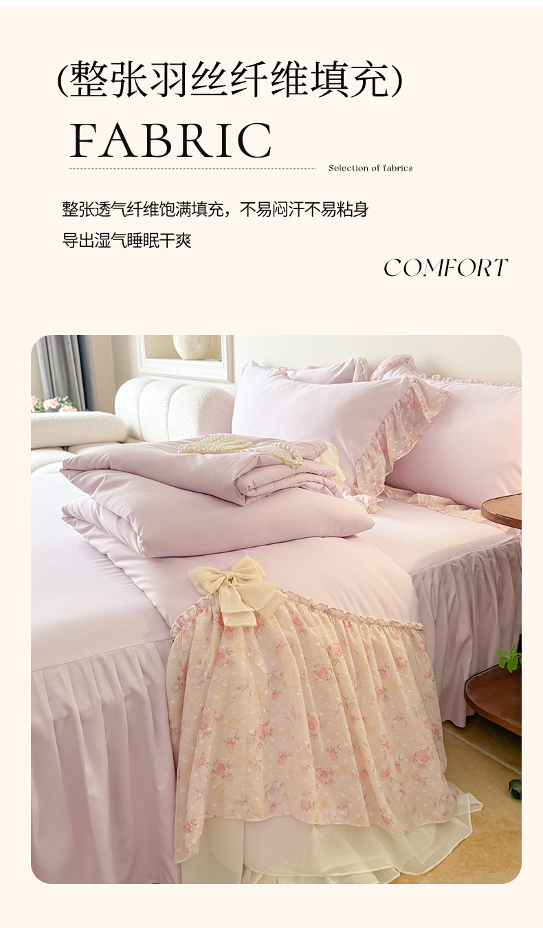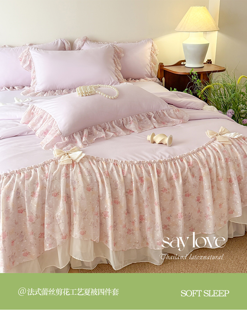 • 91家纺网 家纺一手货源 找家纺 富盛家纺 2026新款雪纺蕾丝刺绣法式床裙韩版夏凉被空调被夏被四件套 夏被四件套—浪漫主义(紫)