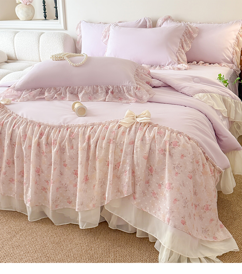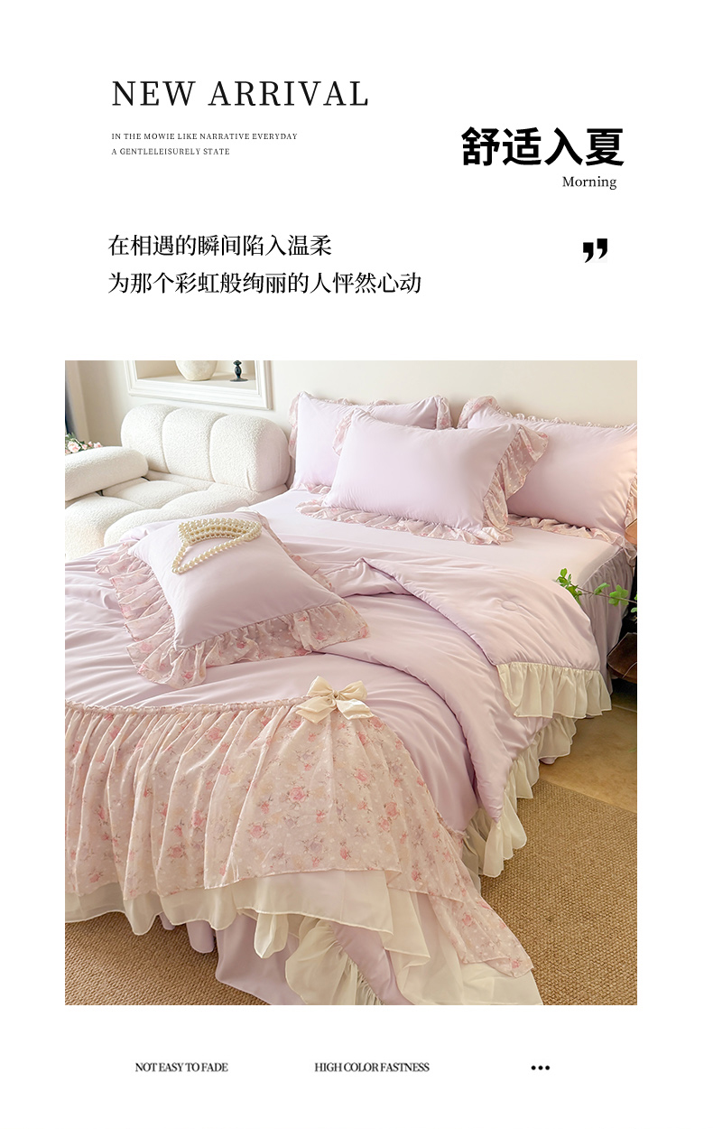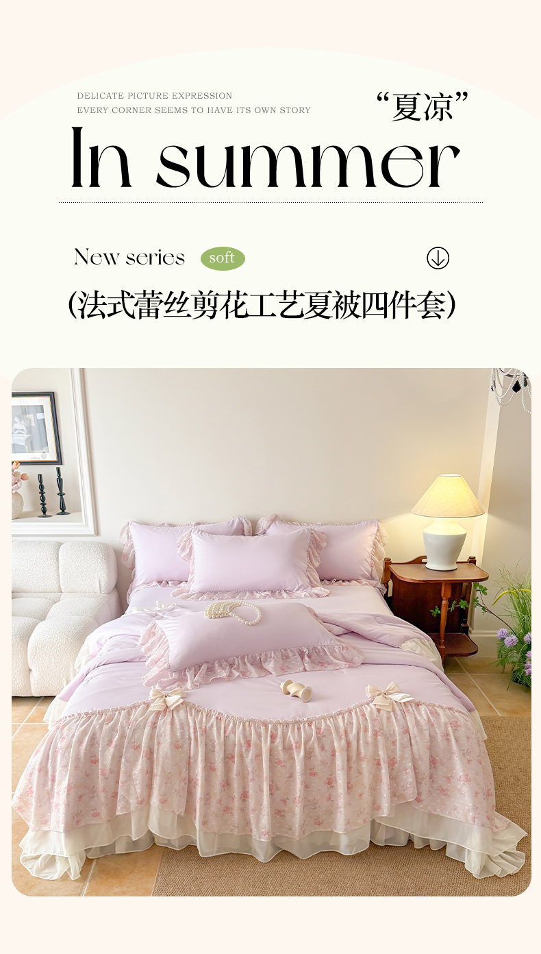 • 91家纺网 家纺一手货源 找家纺 富盛家纺 2026新款雪纺蕾丝刺绣法式床裙韩版夏凉被空调被夏被四件套 夏被四件套—浪漫主义(紫)
