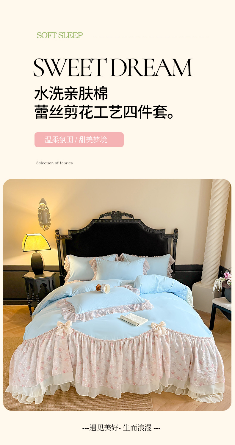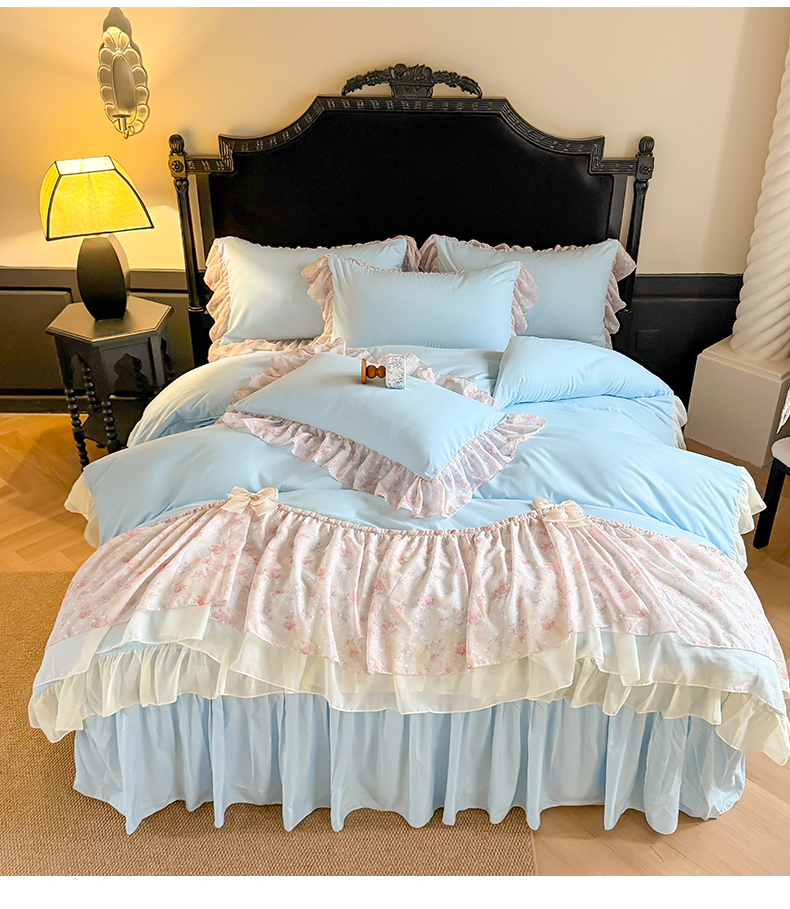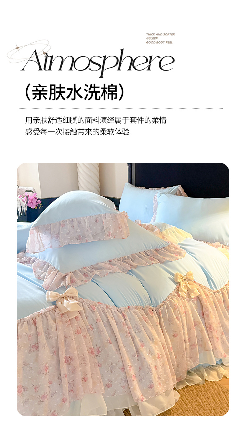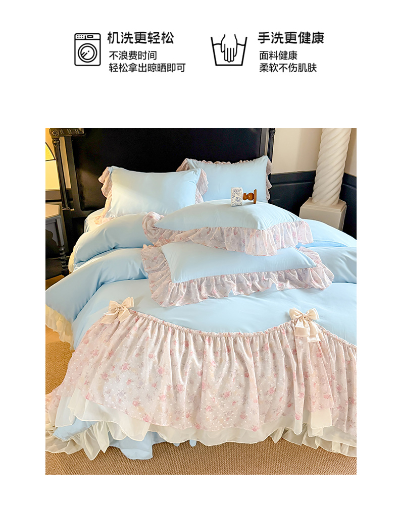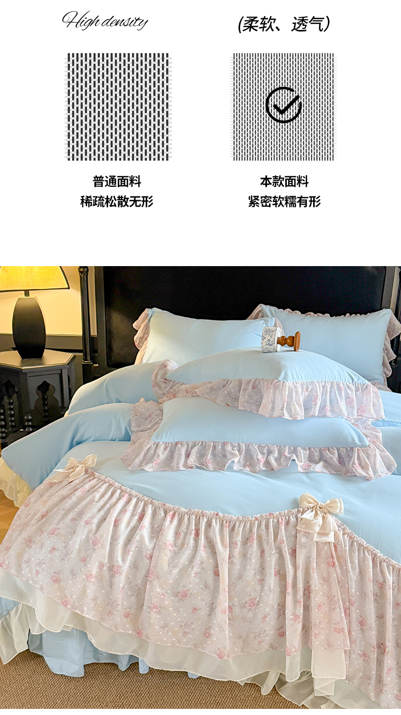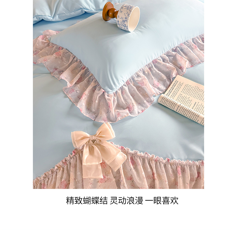 当前位置: 91家纺网 > 商品网购 > 床品套件 > 四件套 > 其它四件套 > 富盛家纺 2026新款水洗亲肤棉雪纺蕾丝刺绣法式床裙韩版四件套 浪漫主义-蓝