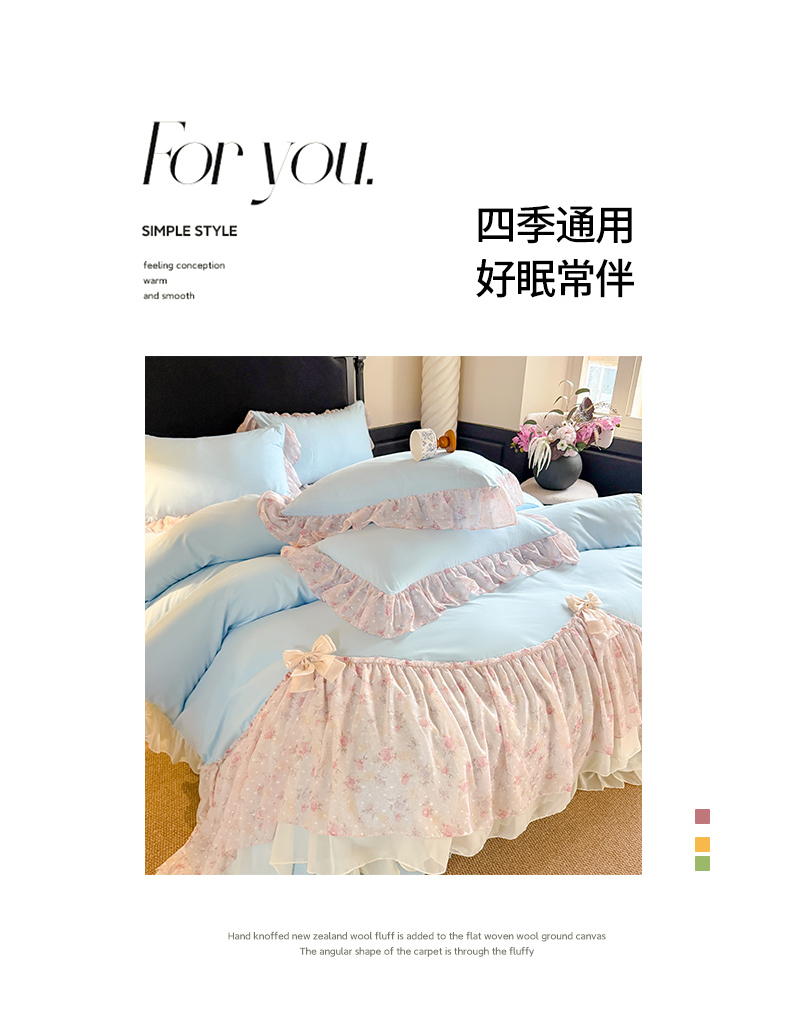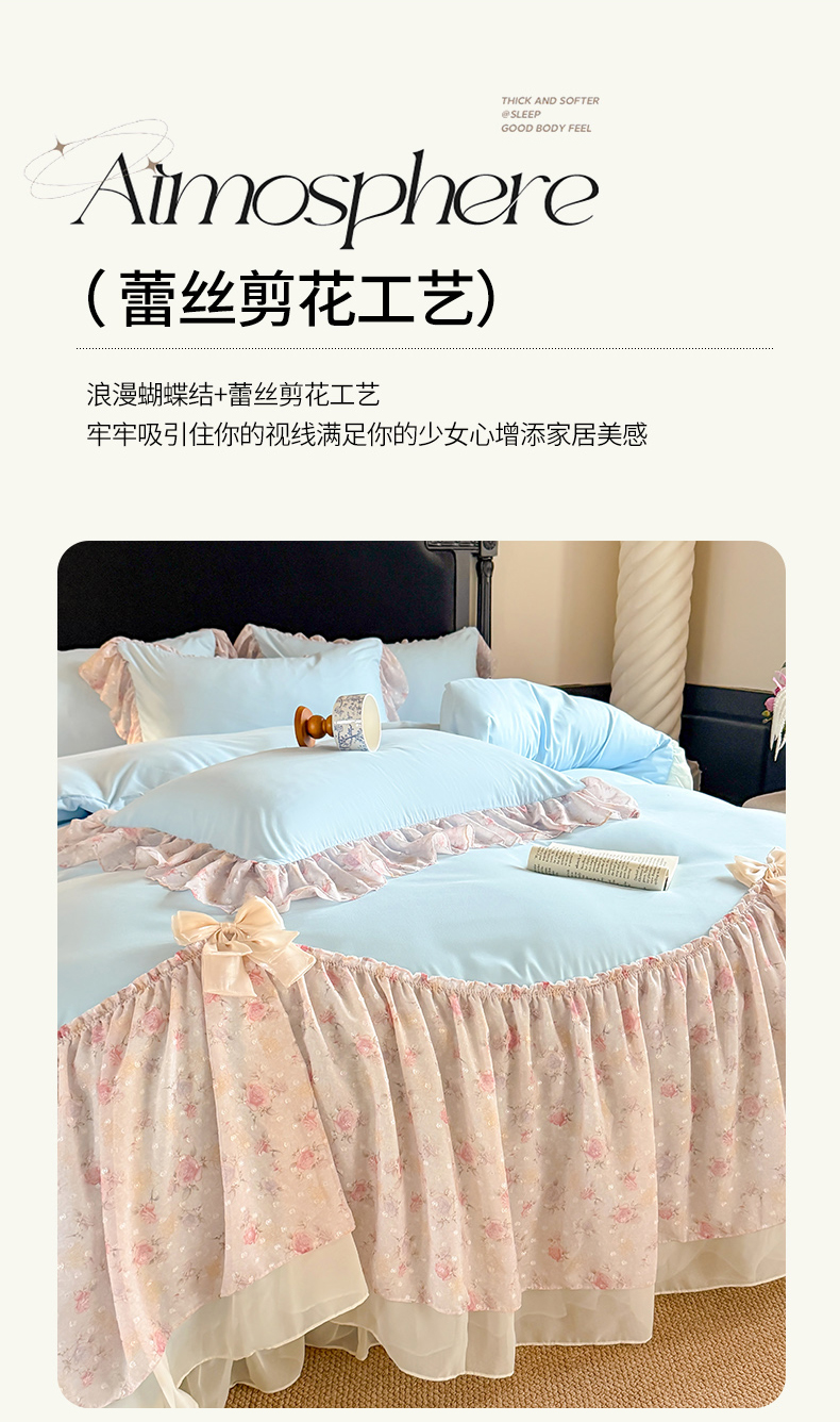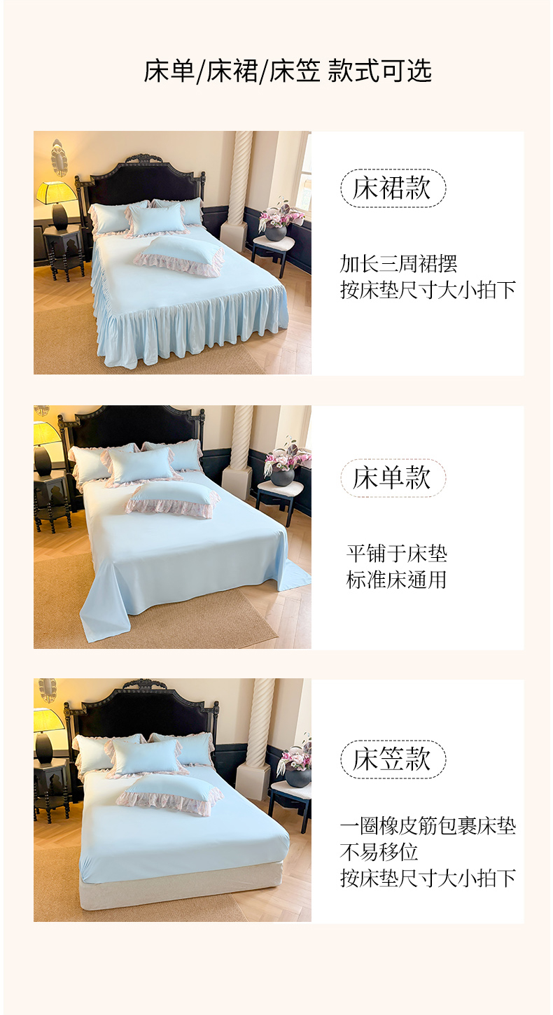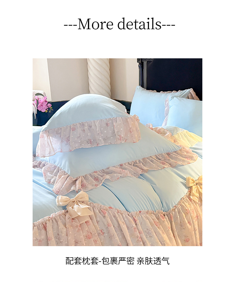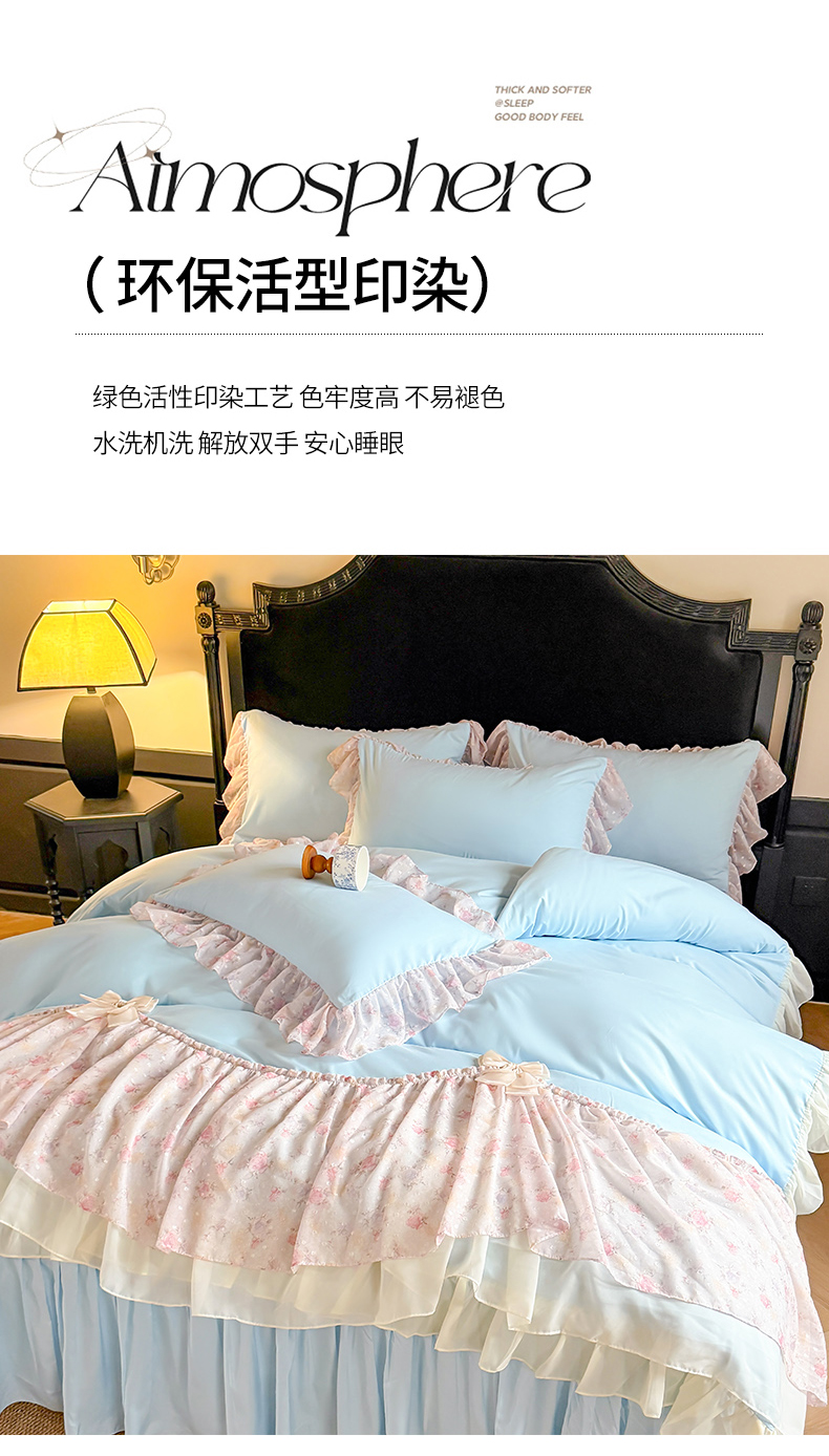 当前位置: 91家纺网 > 商品网购 > 床品套件 > 四件套 > 其它四件套 > 富盛家纺 2026新款水洗亲肤棉雪纺蕾丝刺绣法式床裙韩版四件套 浪漫主义-蓝