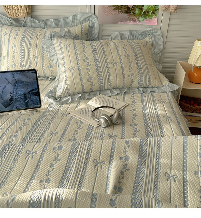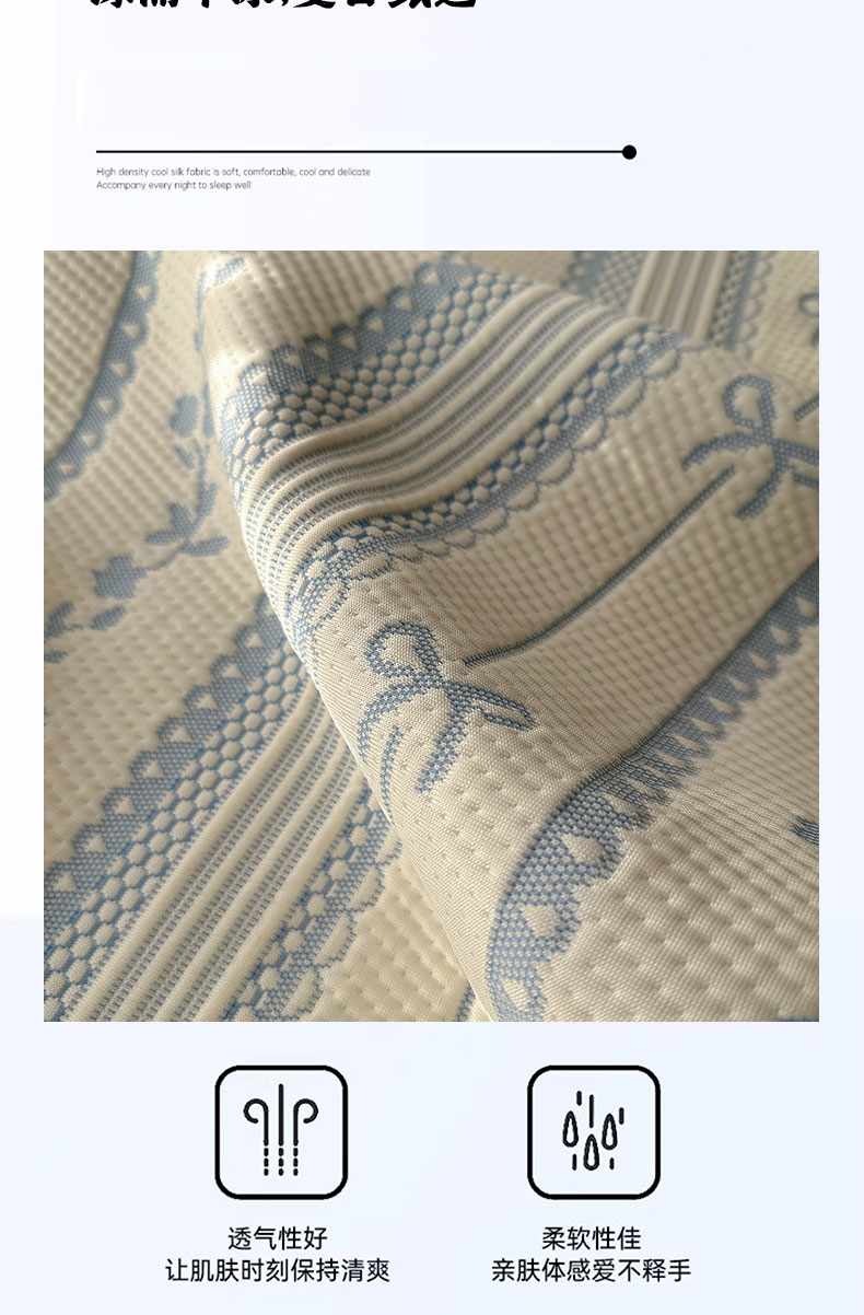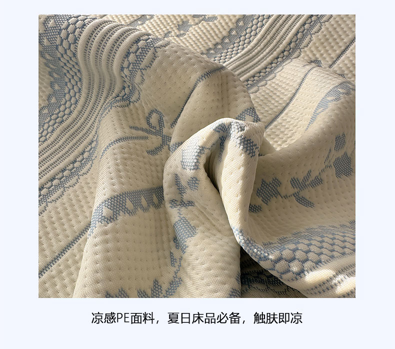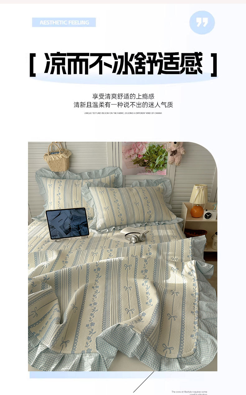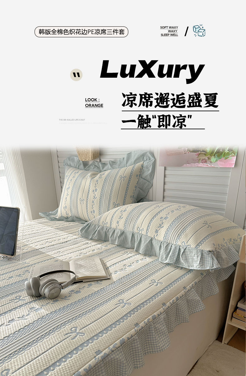 商品名称:桃子家居 2026新款A类韩版全棉色织花边工艺提花PE凉感凉席席子凉席三件套系列 PE花边席-采薇蓝