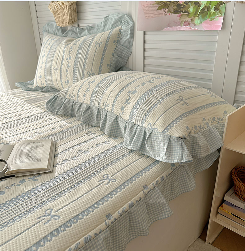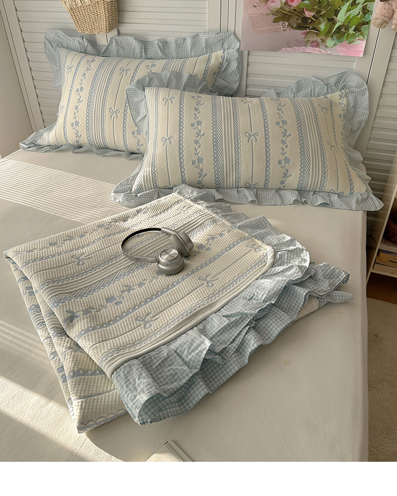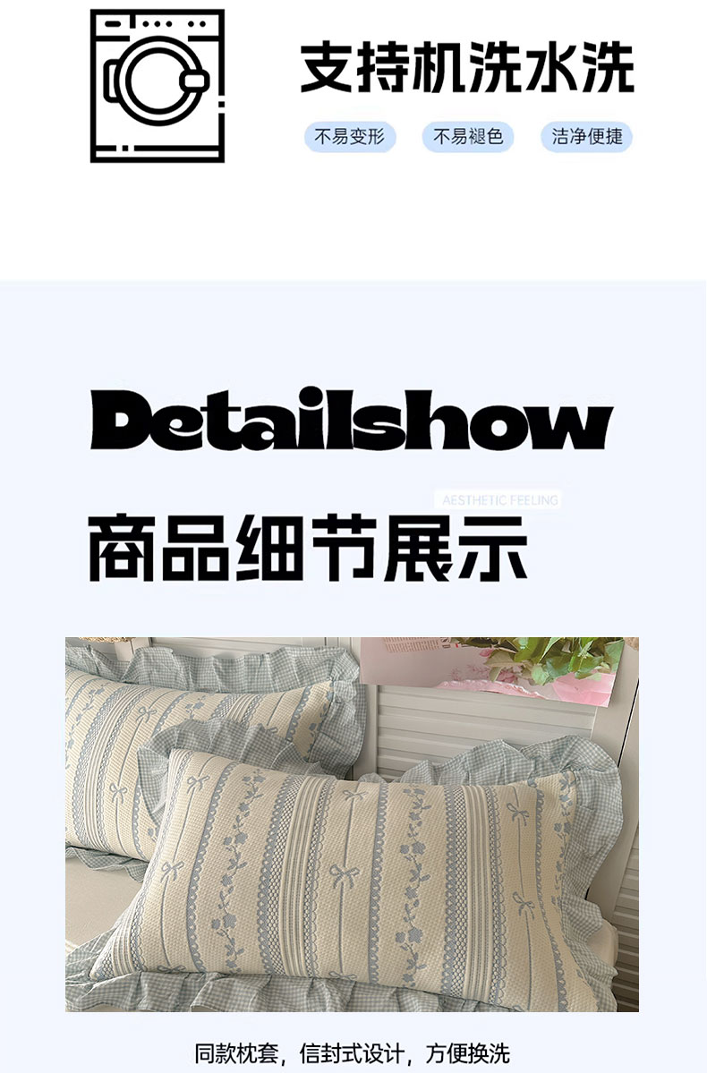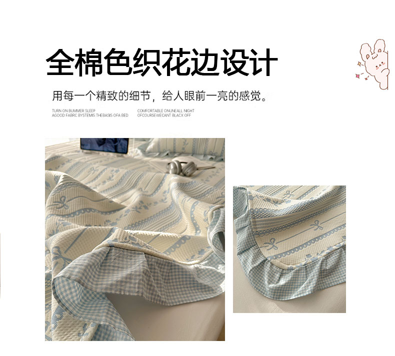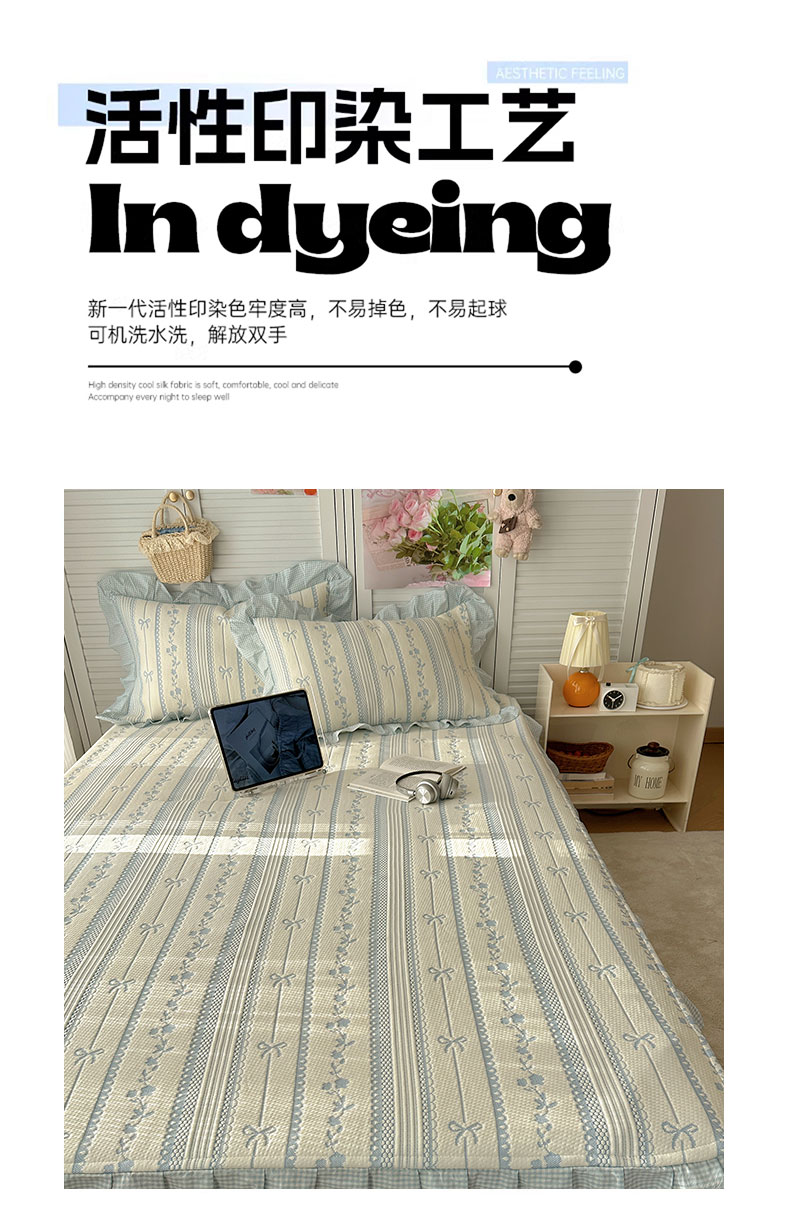 商品名称:桃子家居 2026新款A类韩版全棉色织花边工艺提花PE凉感凉席席子凉席三件套系列 PE花边席-采薇蓝
