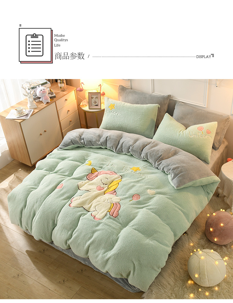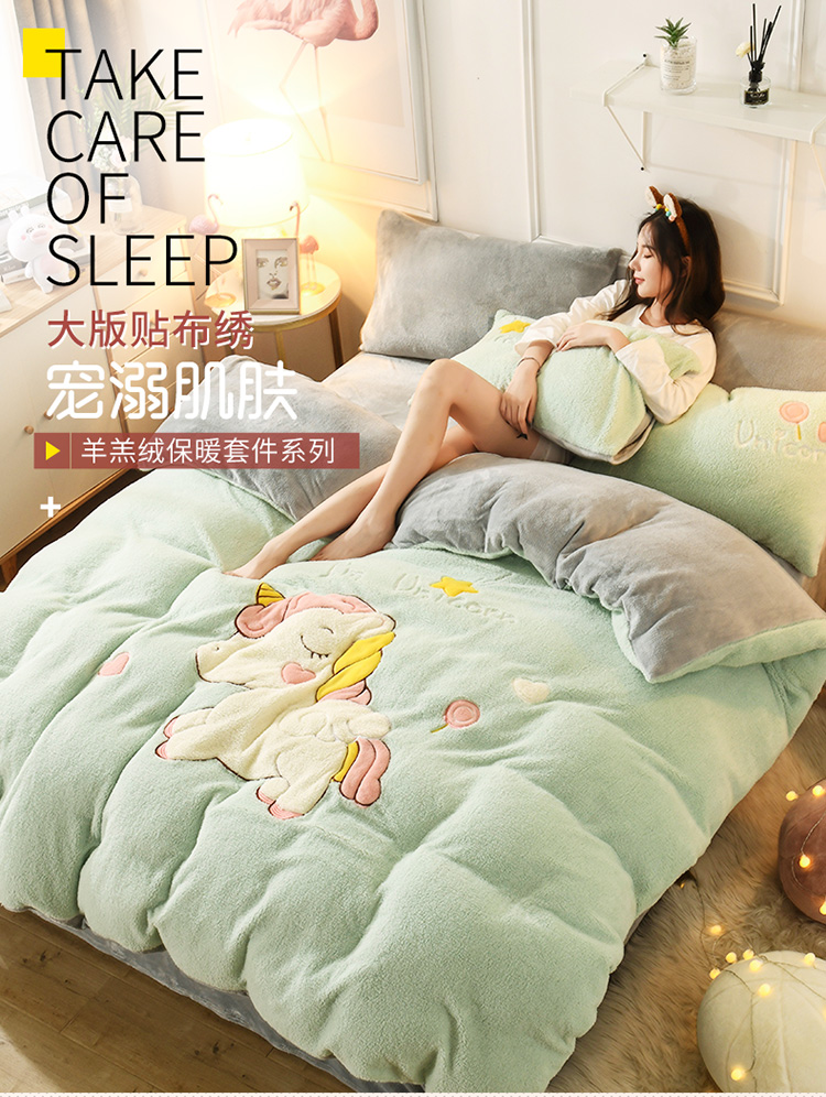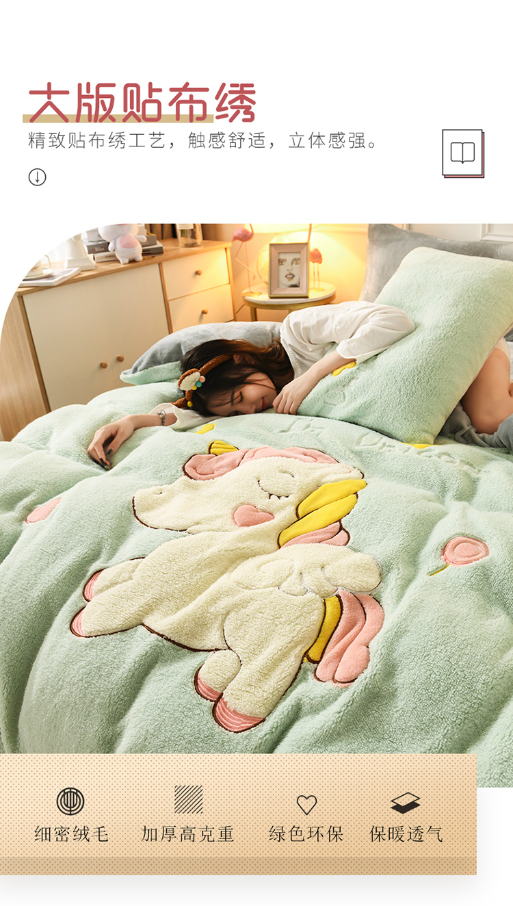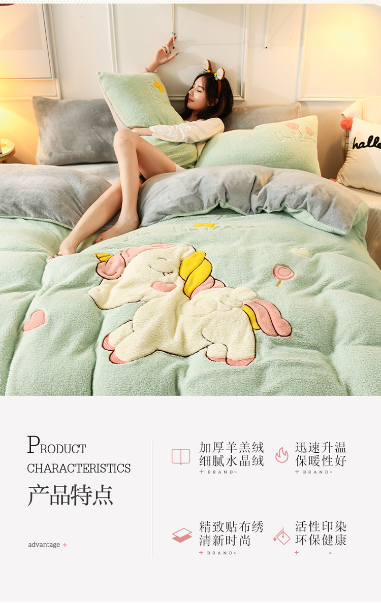商品名称:朗莎家纺 2019新款大版贴布绣羊羔绒保暖四件套 独角兽抹茶绿