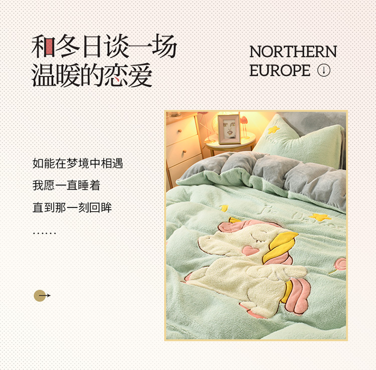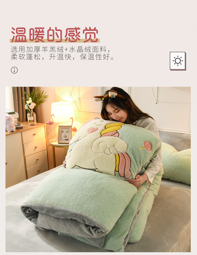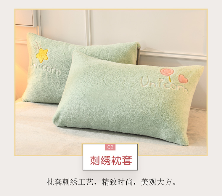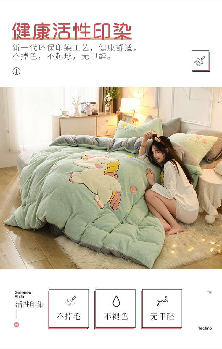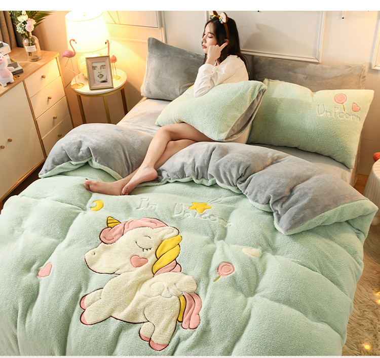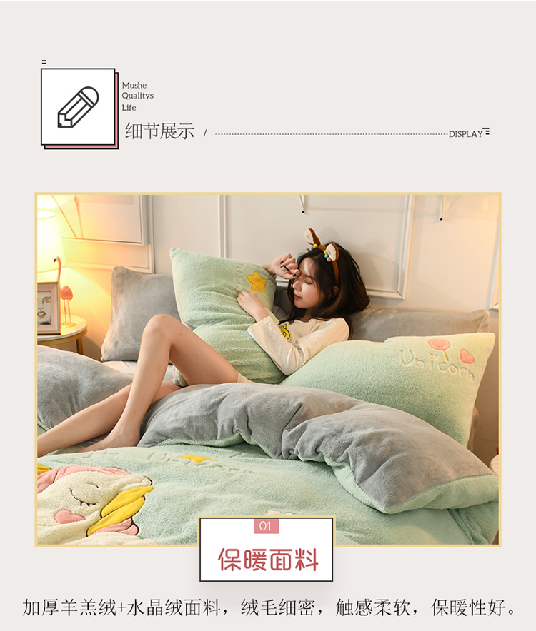 商品名称:朗莎家纺 2019新款大版贴布绣羊羔绒保暖四件套 独角兽抹茶绿