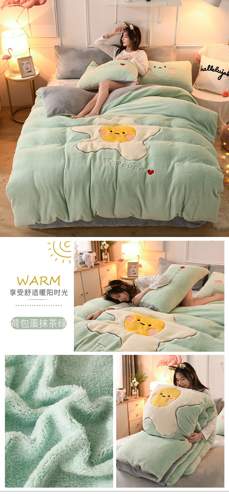 (总)朗莎家纺 2019新款羊羔绒贴布绣四件套,彩虹精灵,菠萝玉色,草莓奶白,独角兽抹茶绿,好色龙银灰,荷包蛋姜黄,荷包蛋抹茶绿,柠檬抹茶绿,柠檬墨绿,牛油果抹茶绿,圣诞鹿豆沙,小鸡藏青,小鸡午夜蓝,小鸡银灰