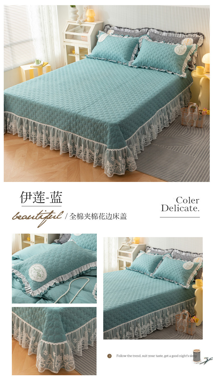 菊上家纺 2021新款全棉贴布绣花花边单床盖 伊莲-蓝