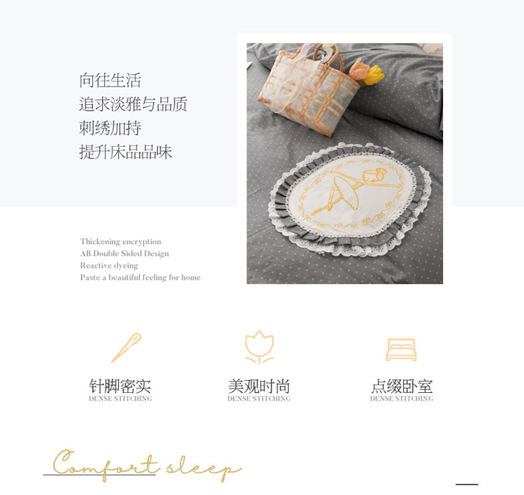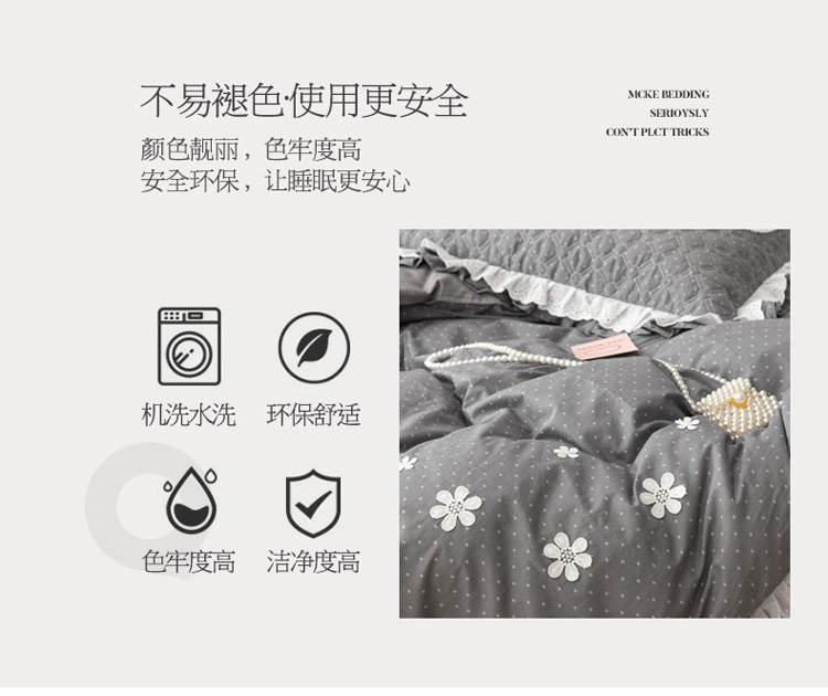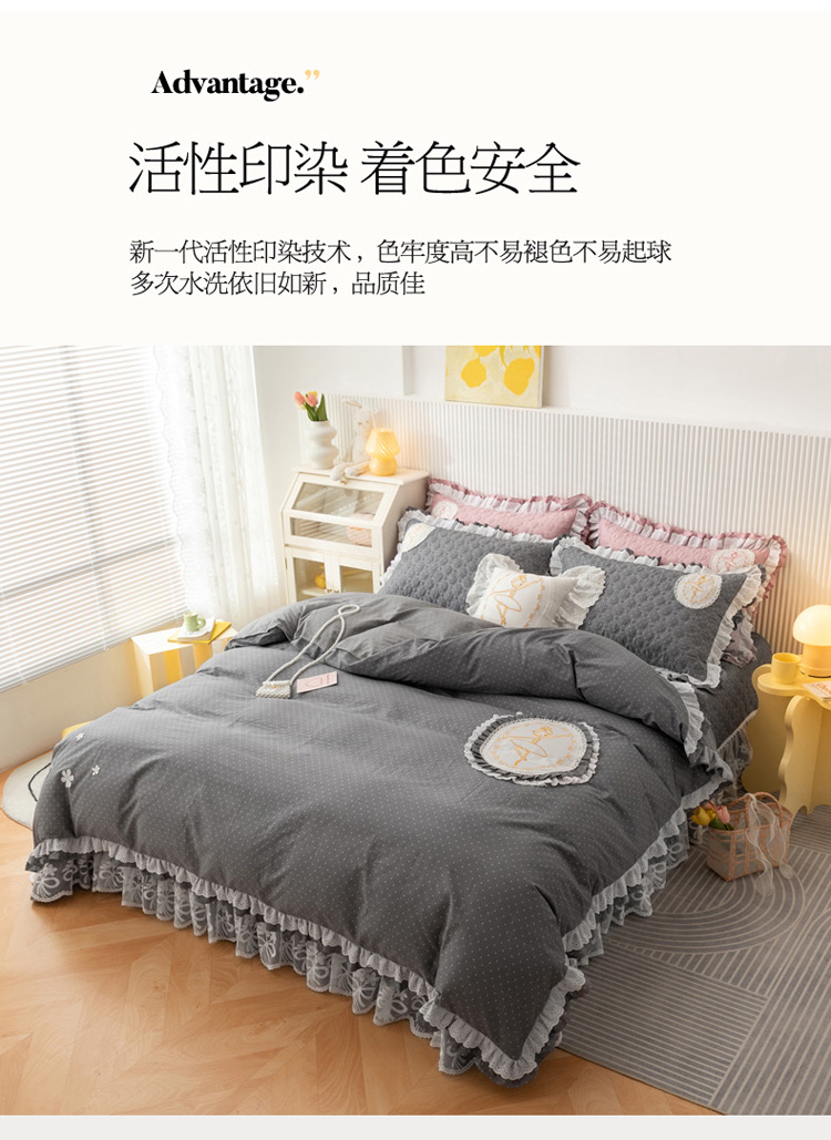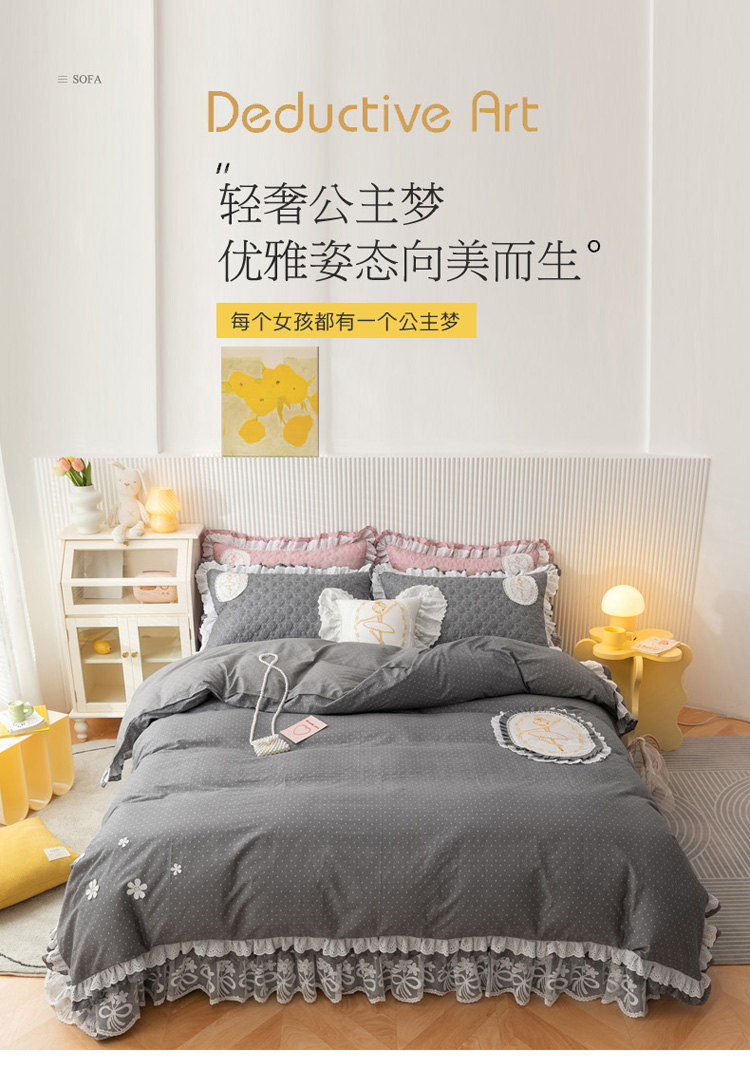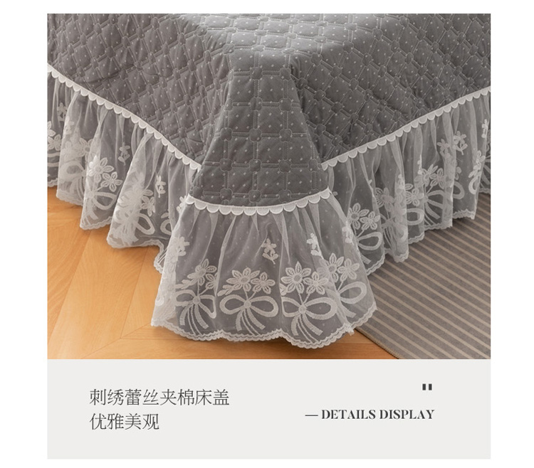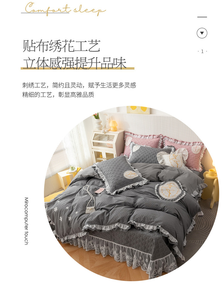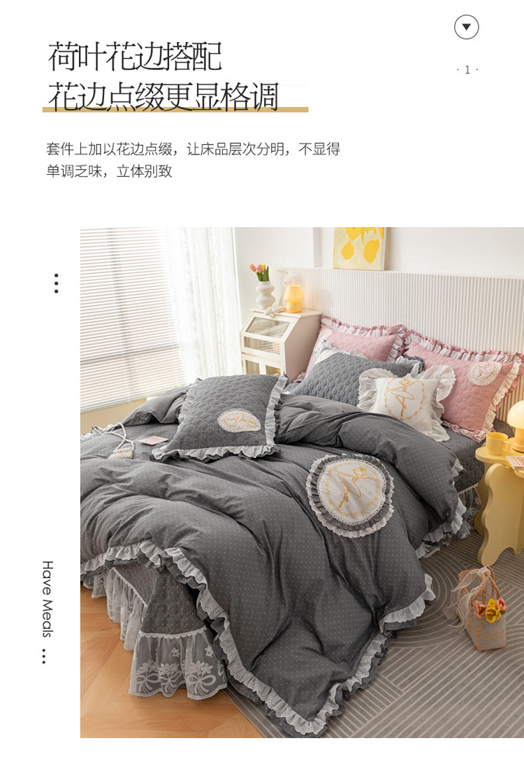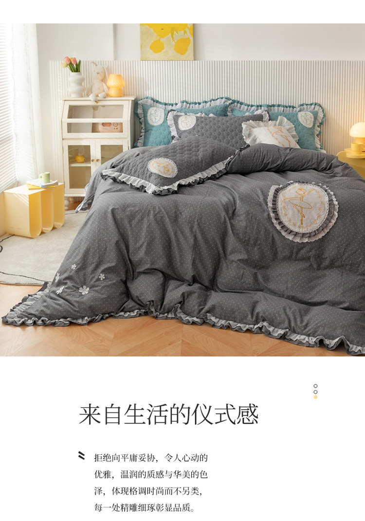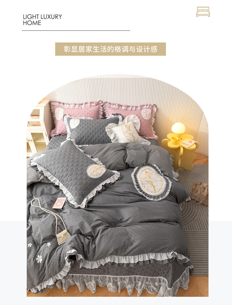 当前位置: 91家纺网 > 商品网购 > 床品套件 > 四件套 > 全棉普通四件套 > 菊上家纺 2021新款全棉贴布绣花花边床盖四件套 伊莲-灰