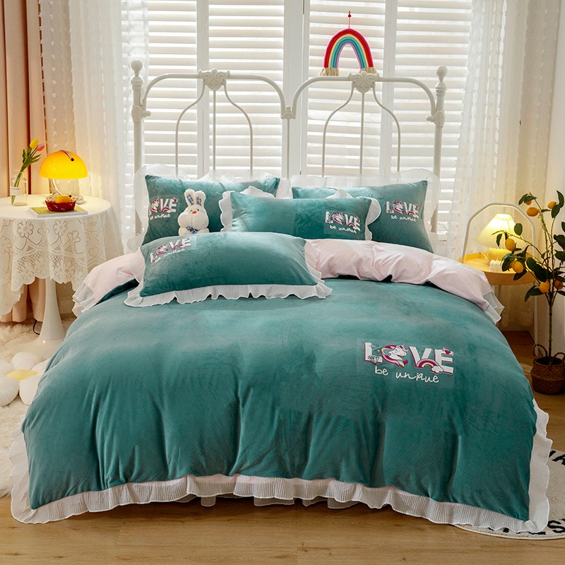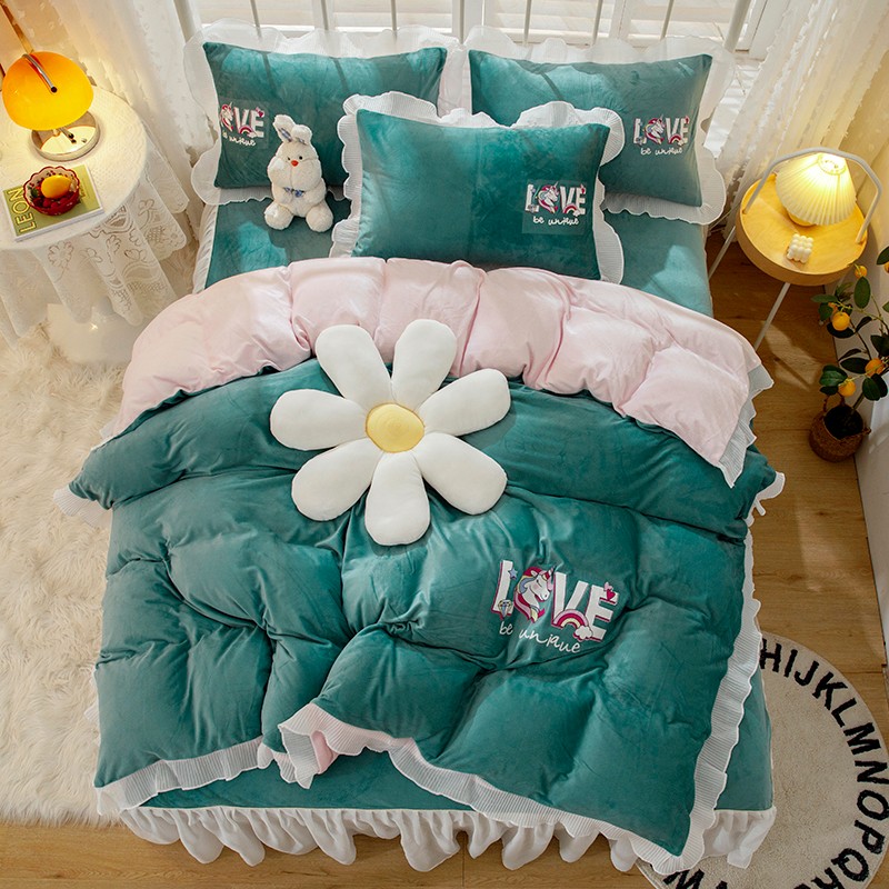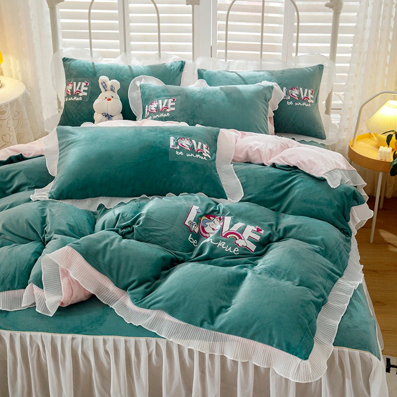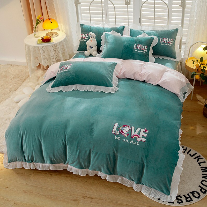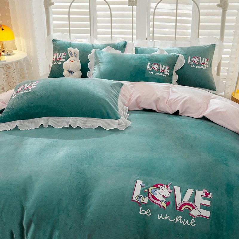 纽缦 2021新款韩版水晶绒床裙四件套 独角兽-浅绿粉