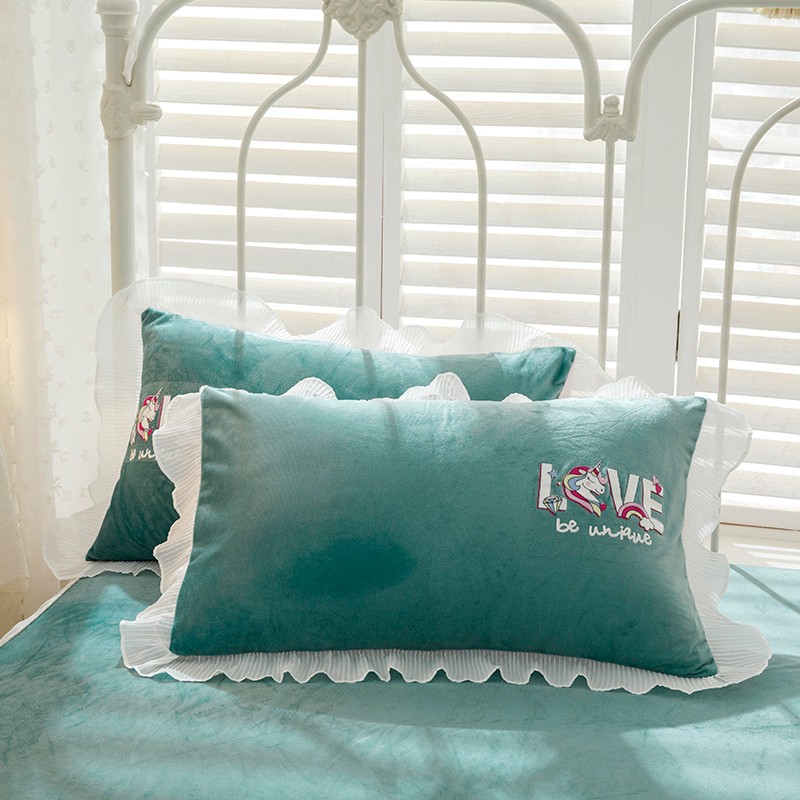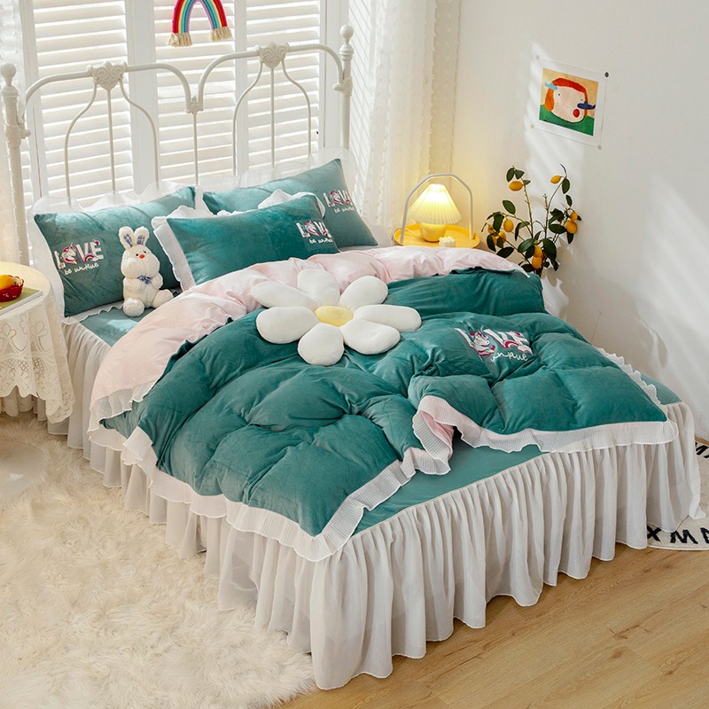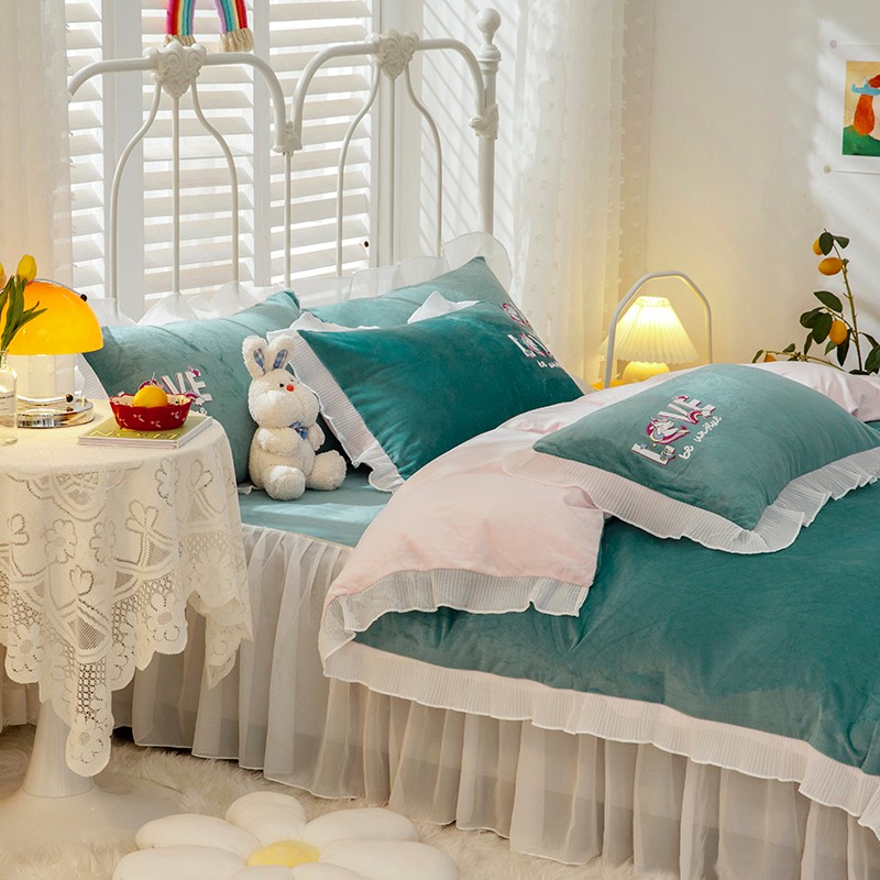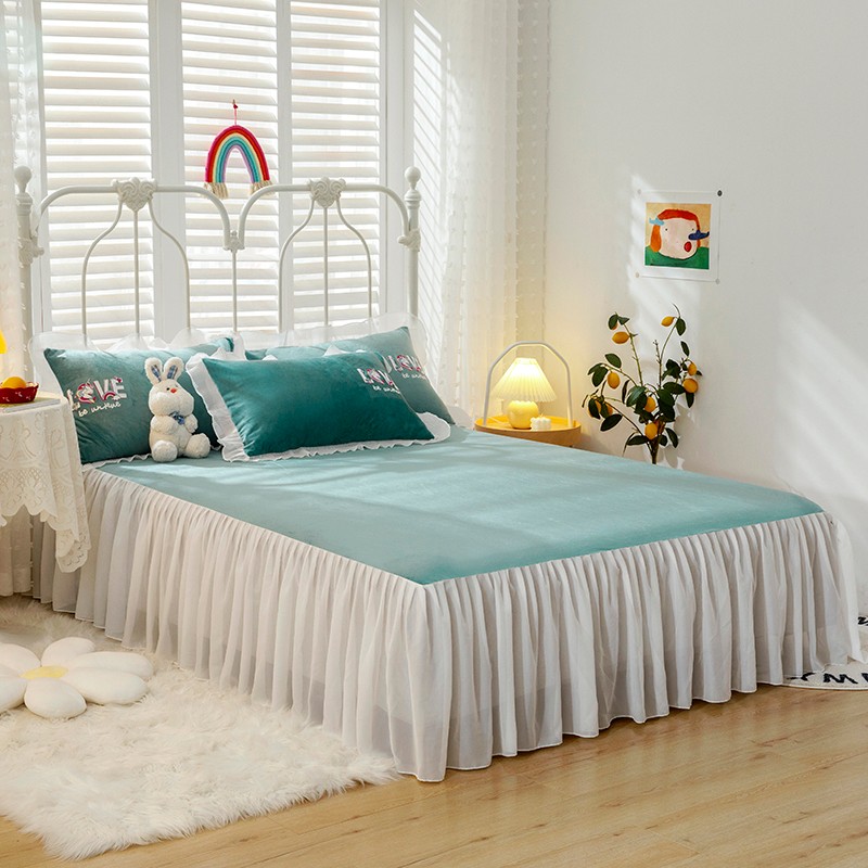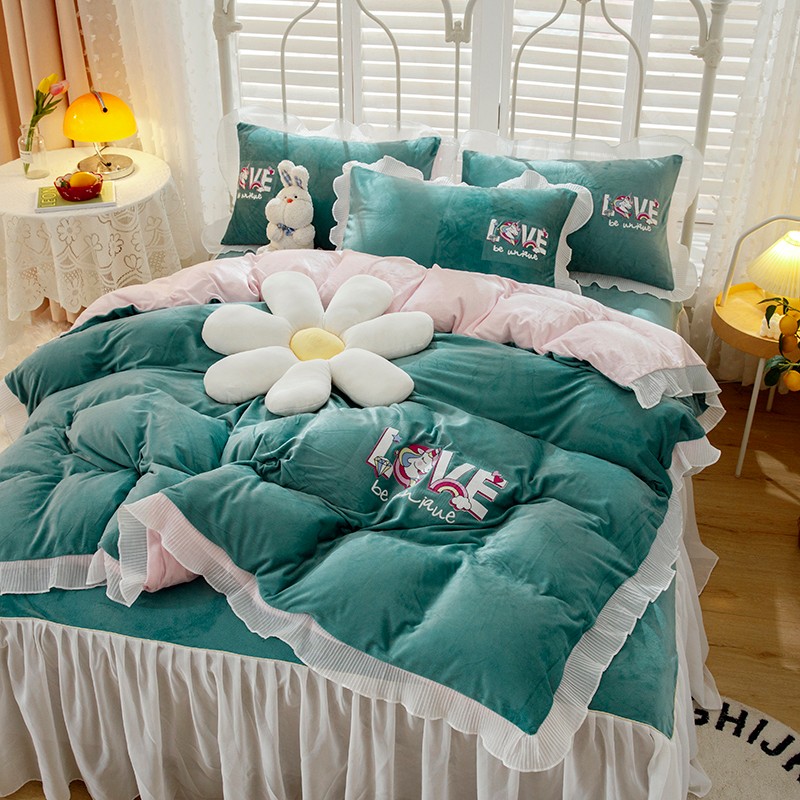 纽缦 2021新款韩版水晶绒床裙四件套 独角兽-浅绿粉