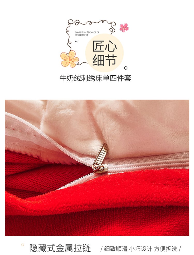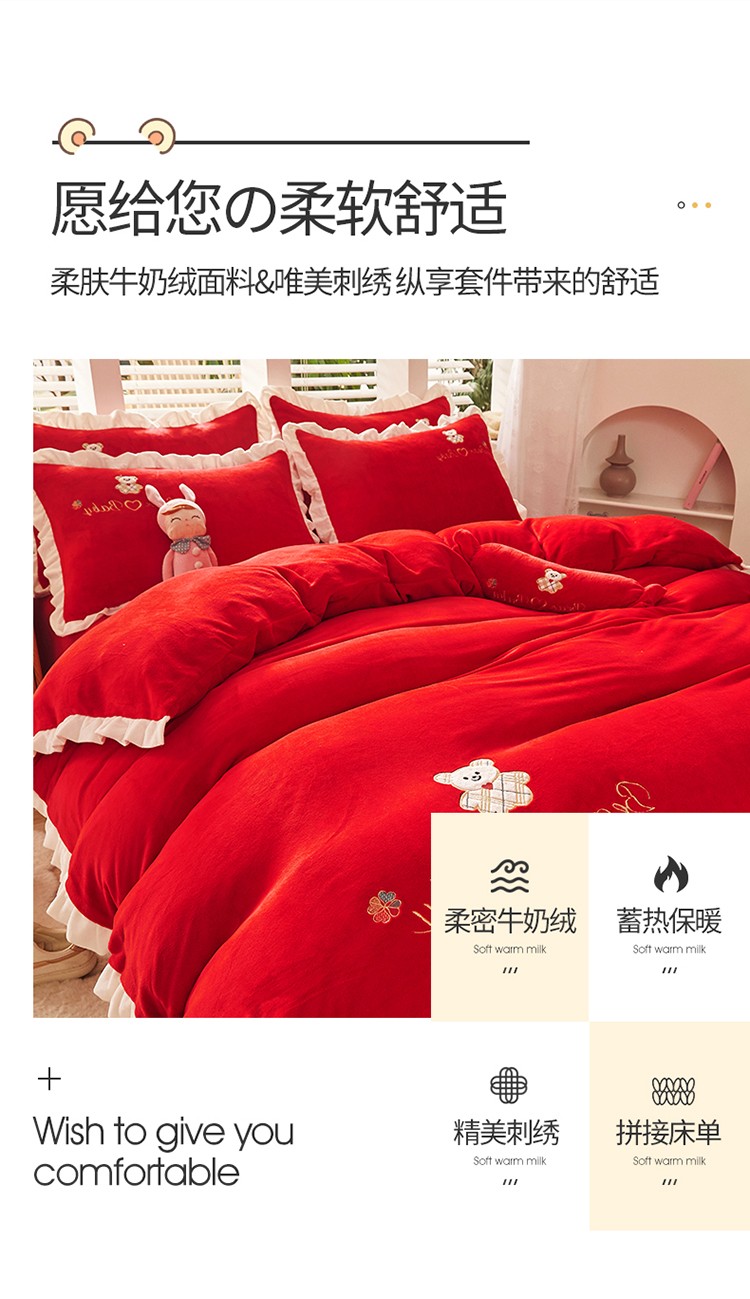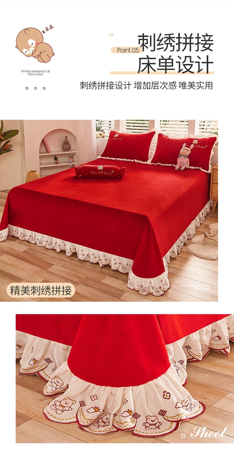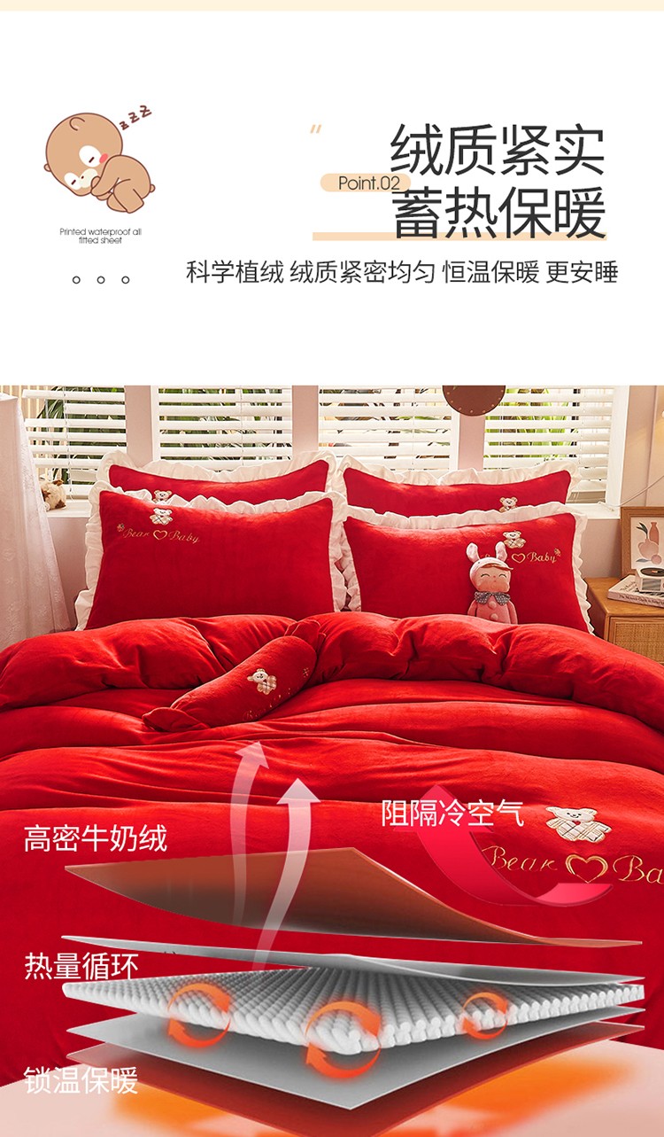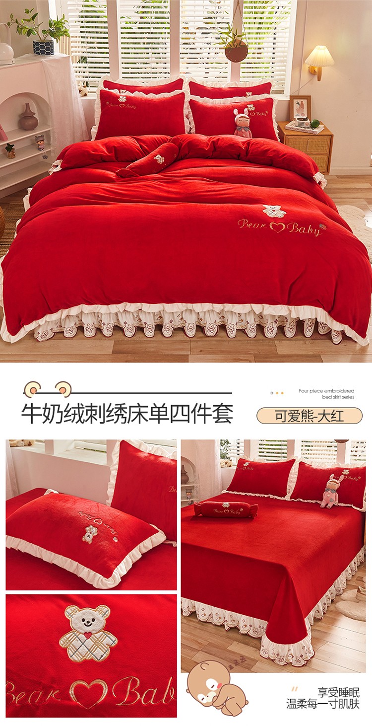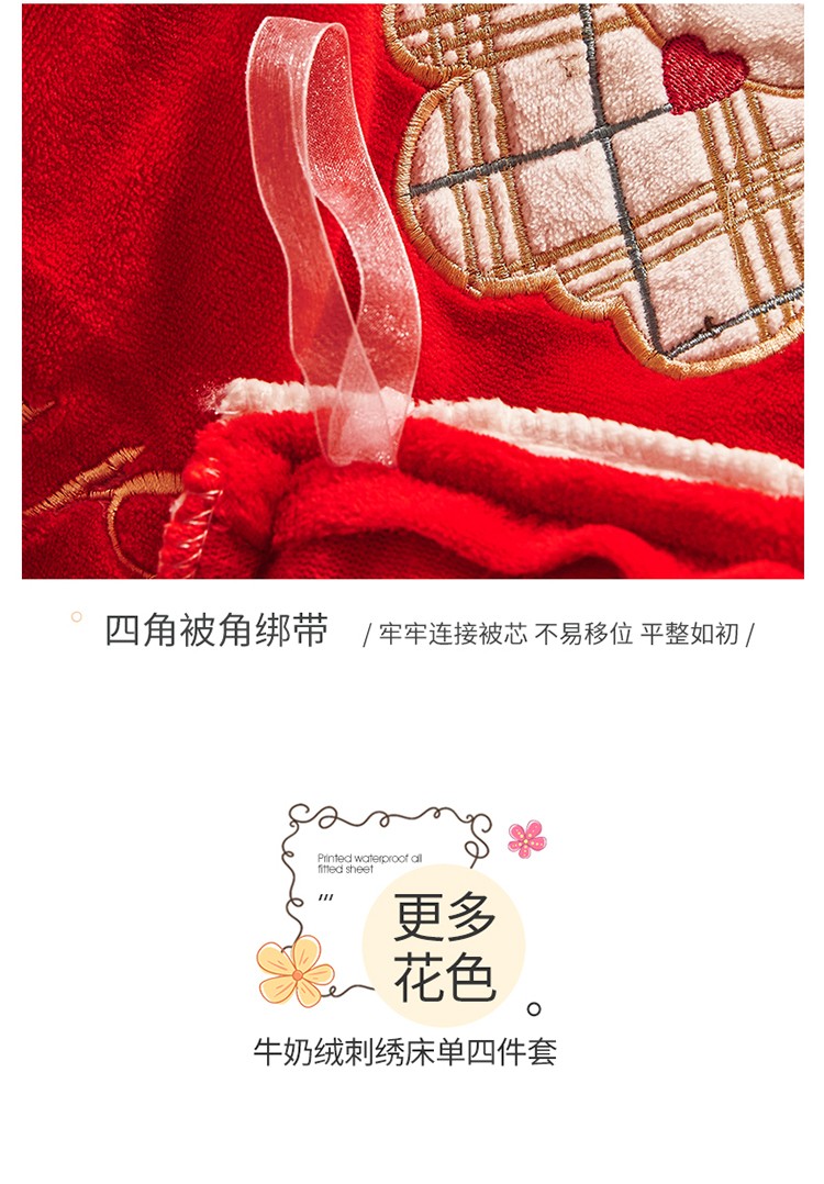 宜凡家纺 2021新款牛奶绒绣花熊床单四件套 可爱熊-大红