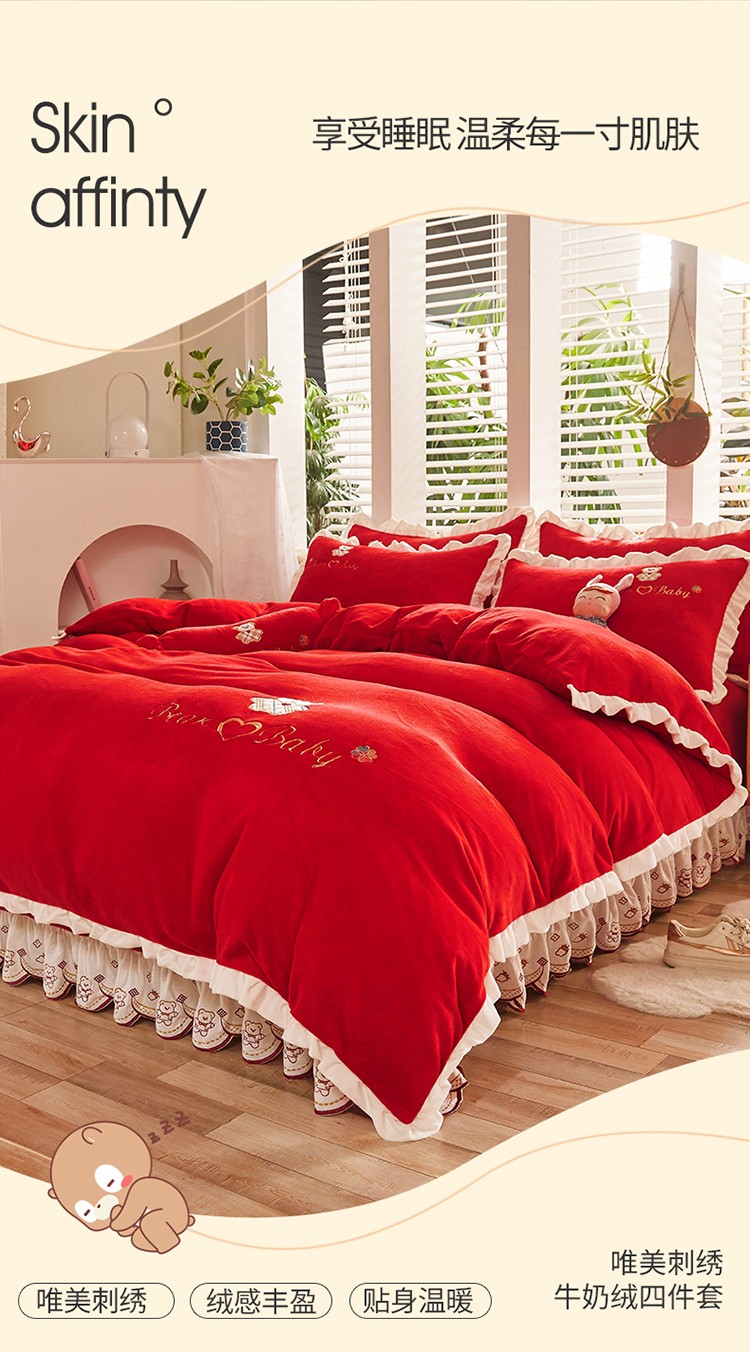 (总)宜凡家纺 2025新款婴儿绒压花全夹棉床裙四件套,韵雅-中国红,韵雅-黑天鹅
