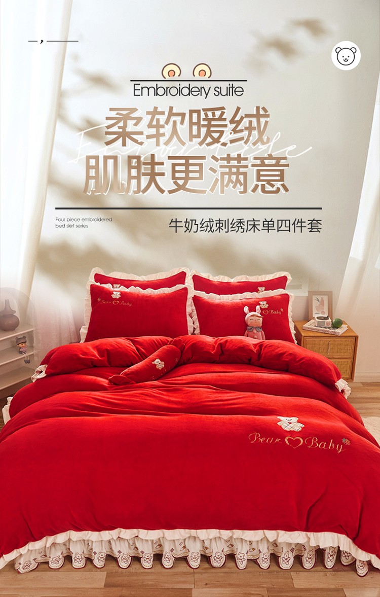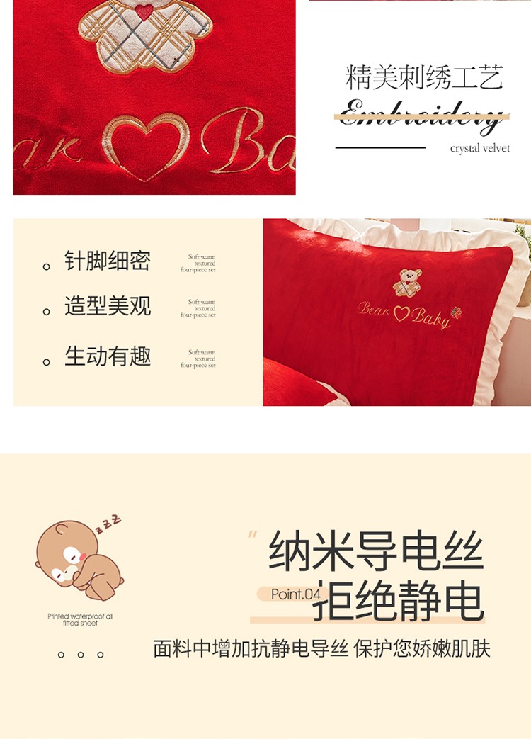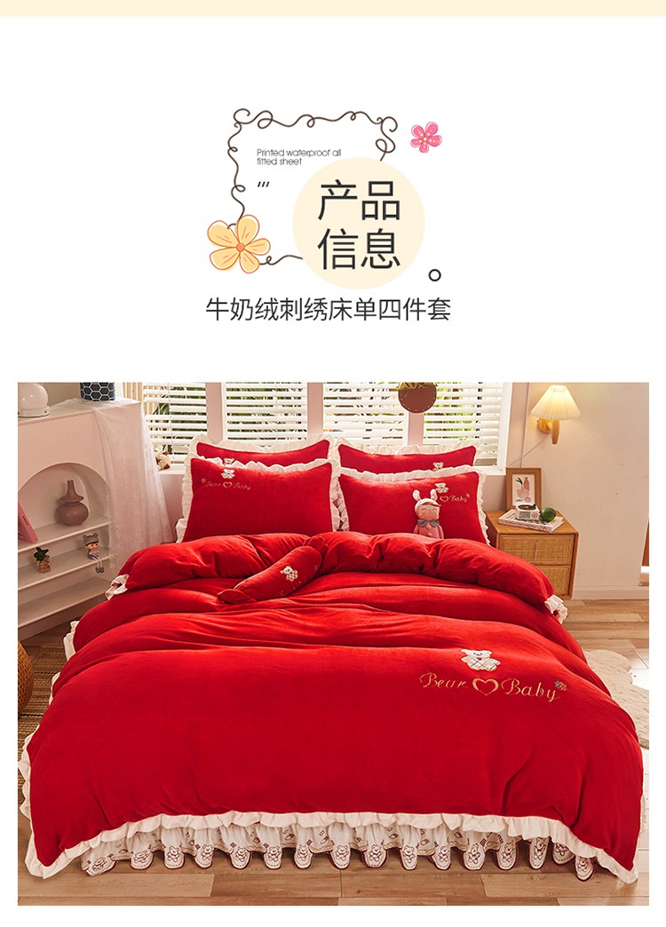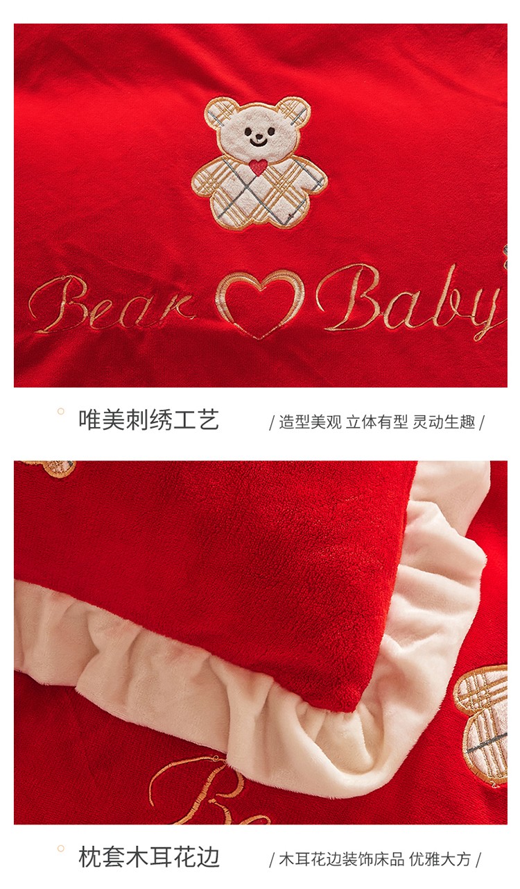 商品名称:宜凡家纺 2021新款牛奶绒绣花熊床单四件套 可爱熊-大红