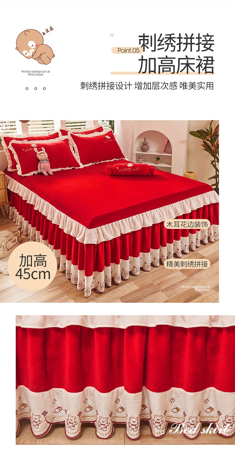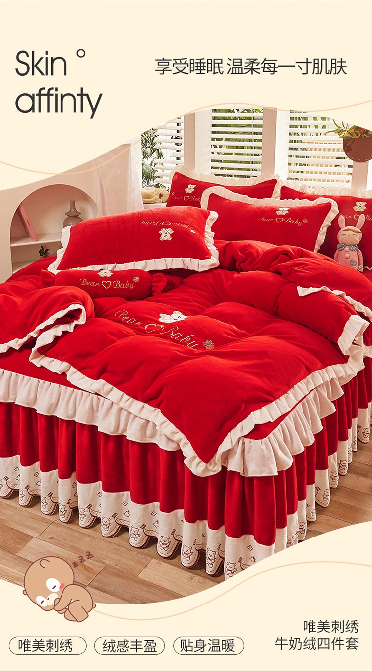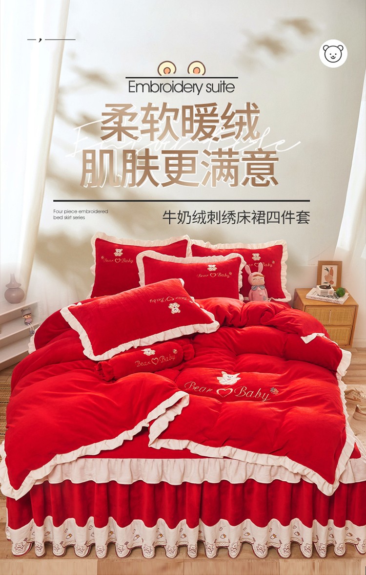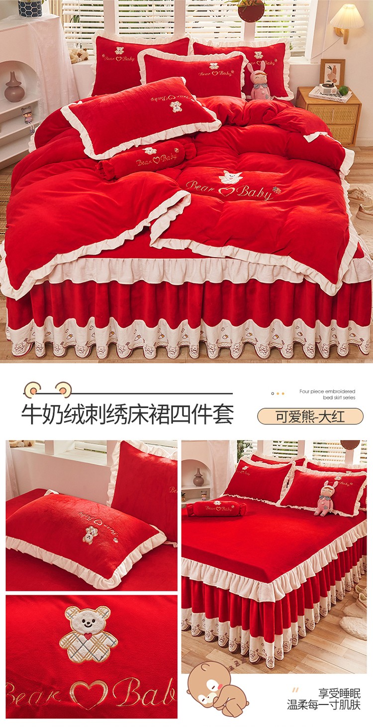 宜凡家纺 2021新款牛奶绒绣花熊床裙四件套 可爱熊-大红