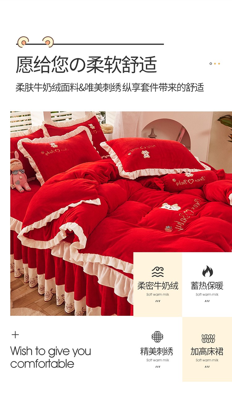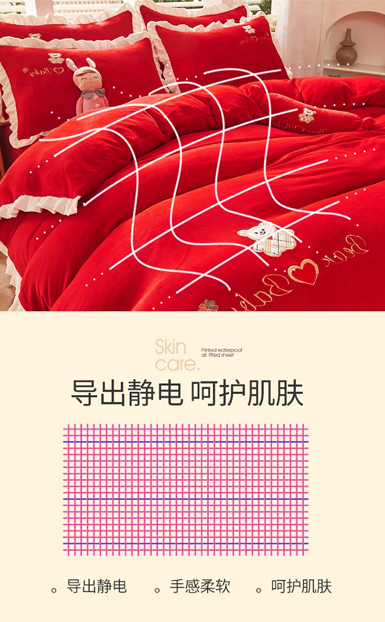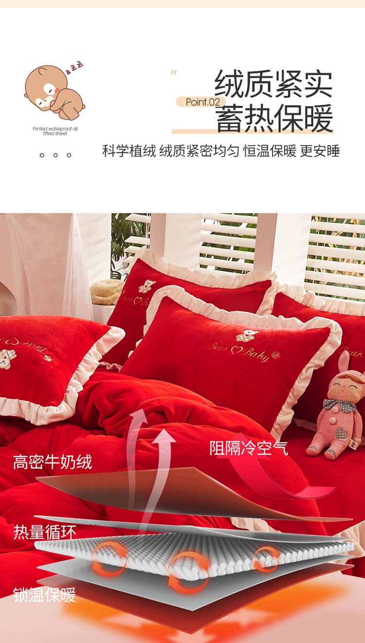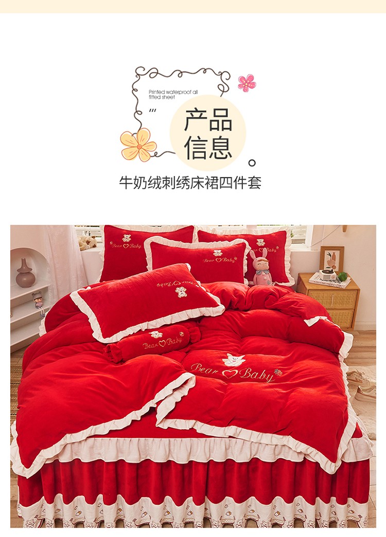 商品名称:宜凡家纺 2021新款牛奶绒绣花熊床裙四件套 可爱熊-大红