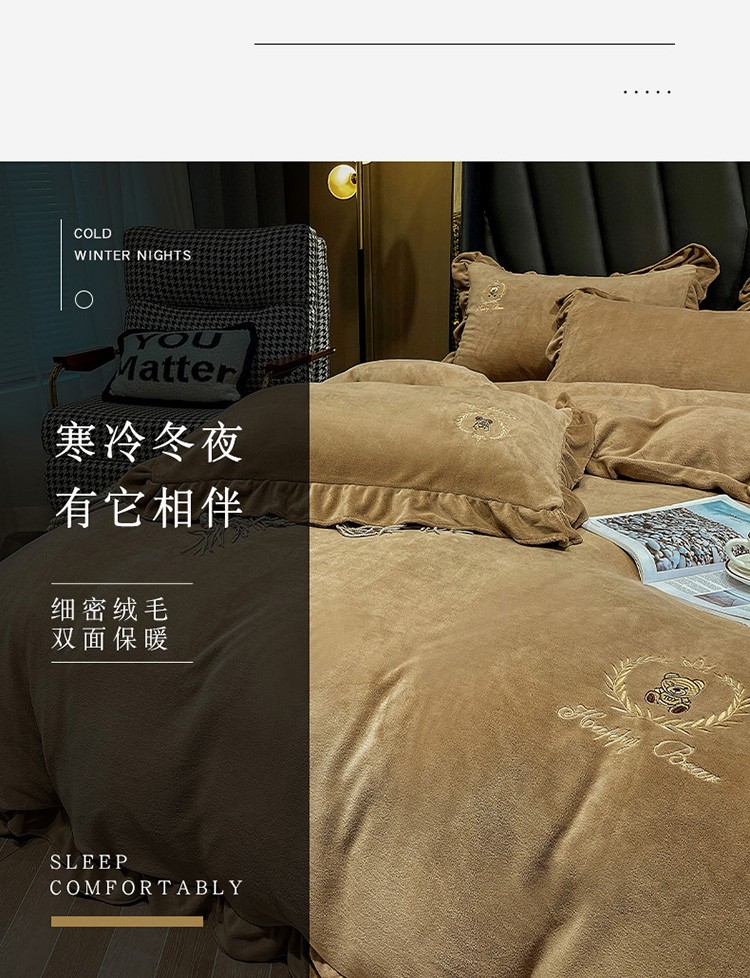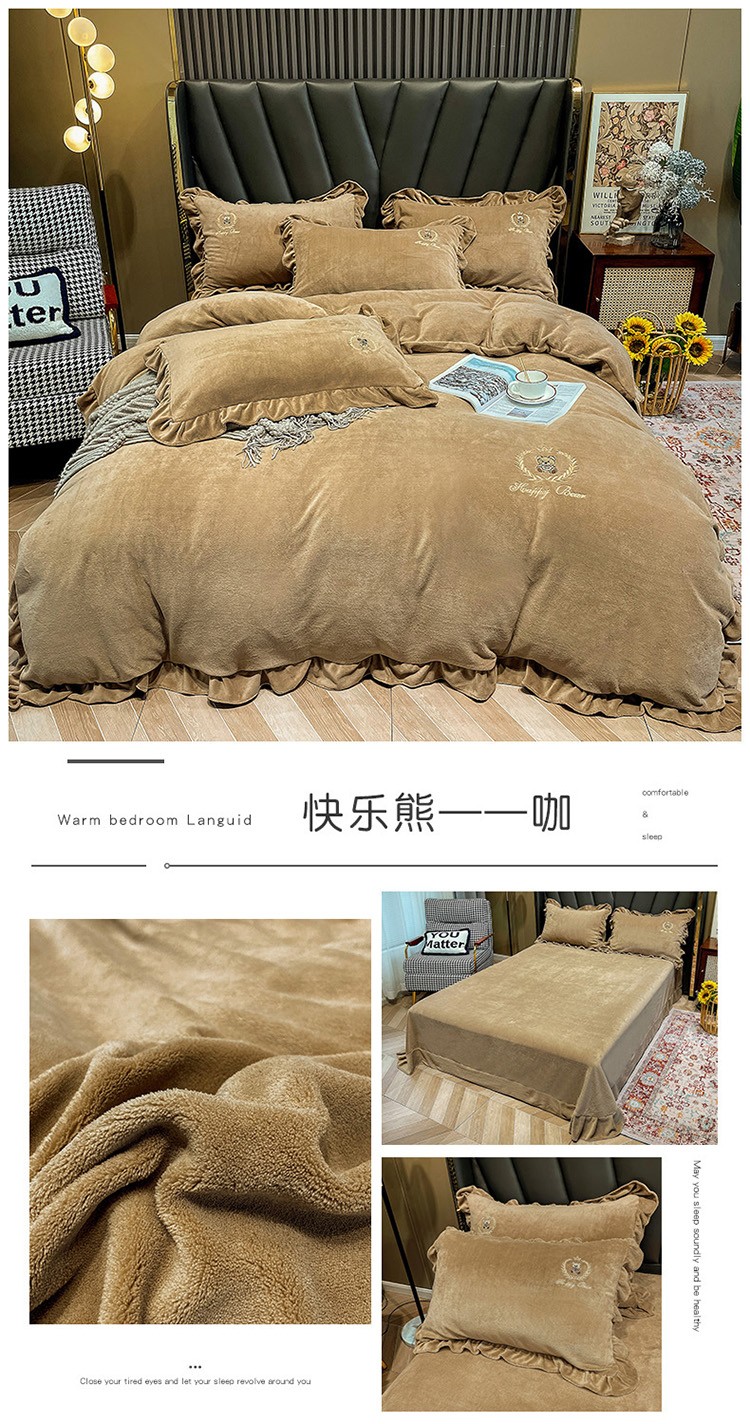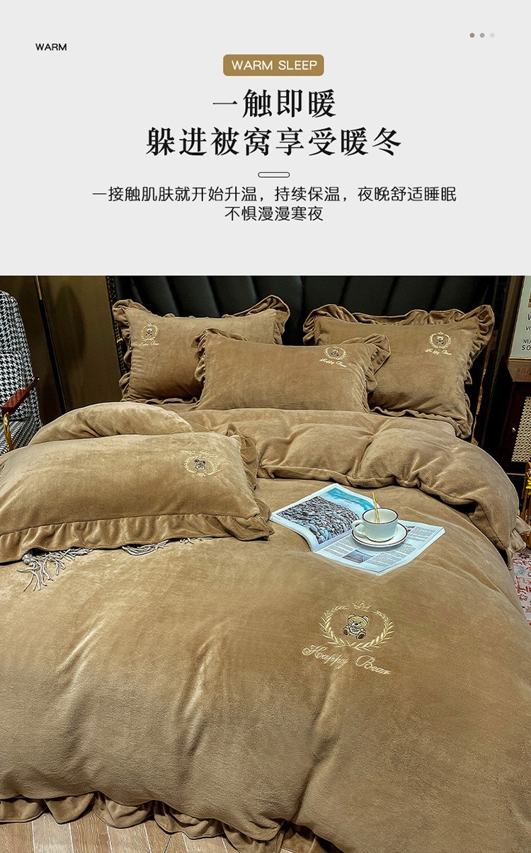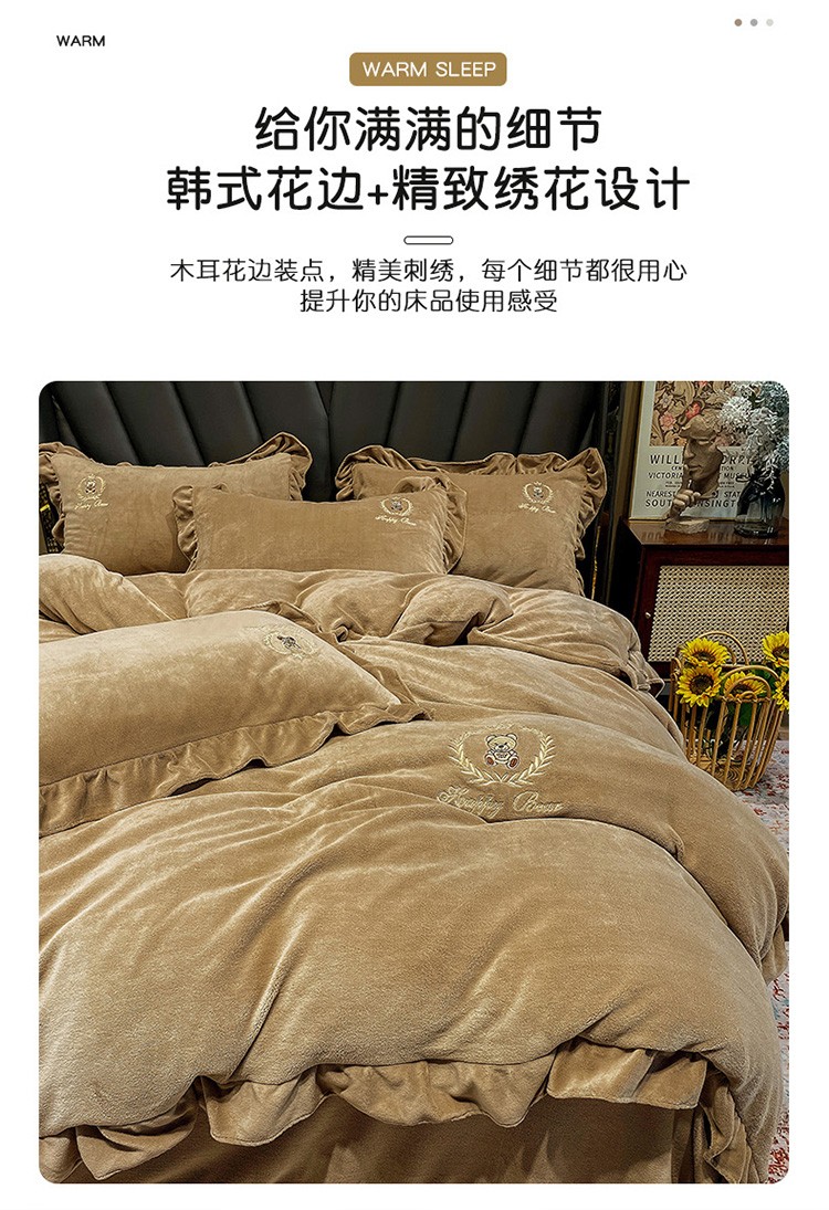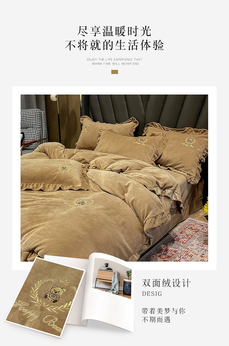 忆生活 2021新款韩版纯色牛奶绒刺绣四件套 快乐熊-咖