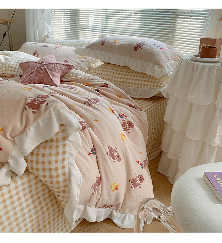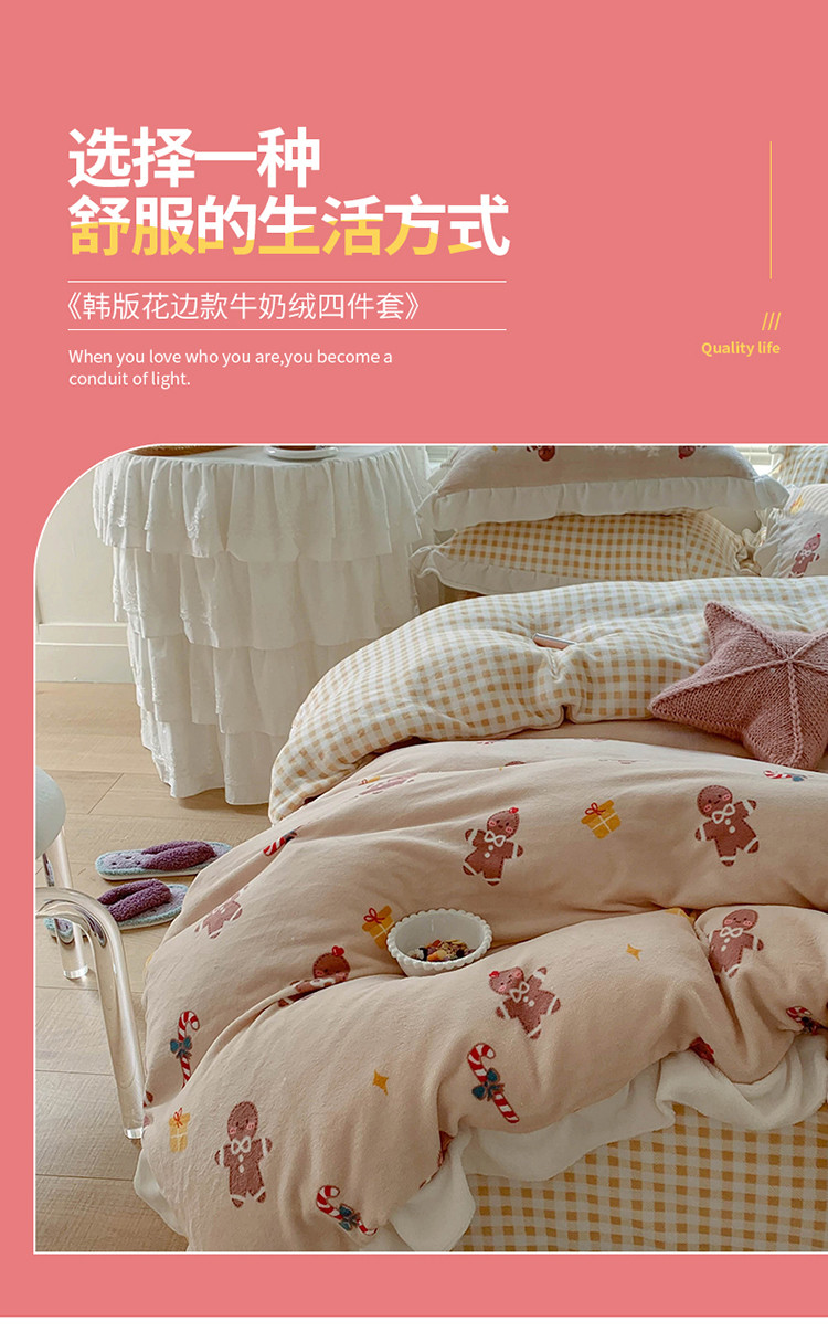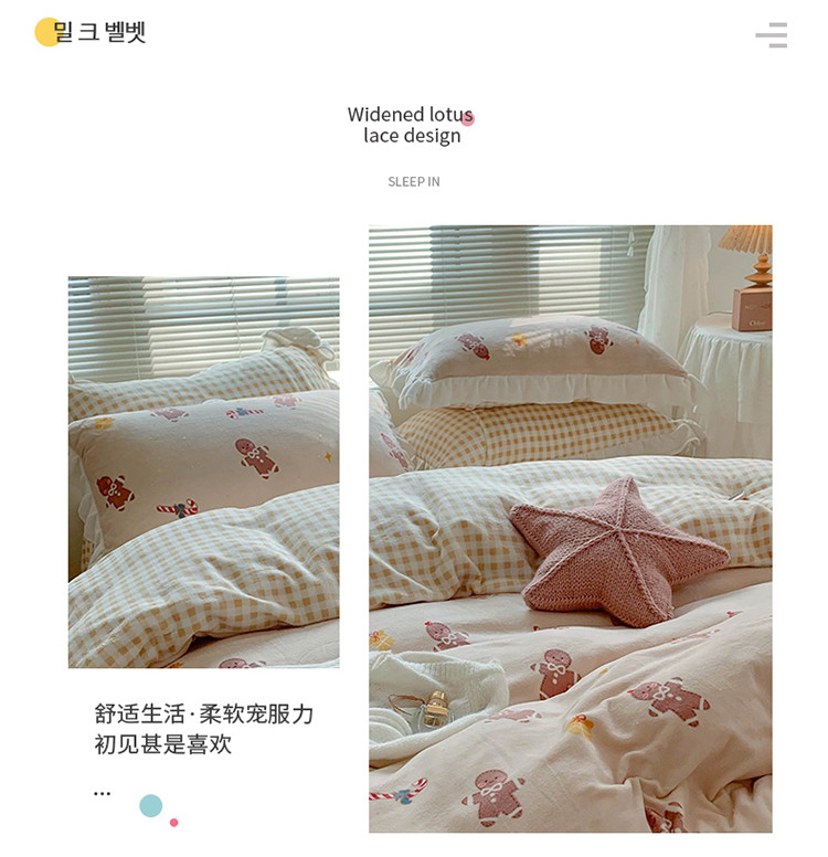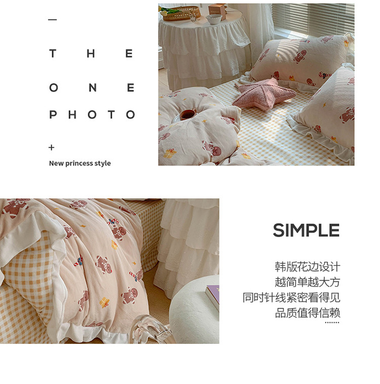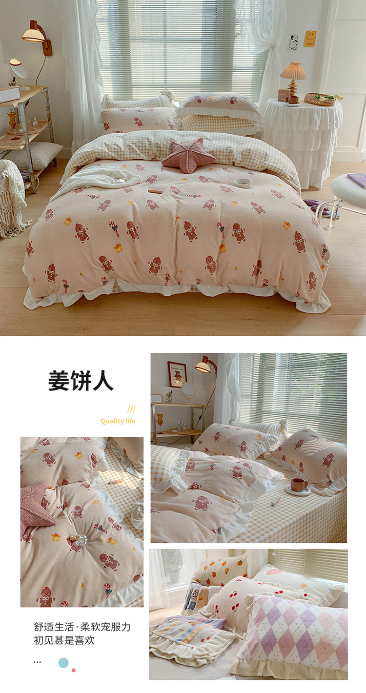 眠屿家纺2021新款韩版ins牛奶绒花边款四件套 姜饼人
