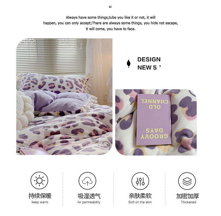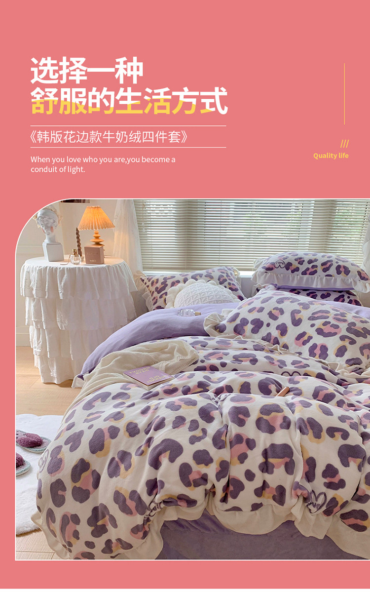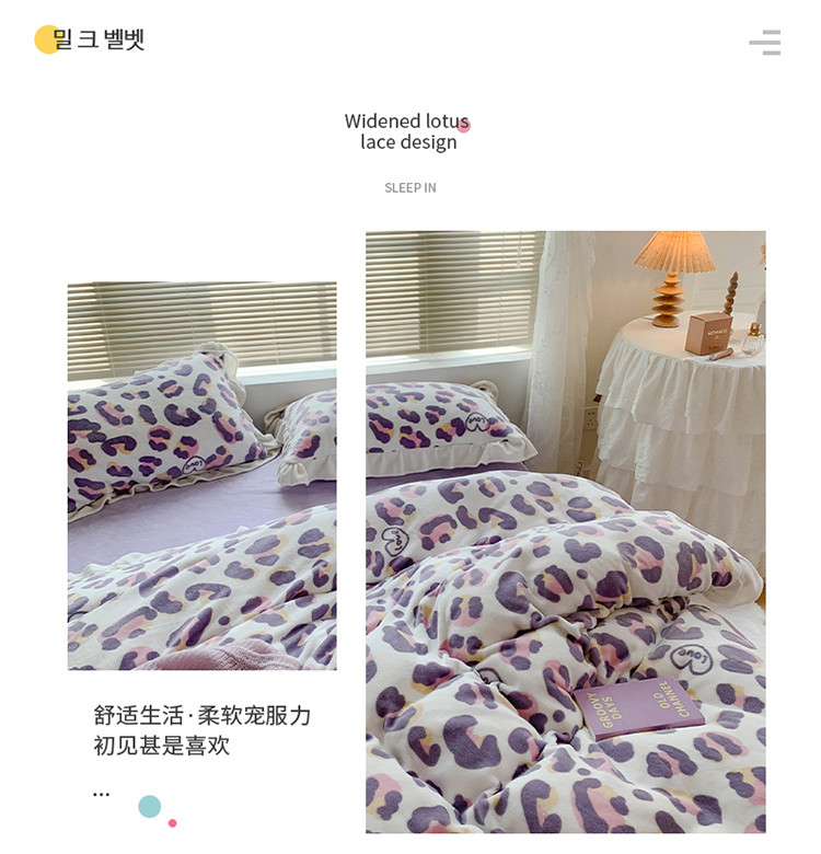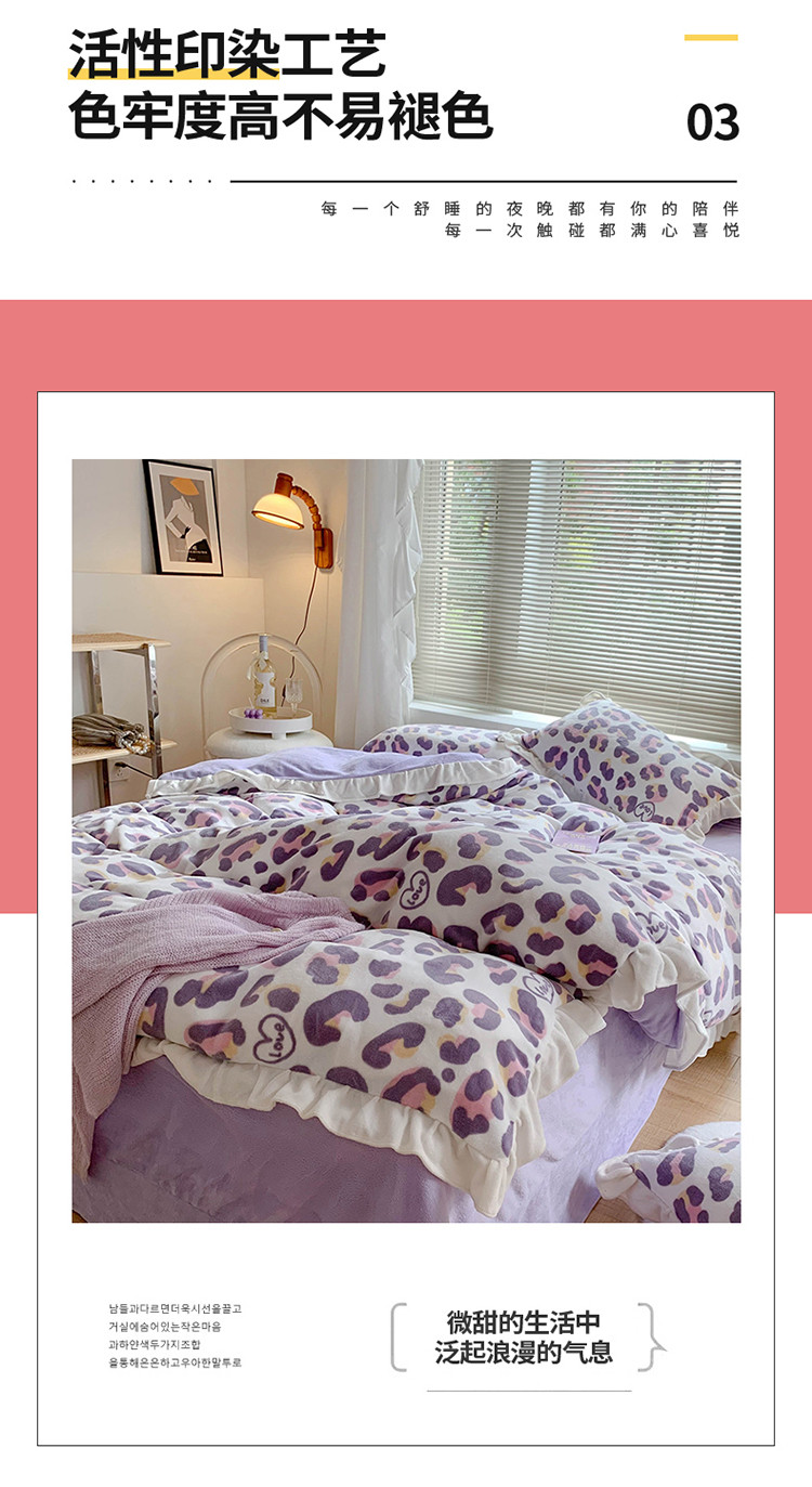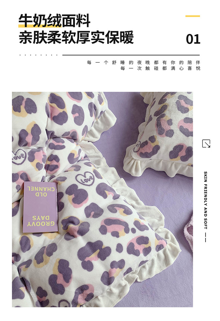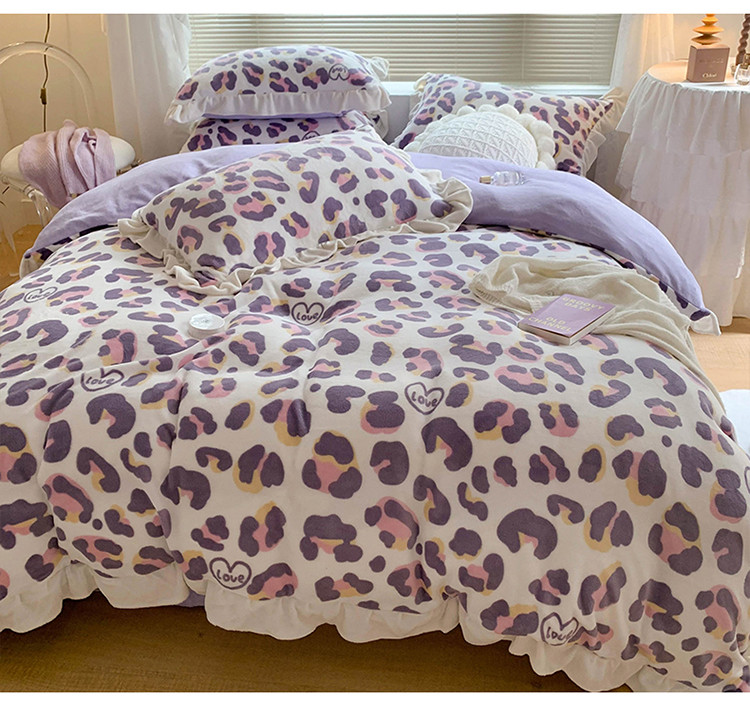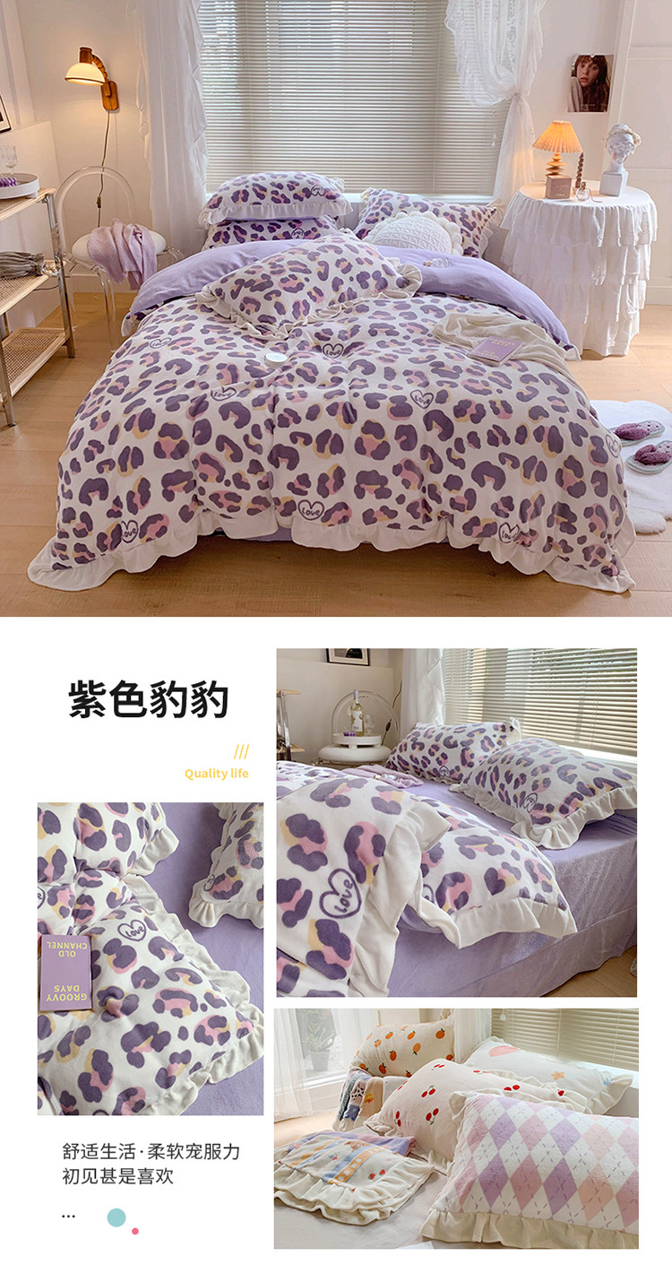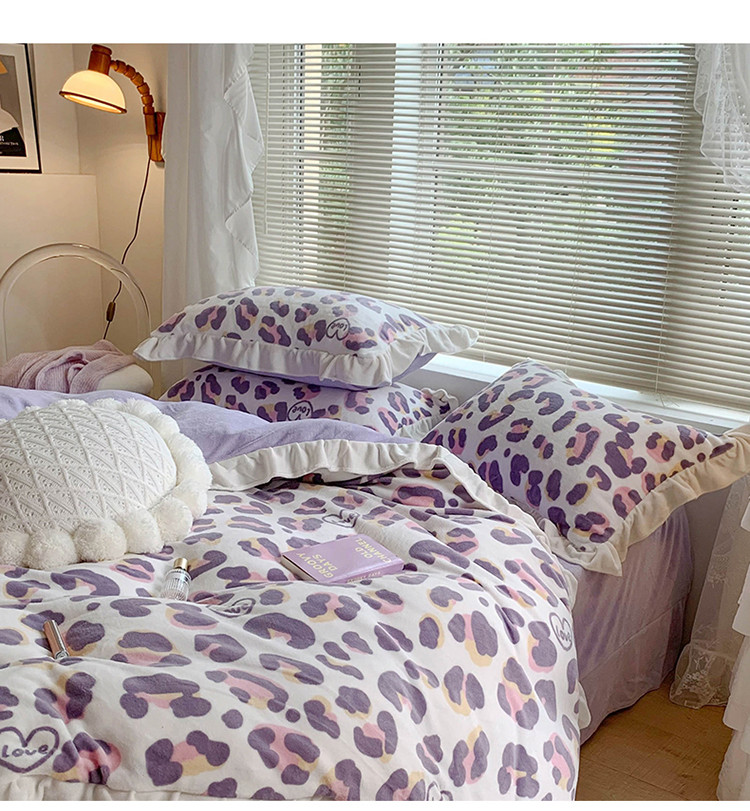 眠屿家纺2021新款韩版ins牛奶绒花边款四件套 紫色豹豹