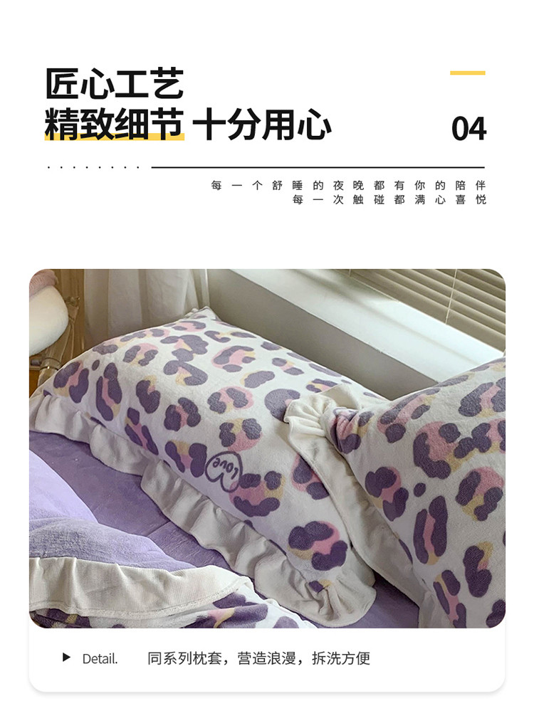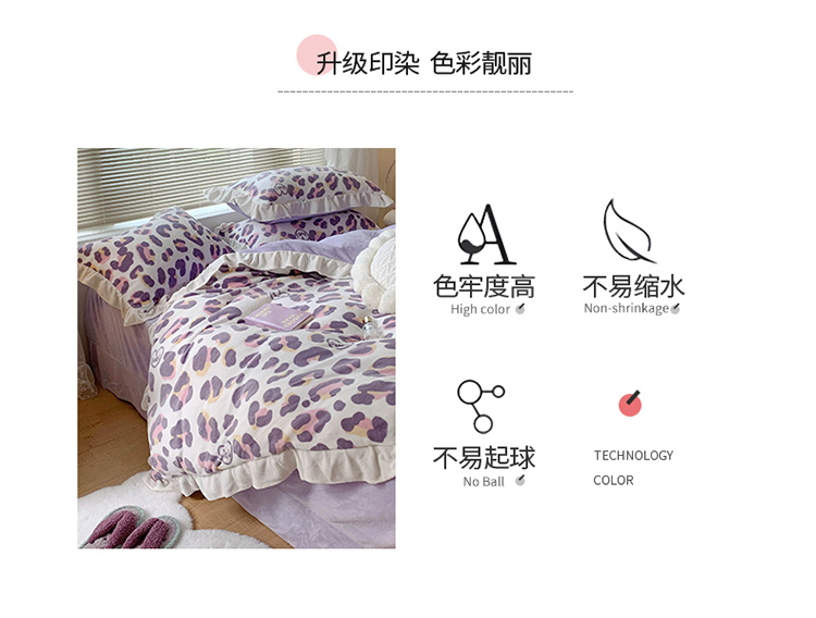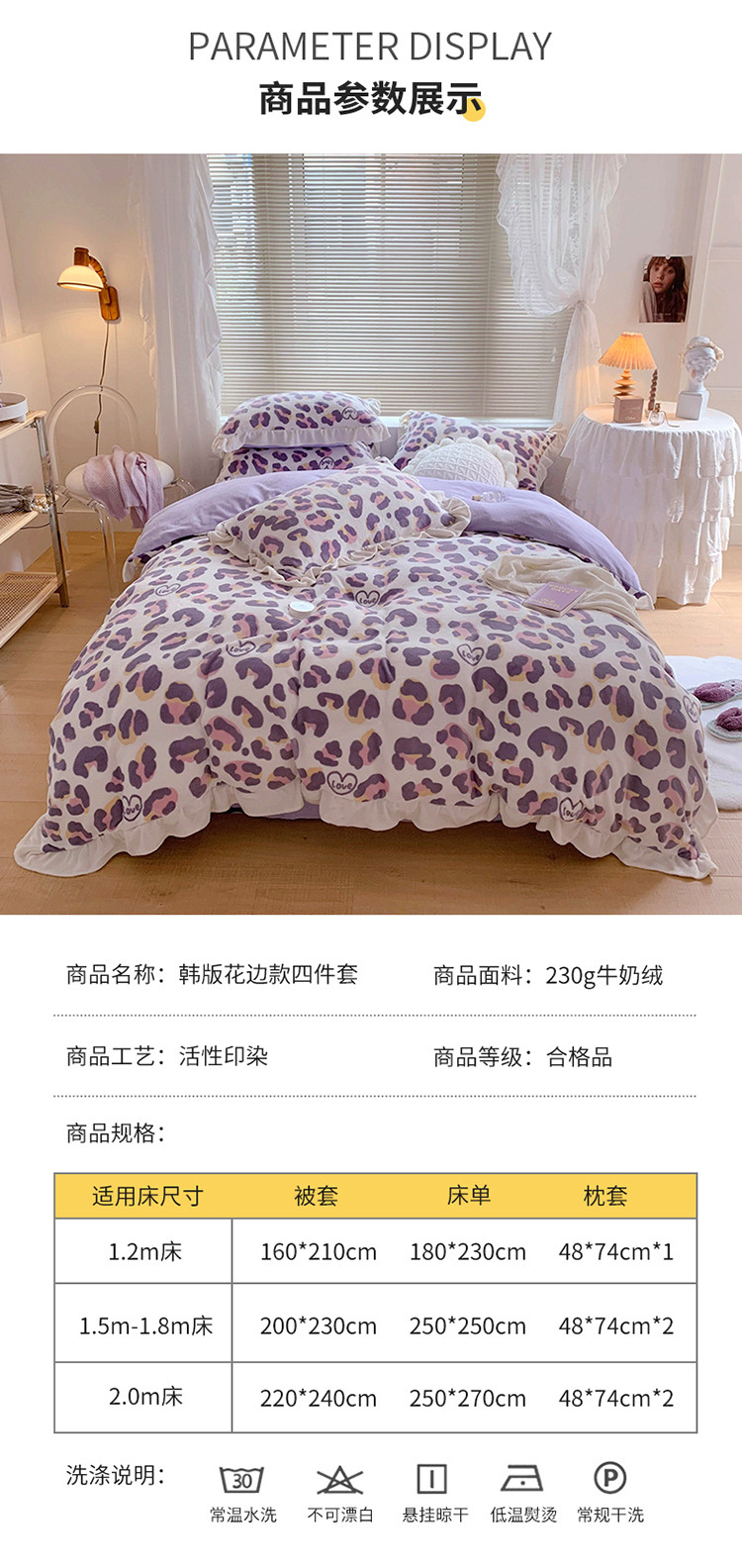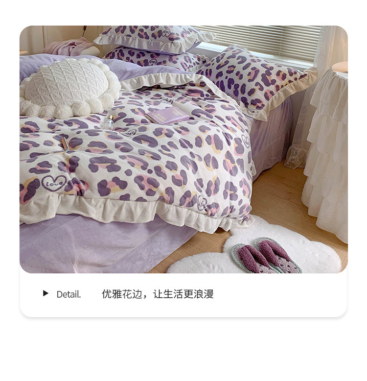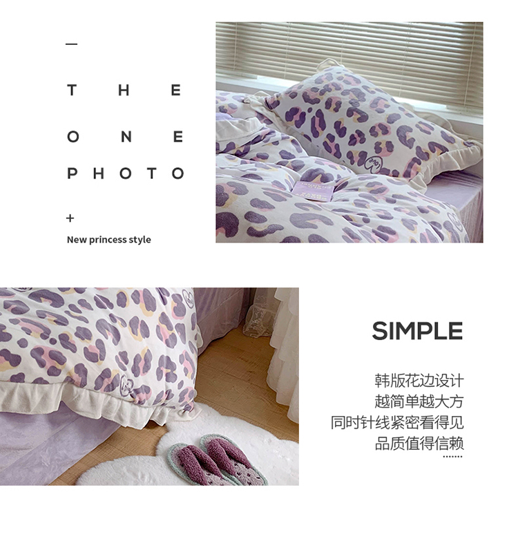 商品名称:眠屿家纺2021新款韩版ins牛奶绒花边款四件套 紫色豹豹