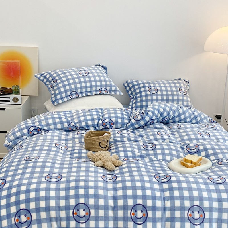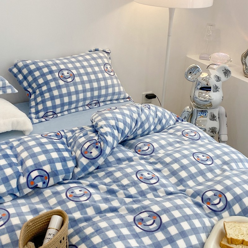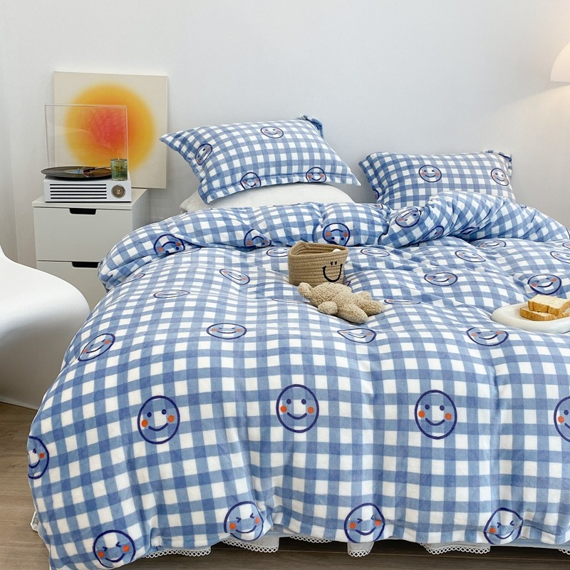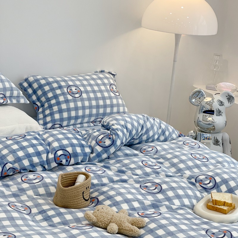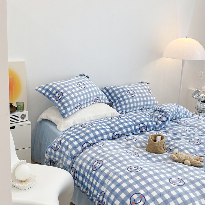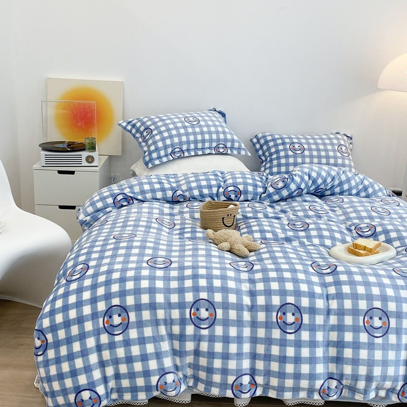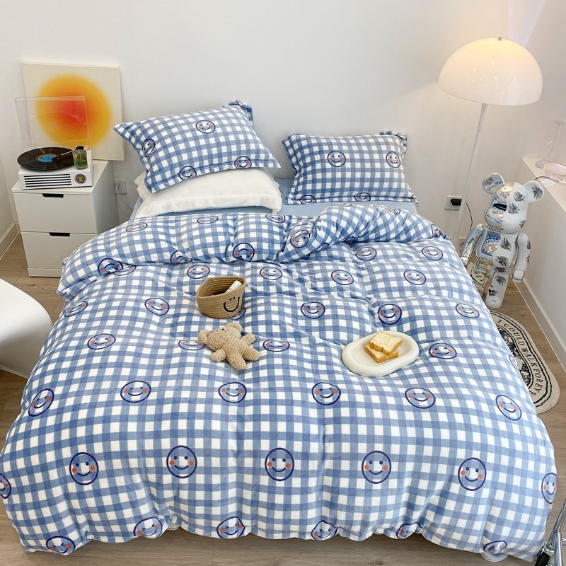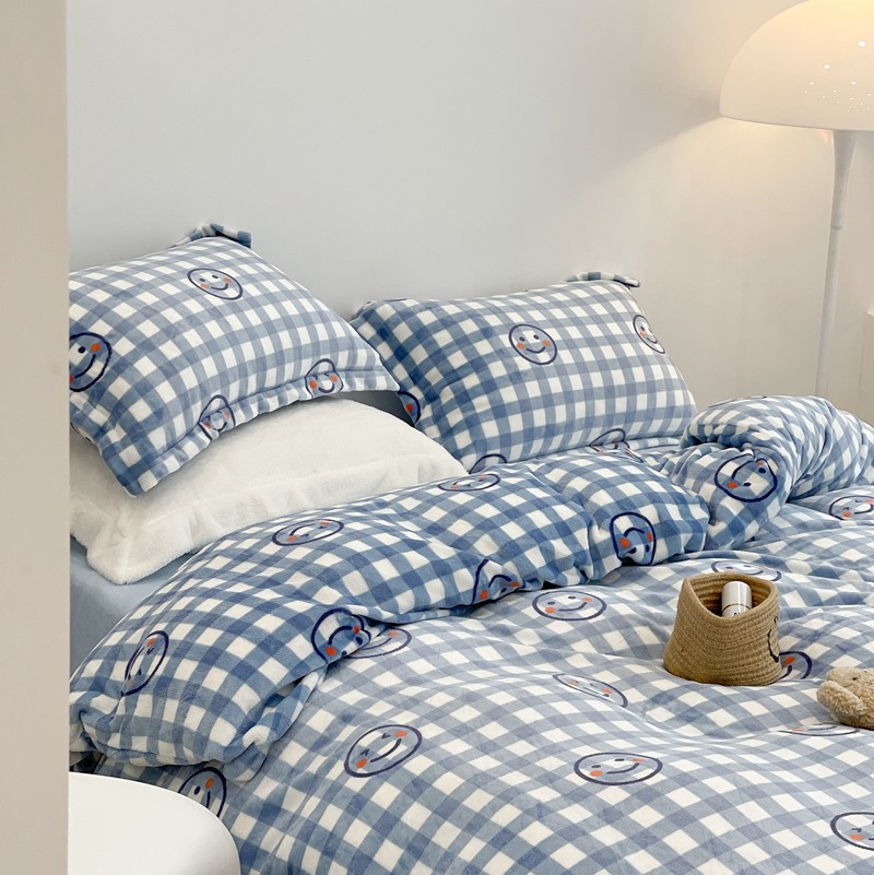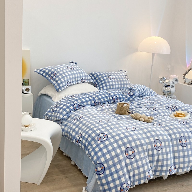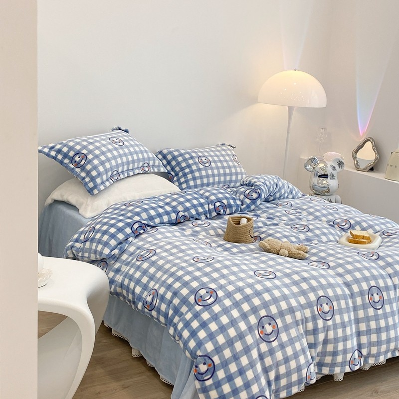 昔可家纺 2021新款牛奶绒四件套-三批 蓝格笑脸