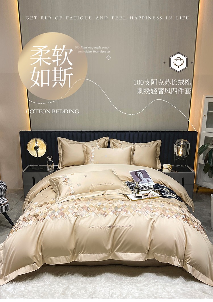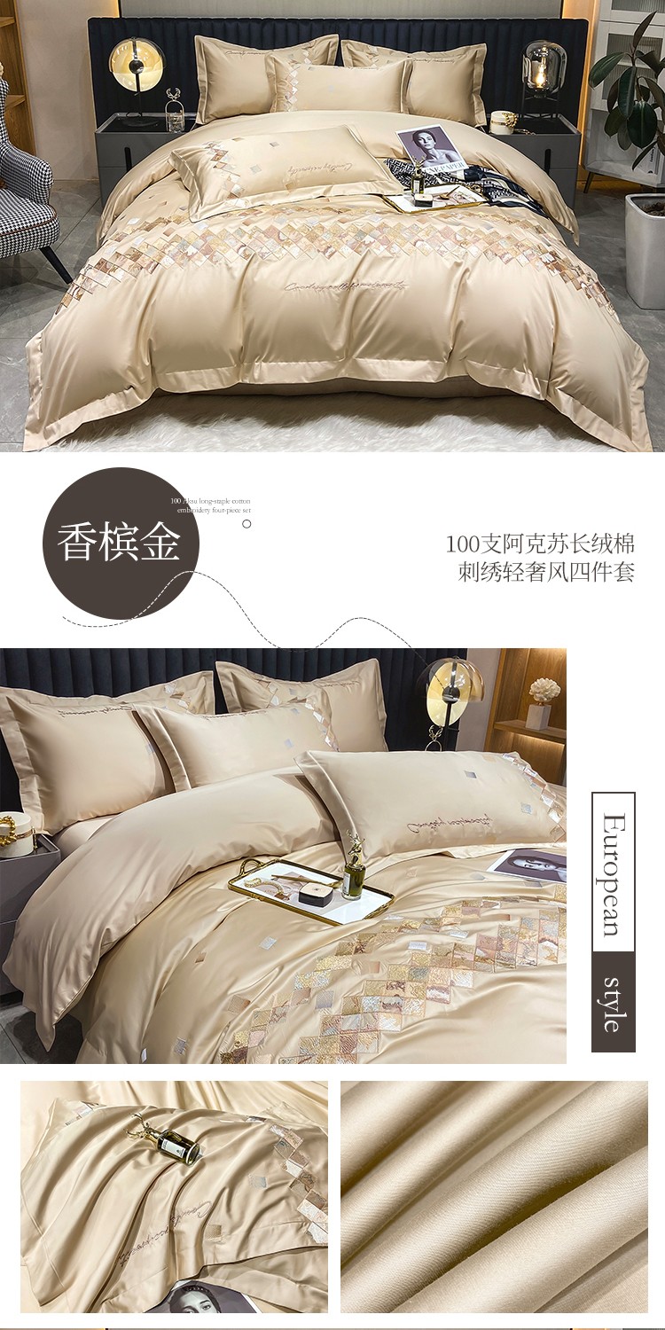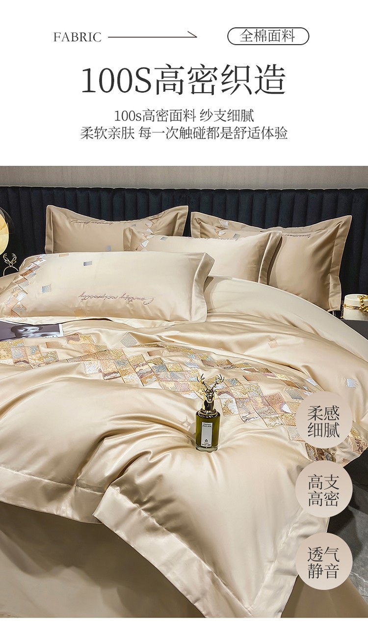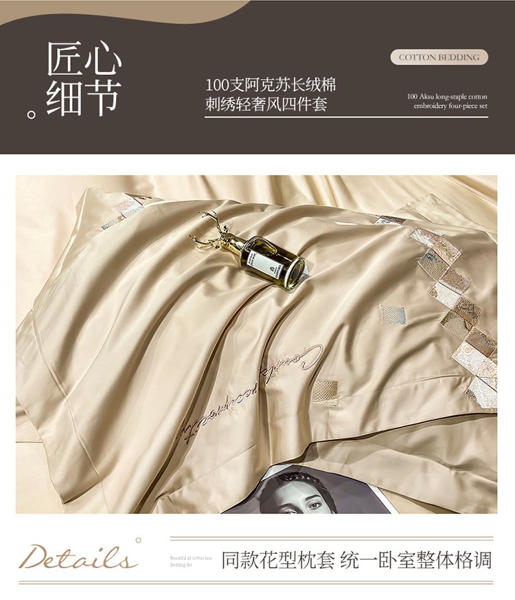 商品名称:魅都 100阿克苏长绒棉刺绣轻奢风四件套 铂金爱马香槟金