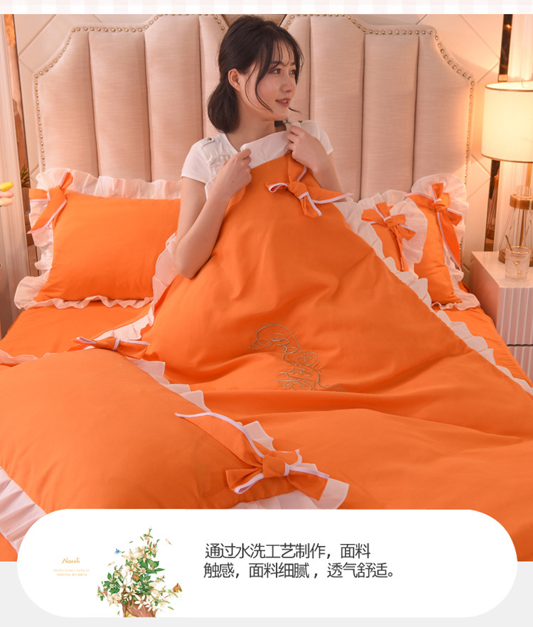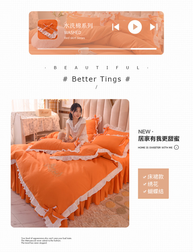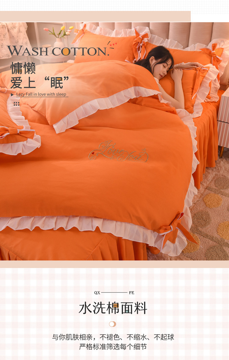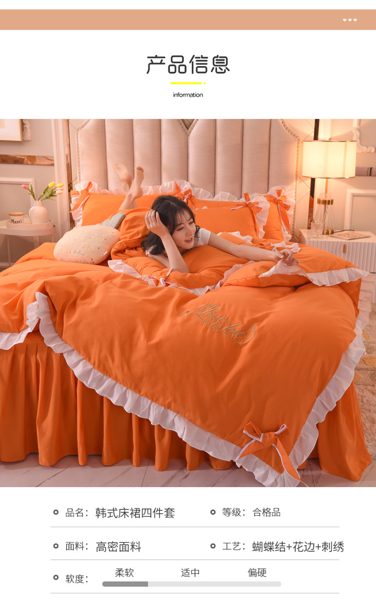 当前位置: 91家纺网 > 商品网购 > 床品套件 > 四件套 > 水洗棉四件套 > 欧冠 2022新款潮系列爱巢款床裙款刺绣四件套 蜜橙