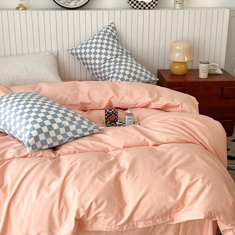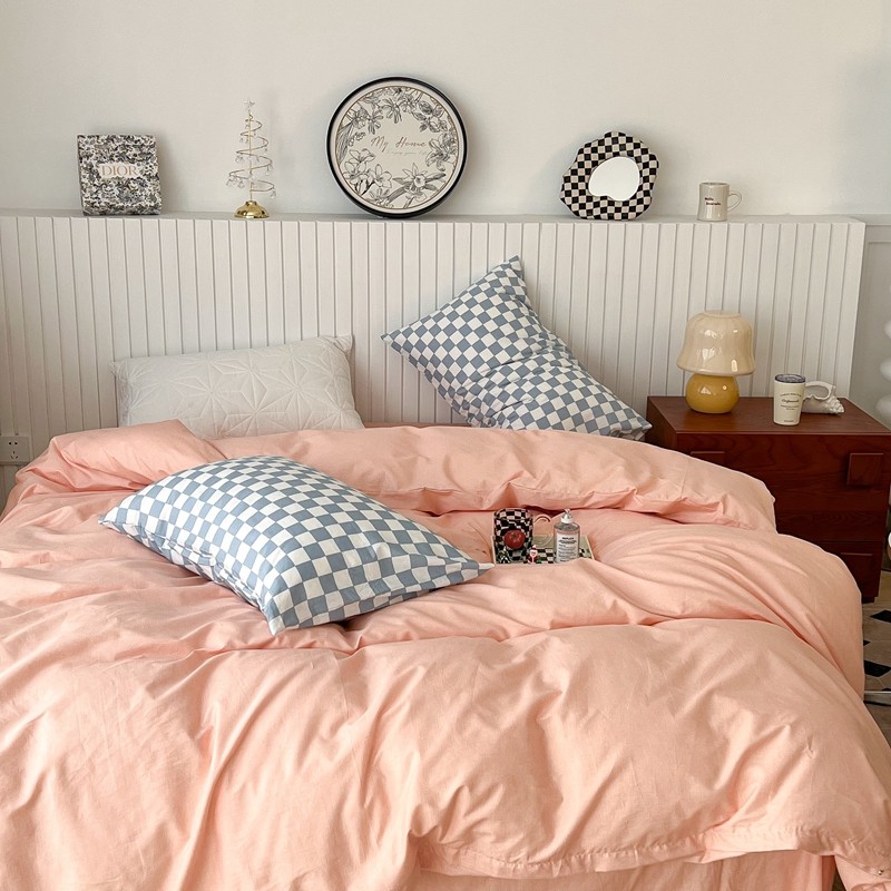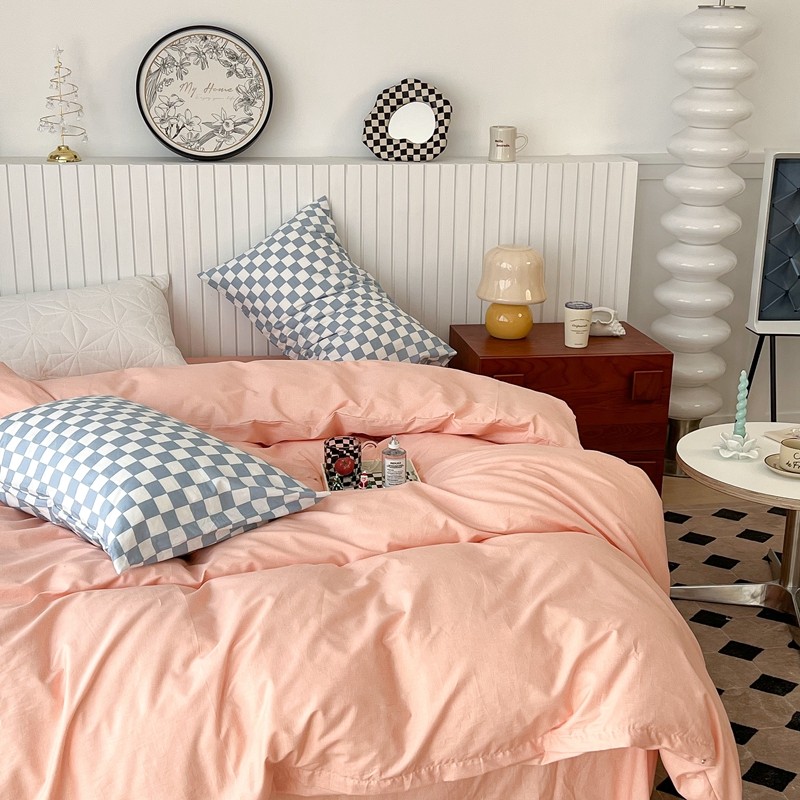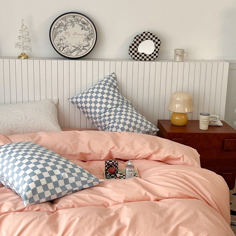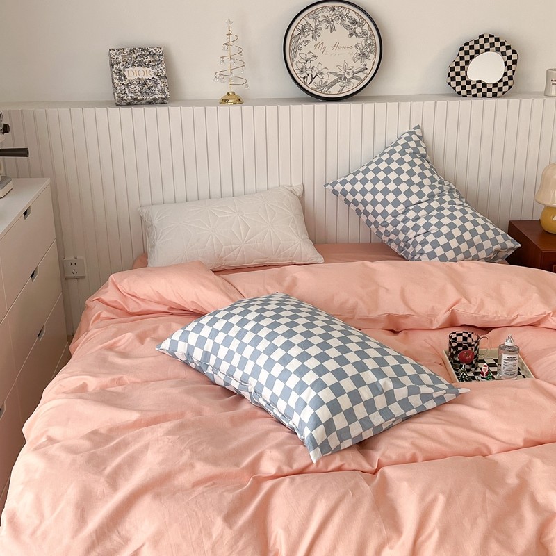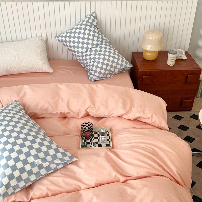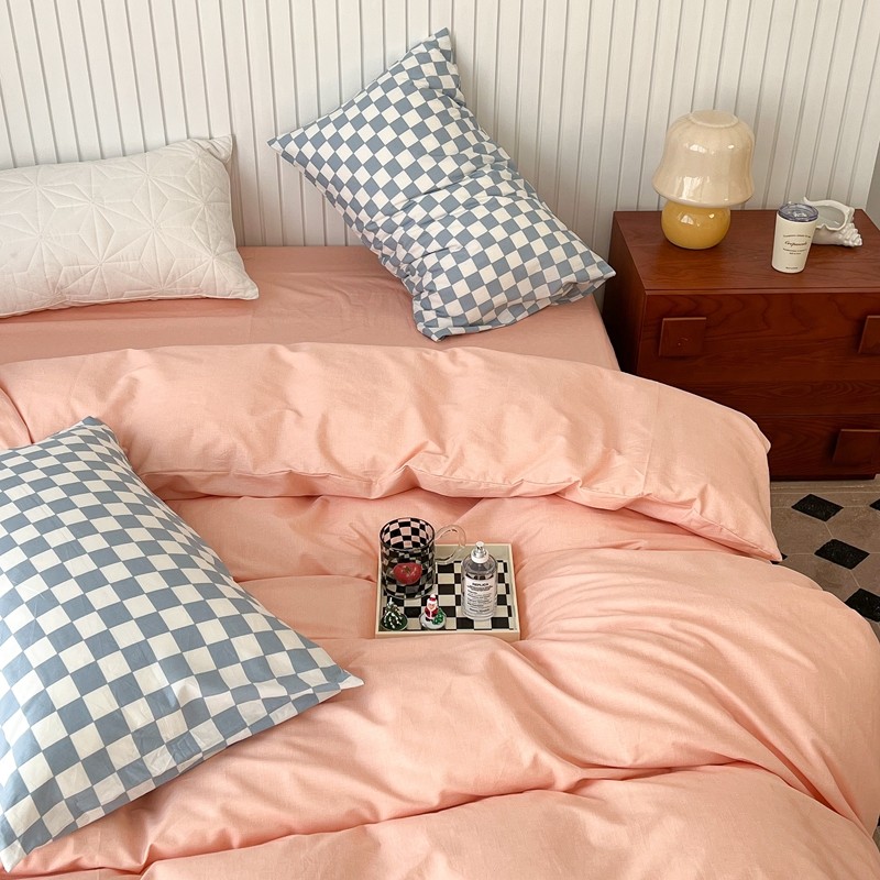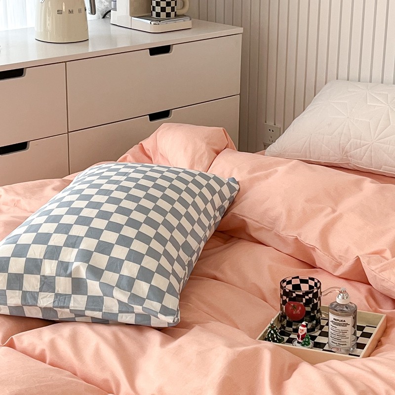 昔可2022新款混搭纯色棋盘格套件四件套 粉玉蓝棋盘