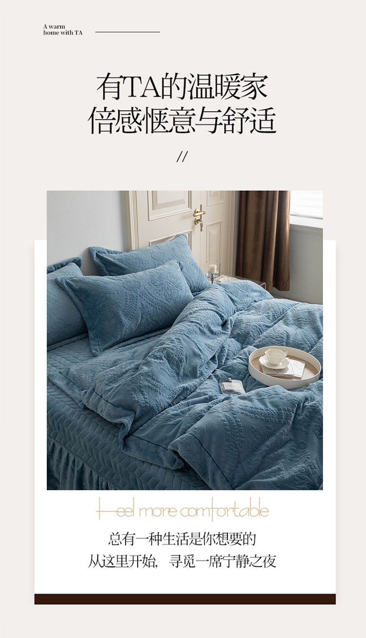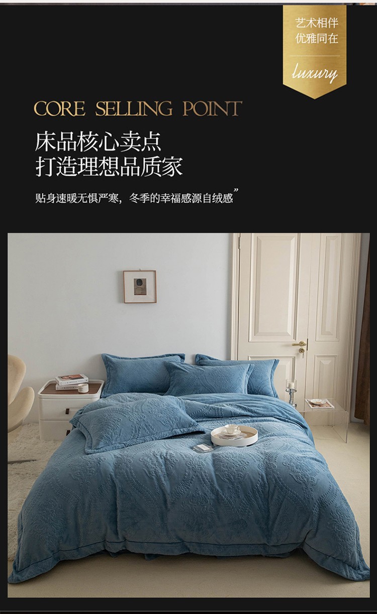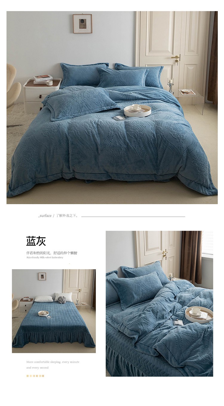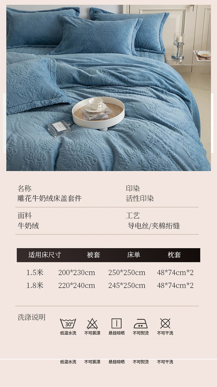 商品名称:舒梦琪 2024新款牛奶绒立体雕花床盖四件套 蓝灰