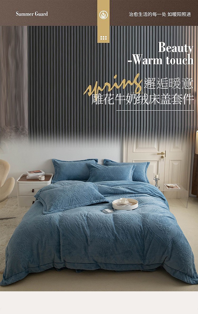 舒梦琪 2024新款牛奶绒立体雕花床盖四件套 蓝灰