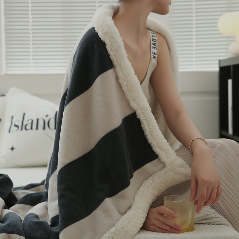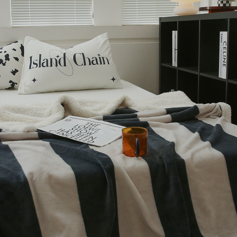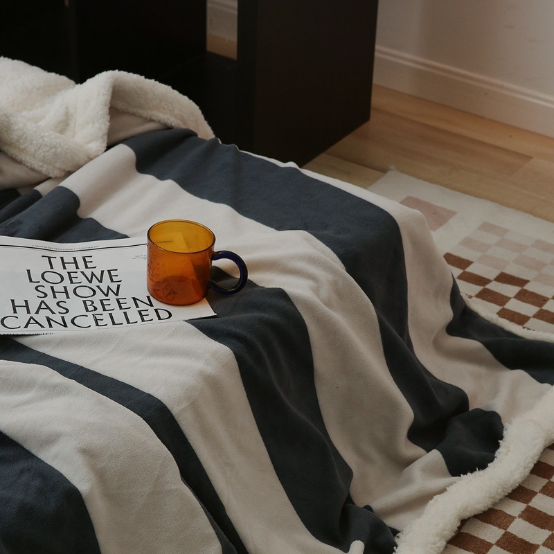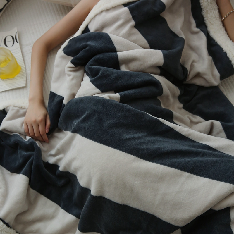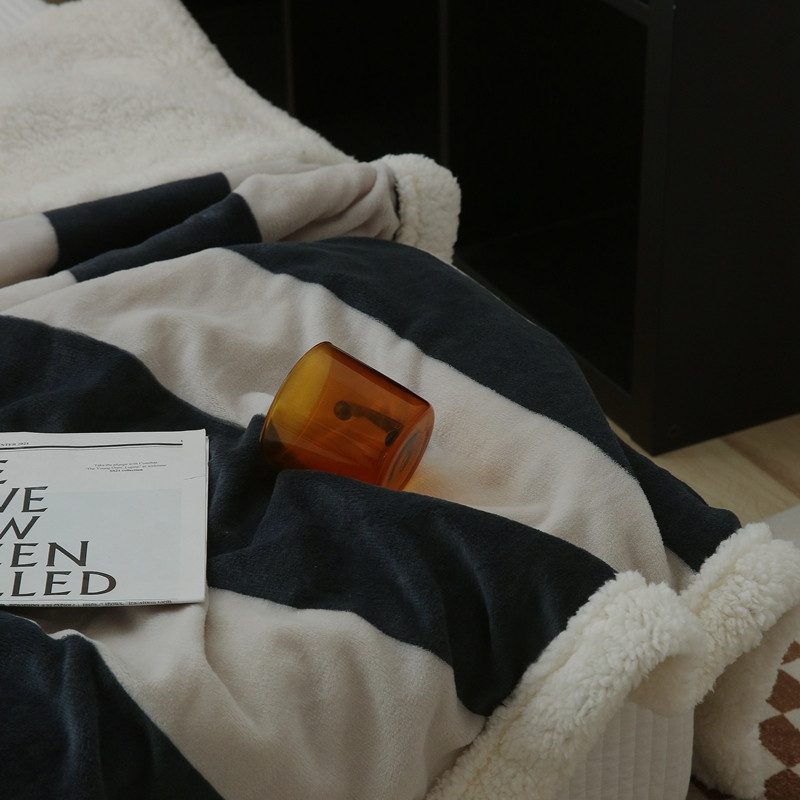 圆岛家纺 2022秋冬新品牛奶绒羊羔绒毛毯 尚黑粗条