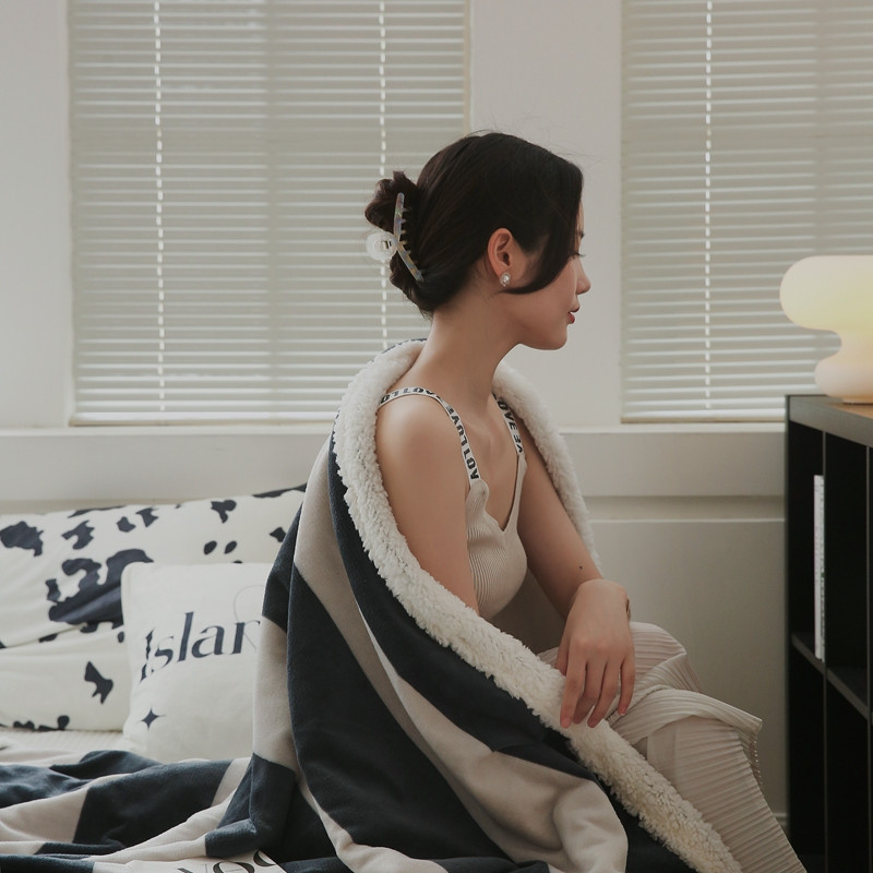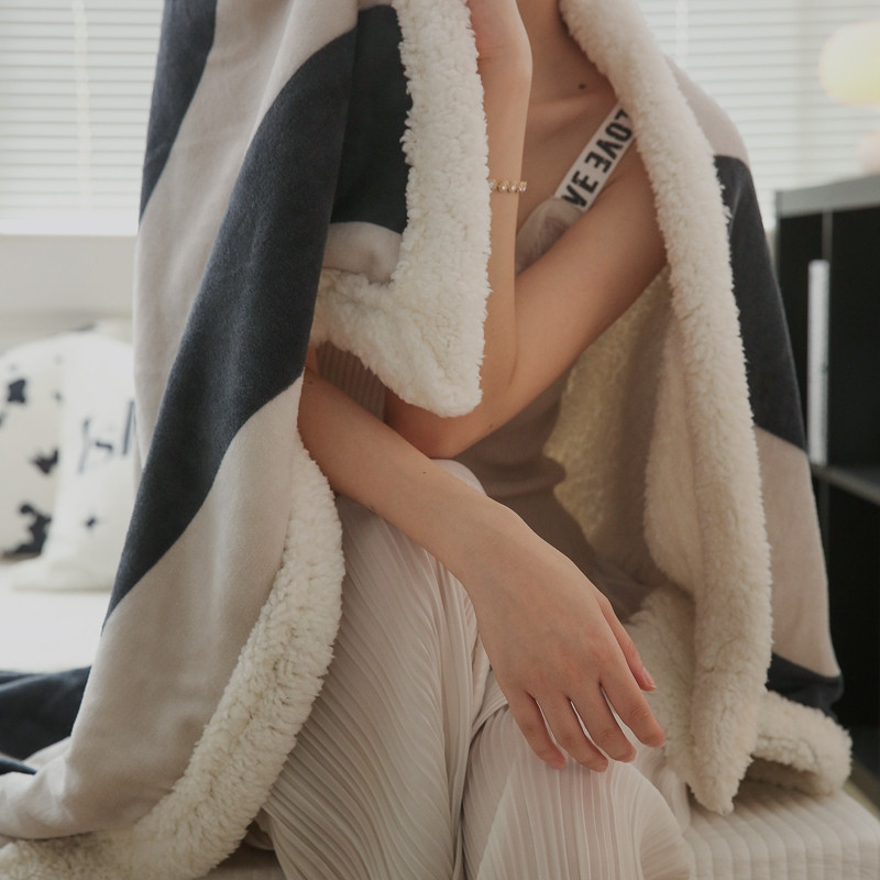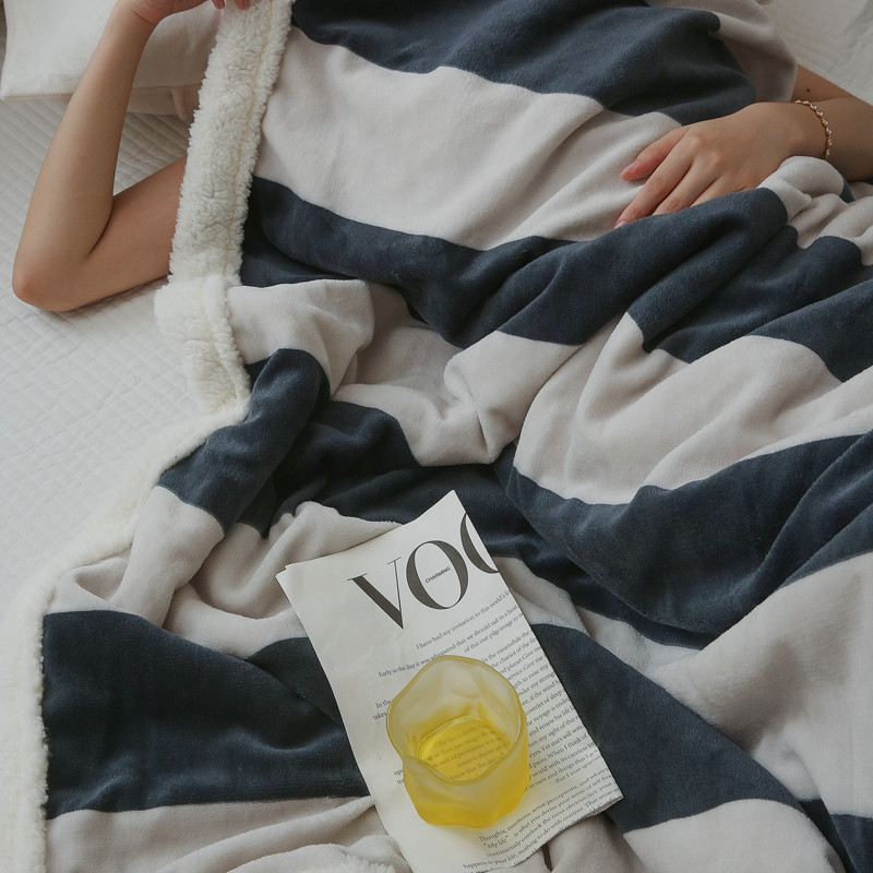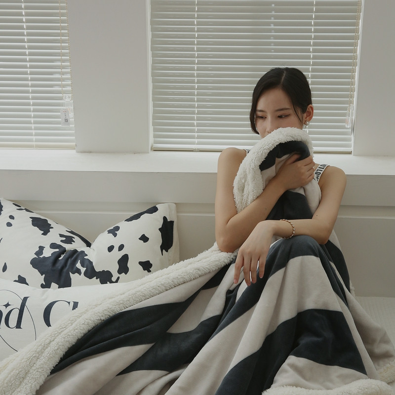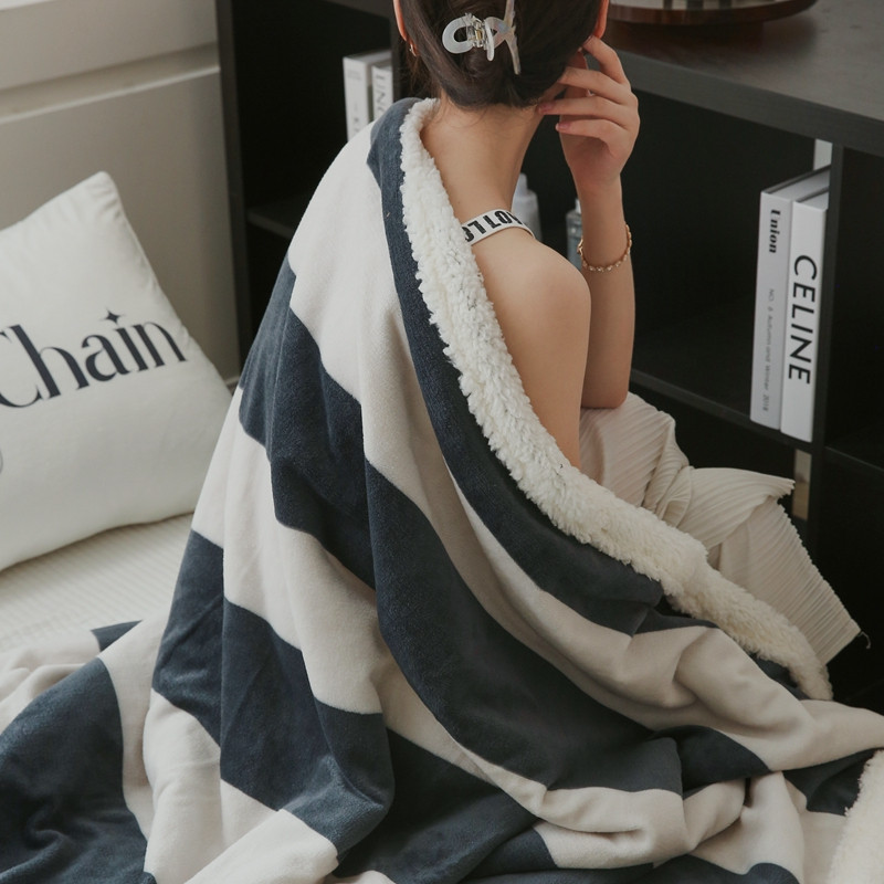 圆岛家纺 2022秋冬新品牛奶绒羊羔绒毛毯 尚黑粗条