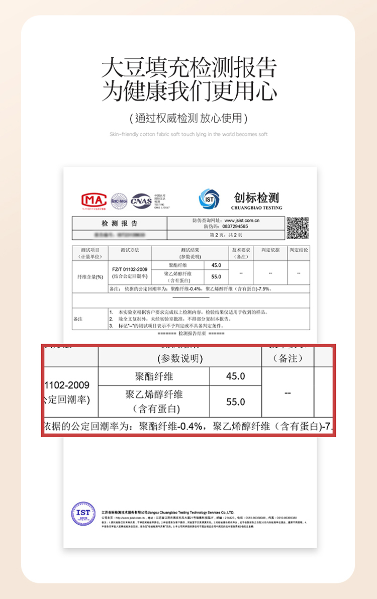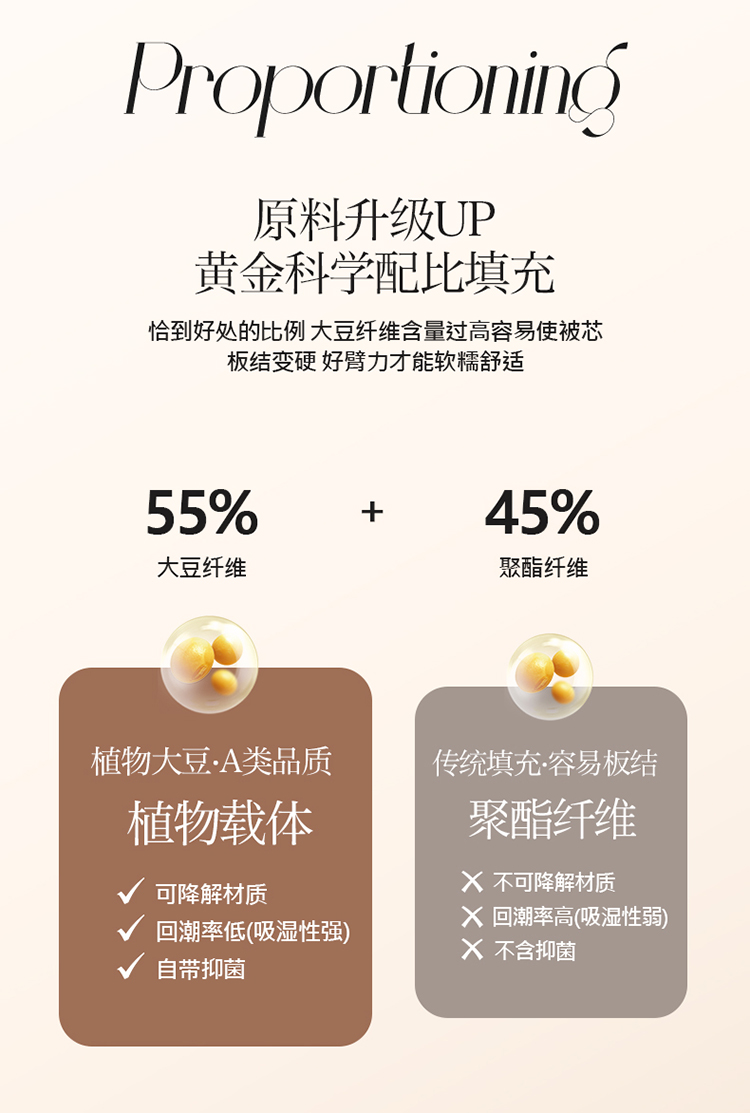 • 填充纤维种类: 大豆蛋白改性聚酯纤维